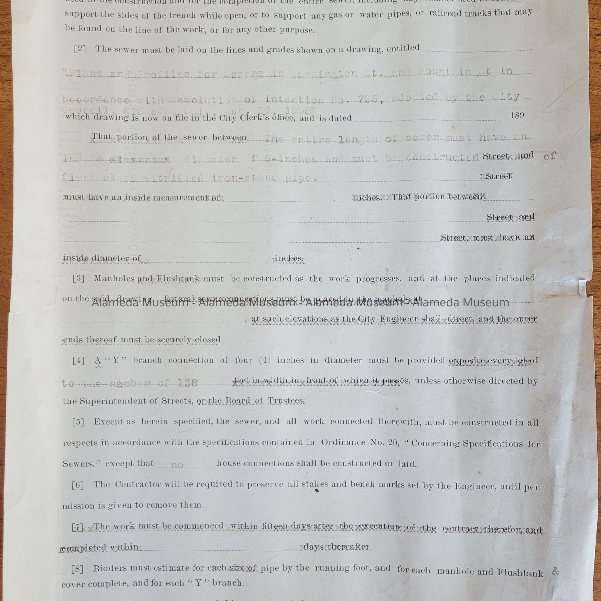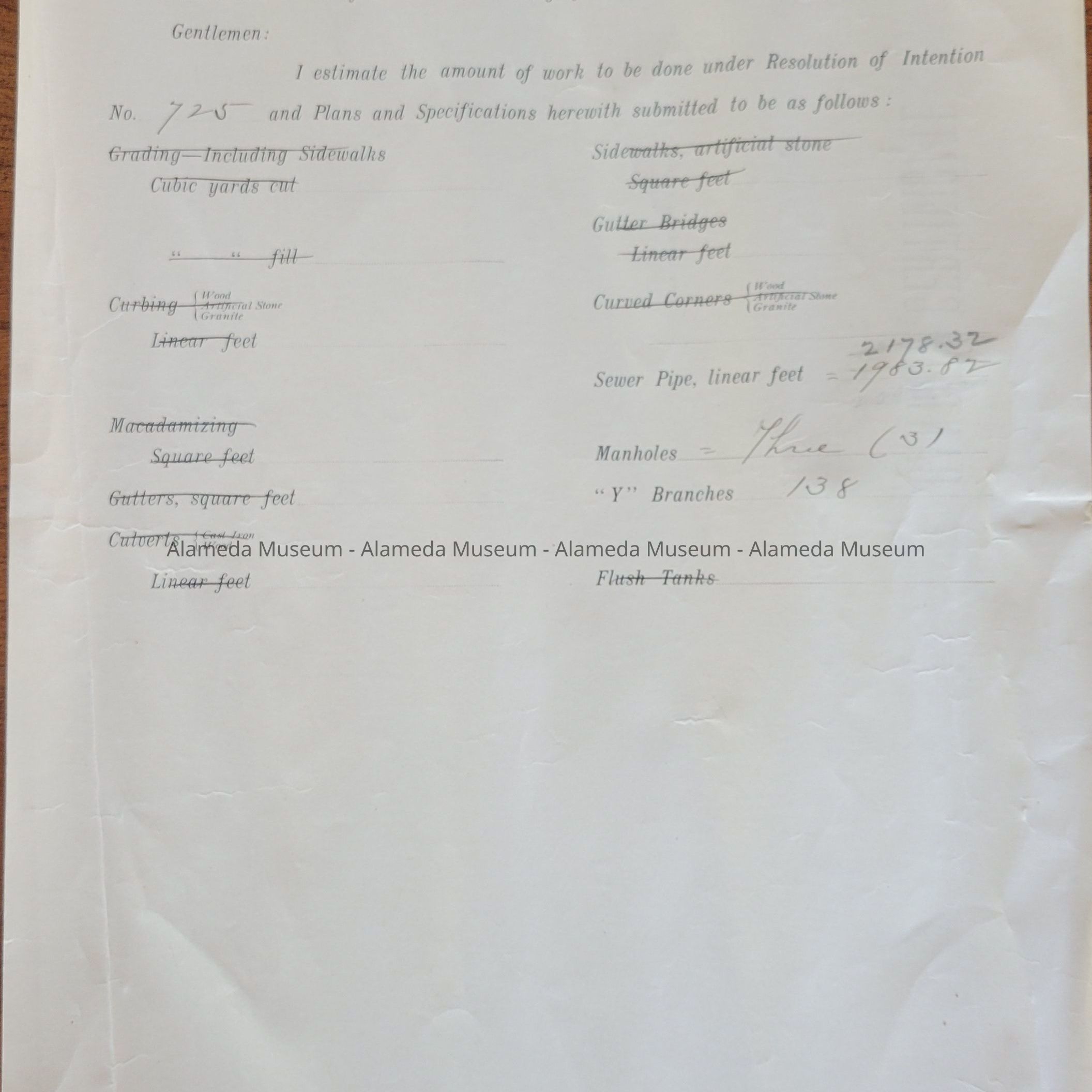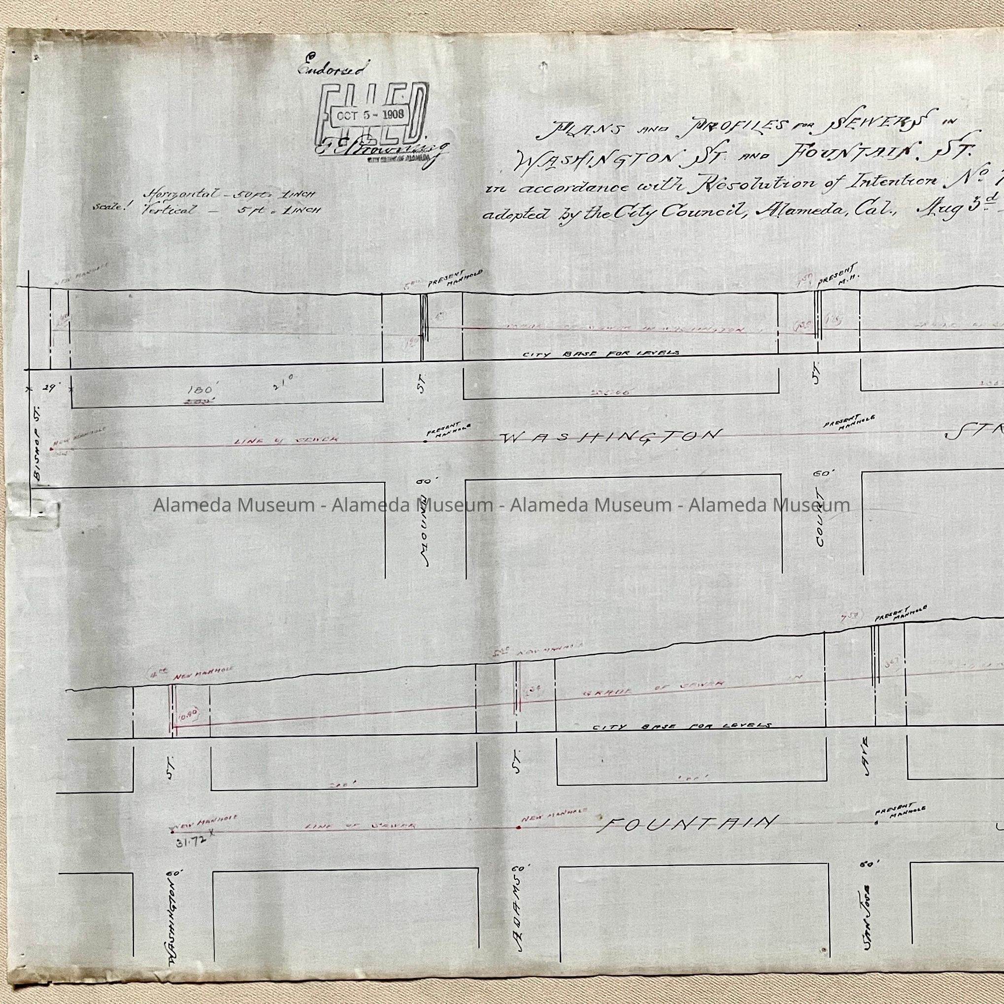 PLANS WERE ADOPTED AND FILED ON SEWERS BETWEEN WASHINGTON AVENUE AND FOUNTAIN STREET, AND VOTED BY THE CITY COUNCIL ON AUGUST 3, 1908. SIGNED BY IN CHAPMAN, CITY ENGINEER.