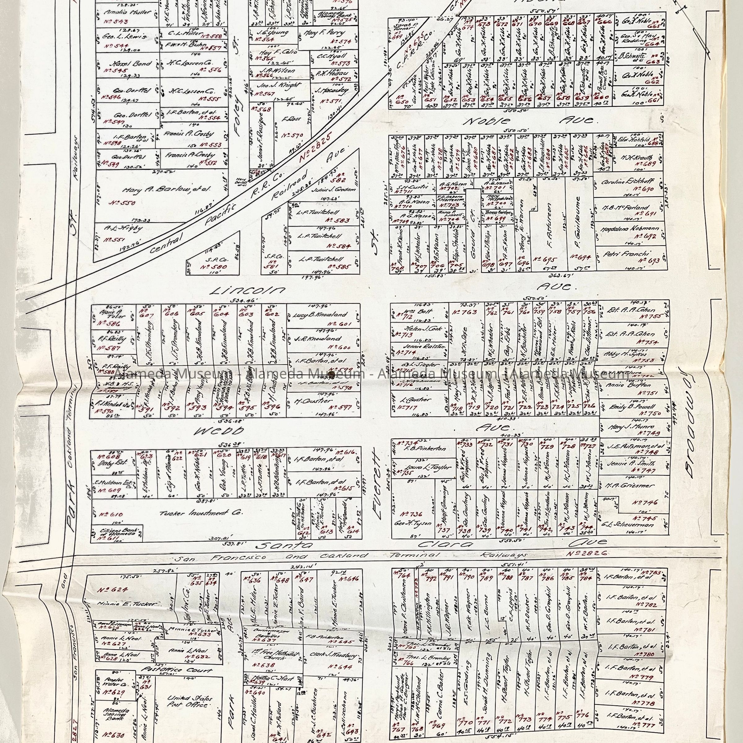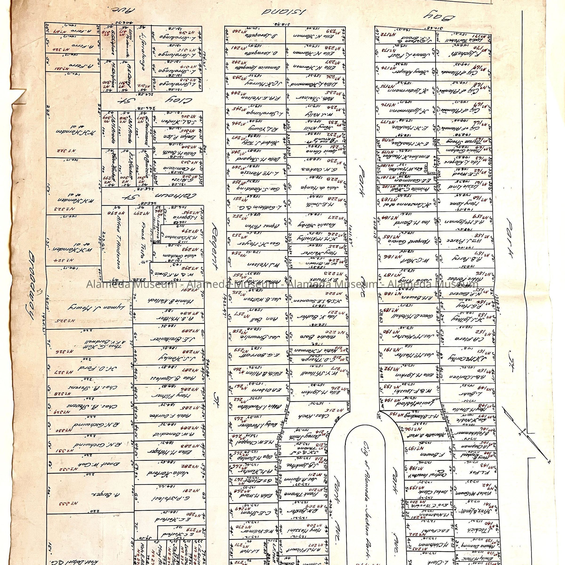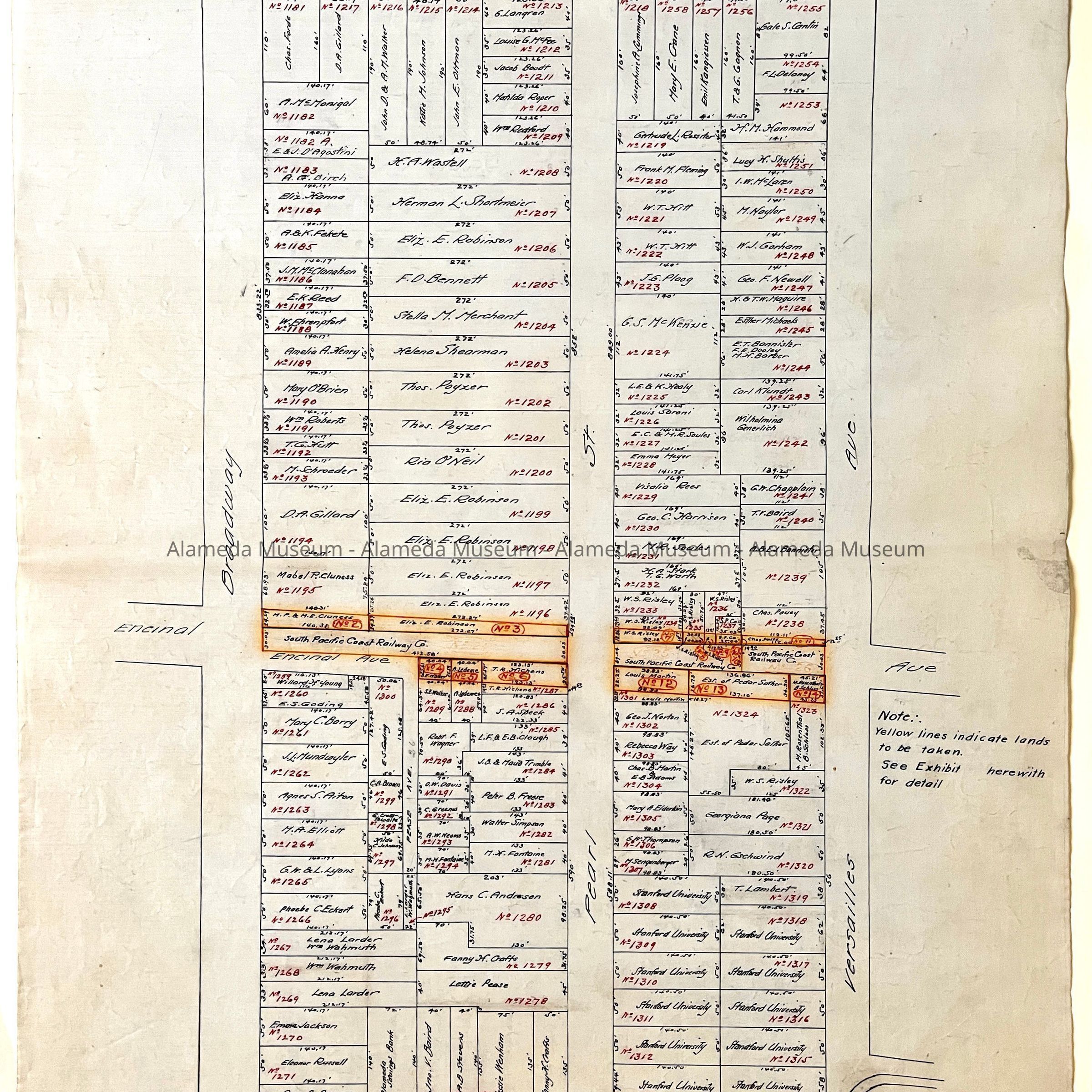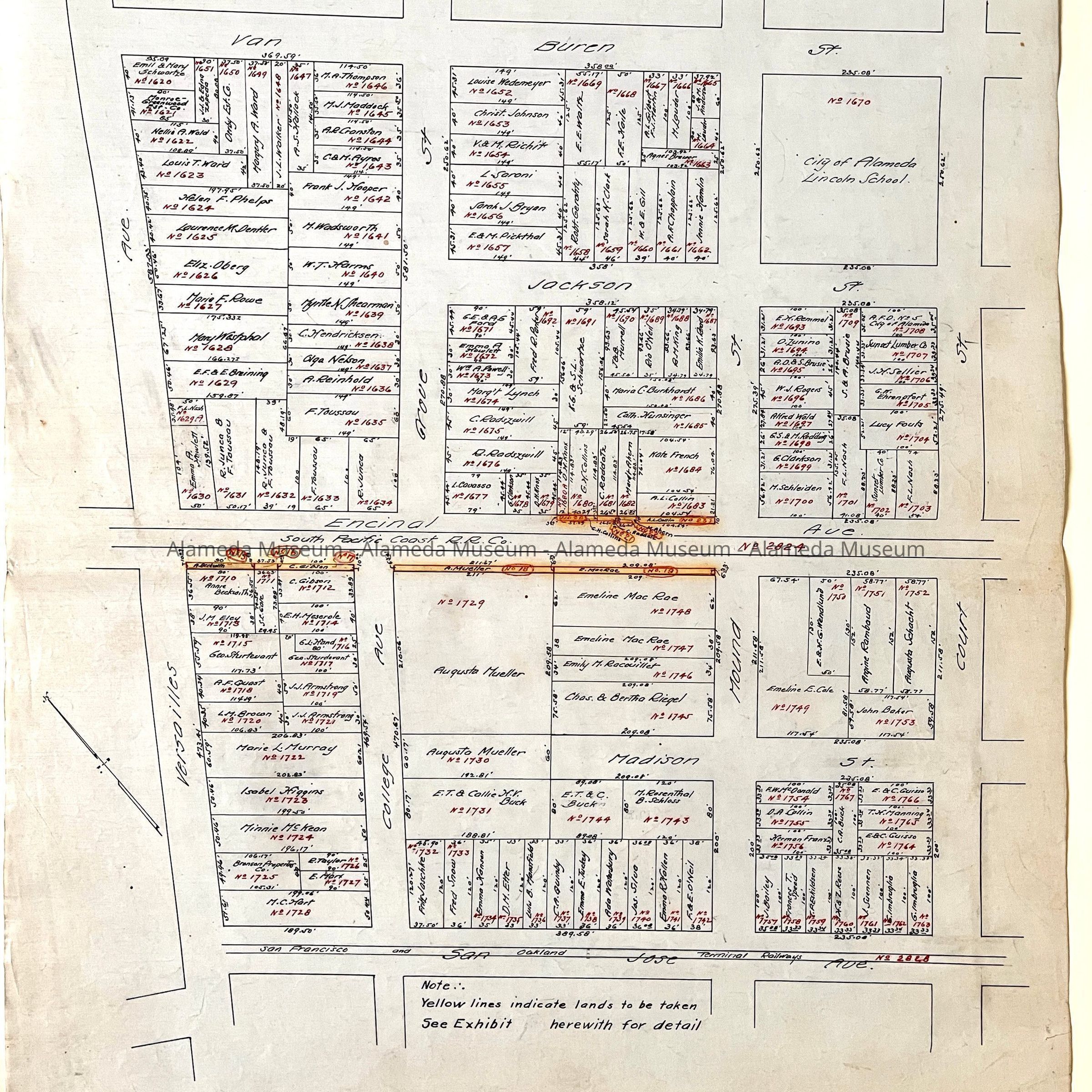 HISTORY OF OBJECTS: MAPS WITH PROPERTY OWNER NAMES AND TYPEWRITTEN LISTING OF PROPERTY OWNERS WHO HAD BEEN AFFECTED BY THE WIDENING OF ENCINAL AVENUE IN ALAMEDA, CA. DOCUMENTS ARE DATED MAY 7, 1916.