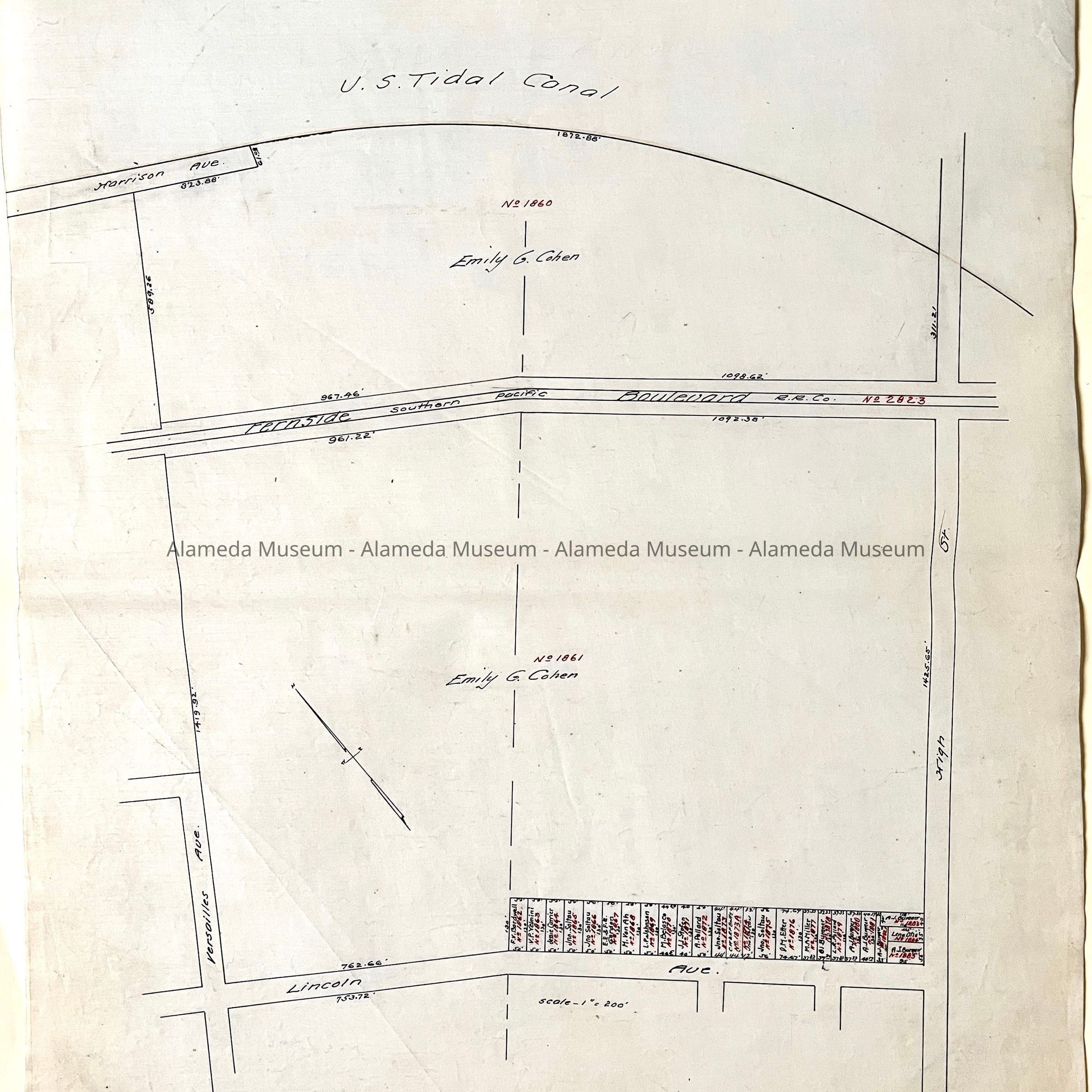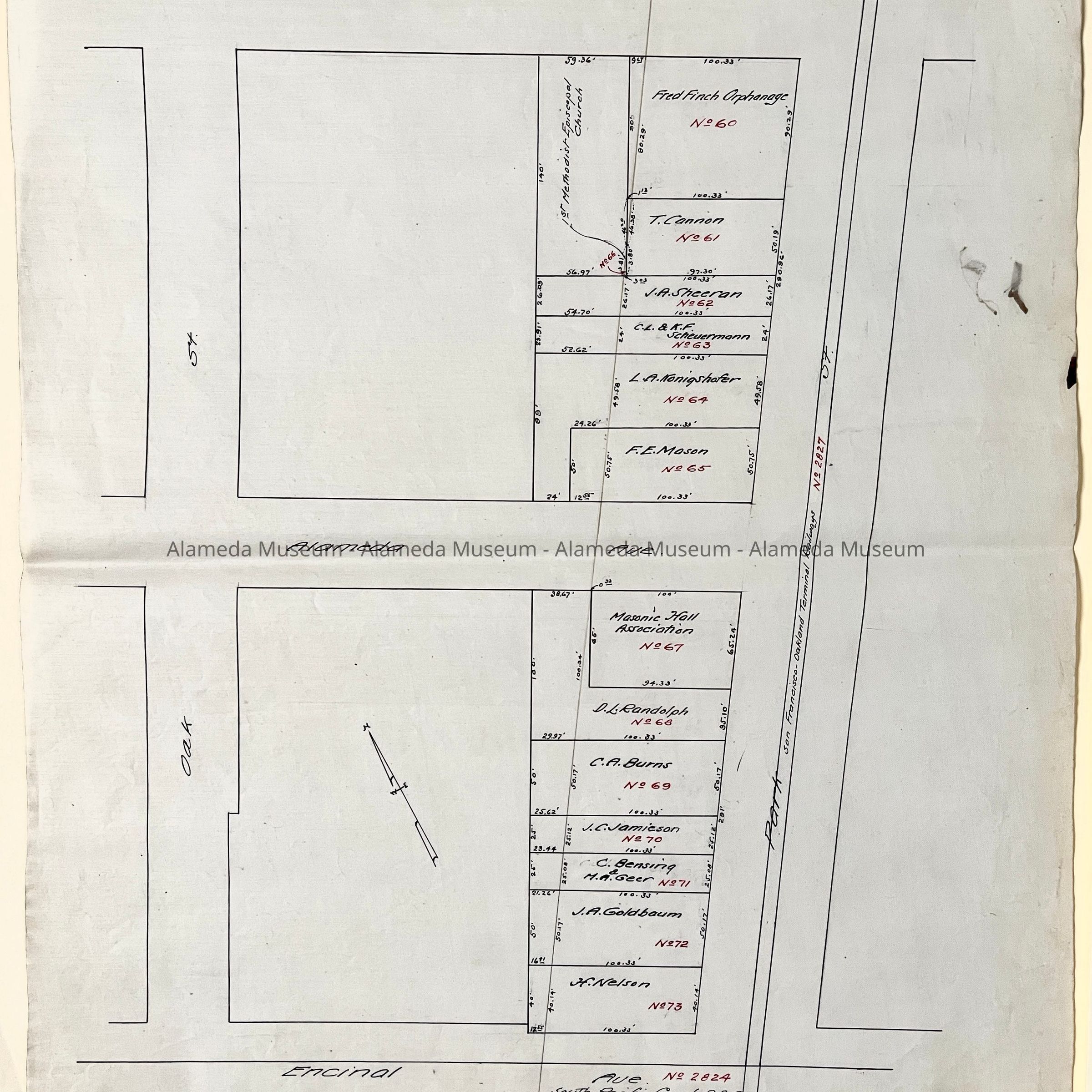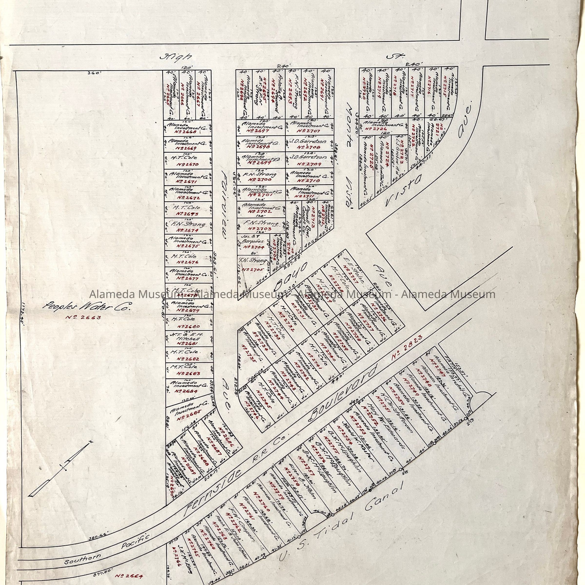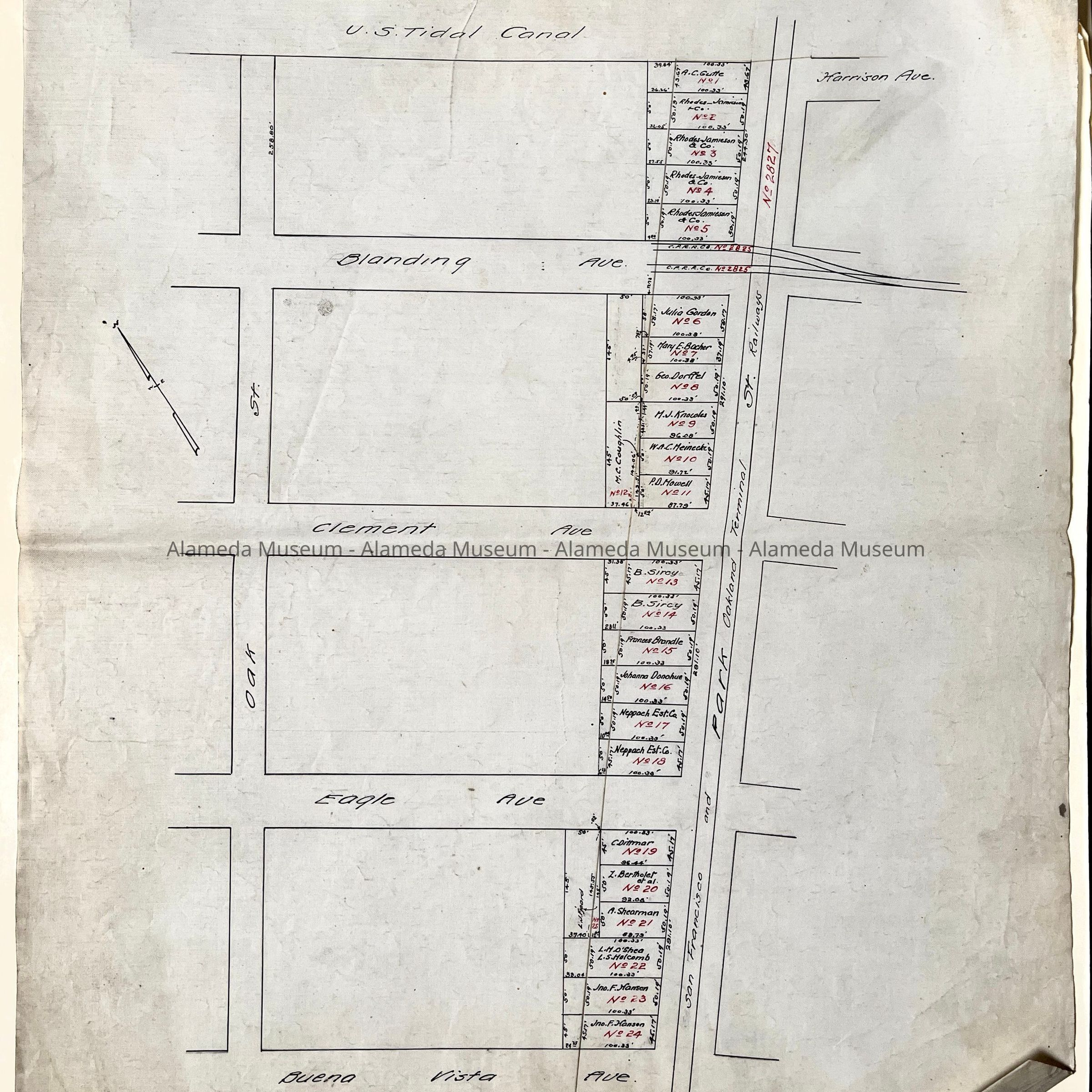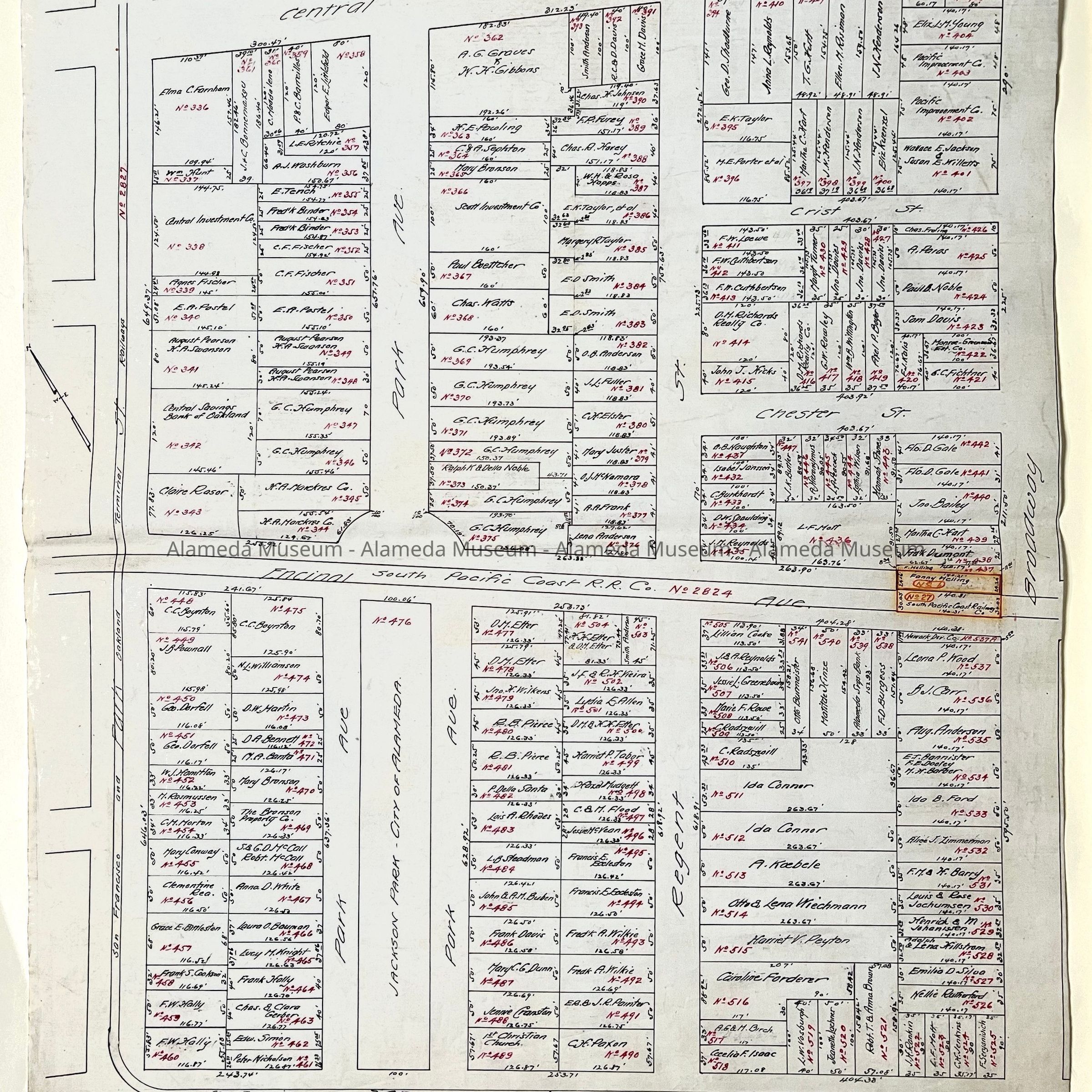 HISTORY OF OBJECTS: MAPS WITH PROPERTY OWNER NAMES AND TYPEWRITTEN LISTING OF PROPERTY OWNERS WHO HAD BEEN AFFECTED BY THE WIDENING OF ENCINAL AVENUE IN ALAMEDA, CA. DOCUMENTS ARE DATED MAY 7, 1916.