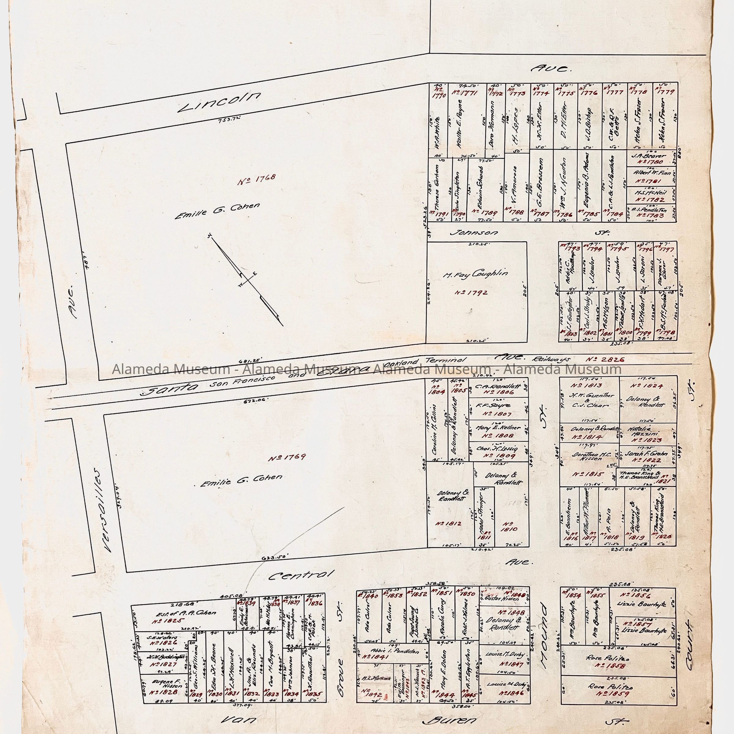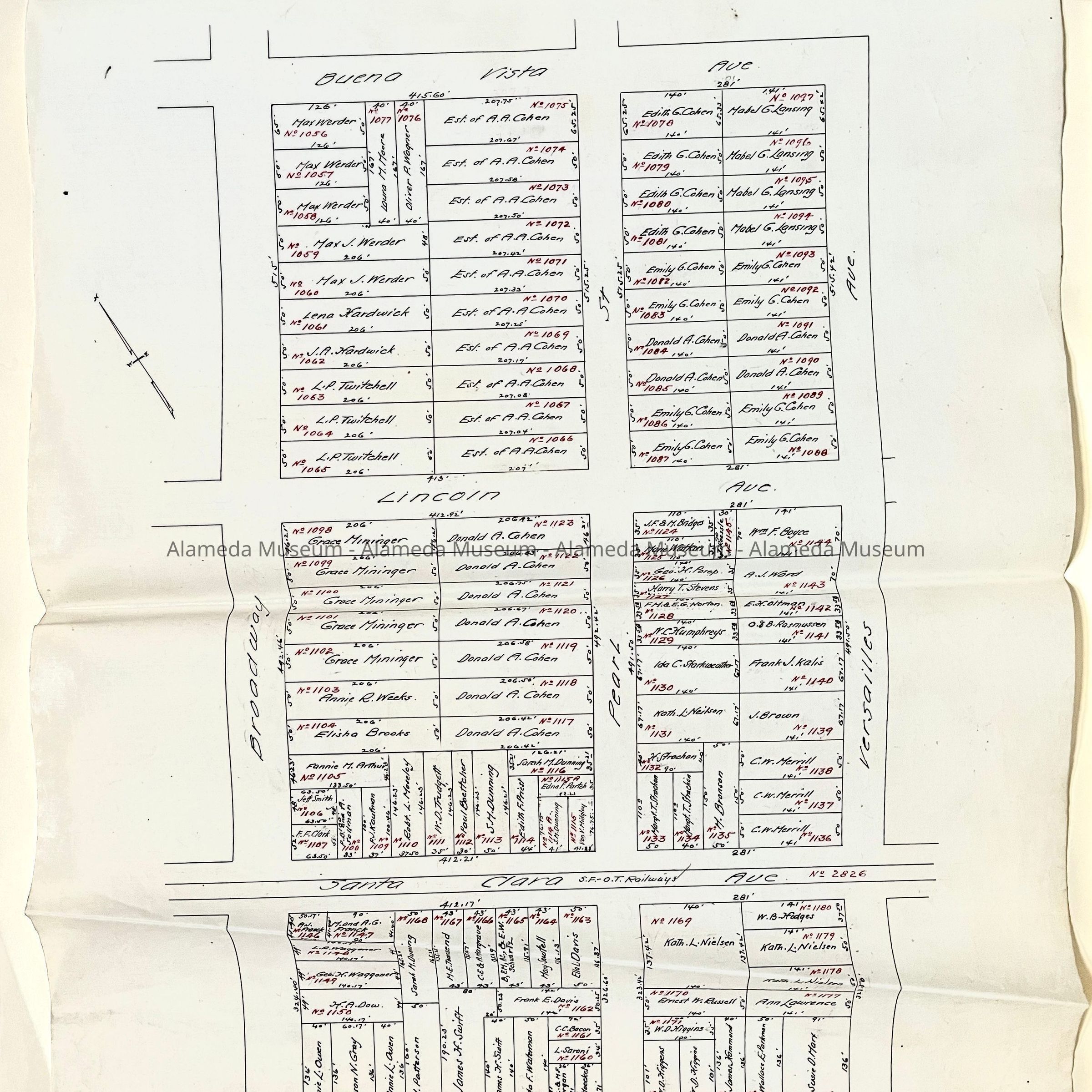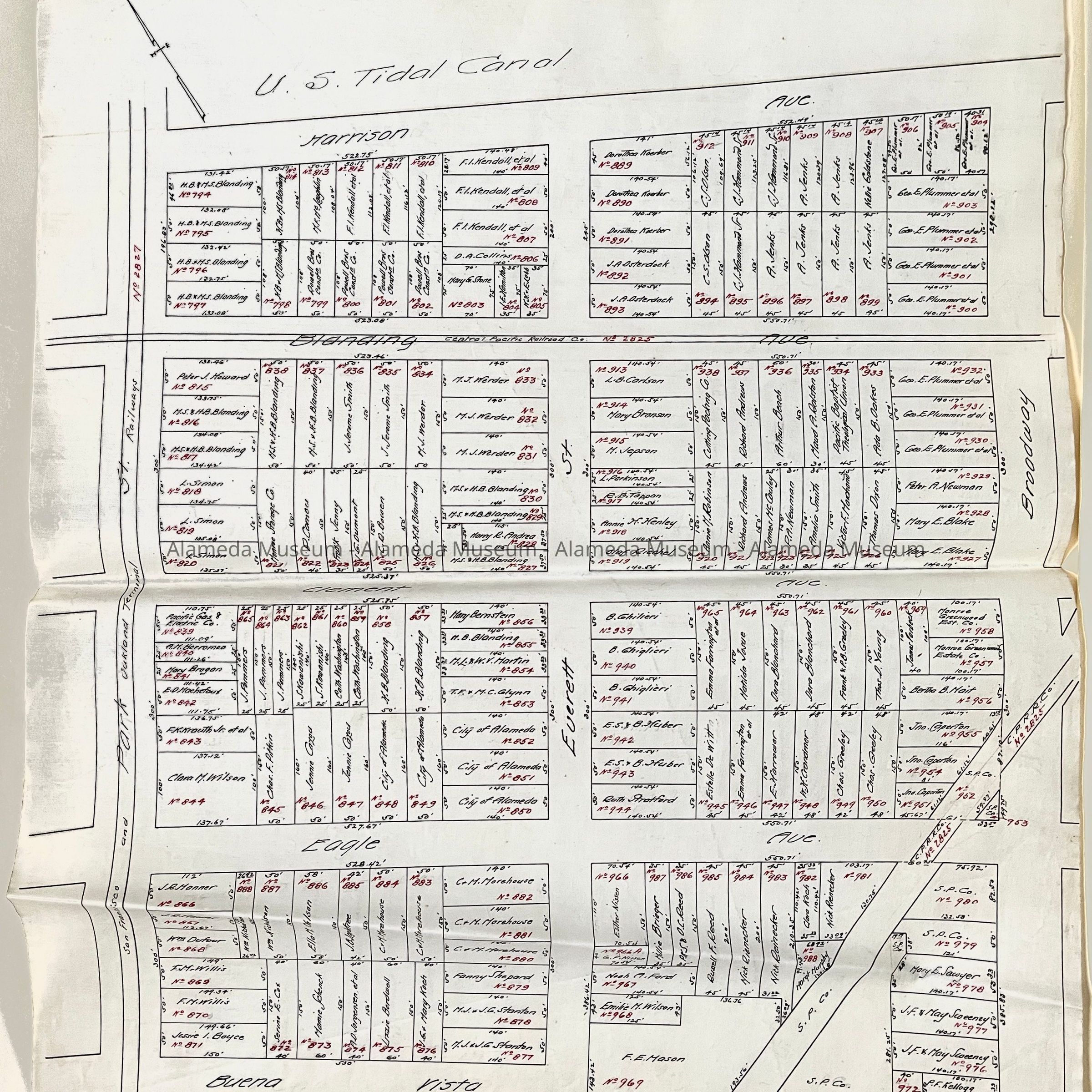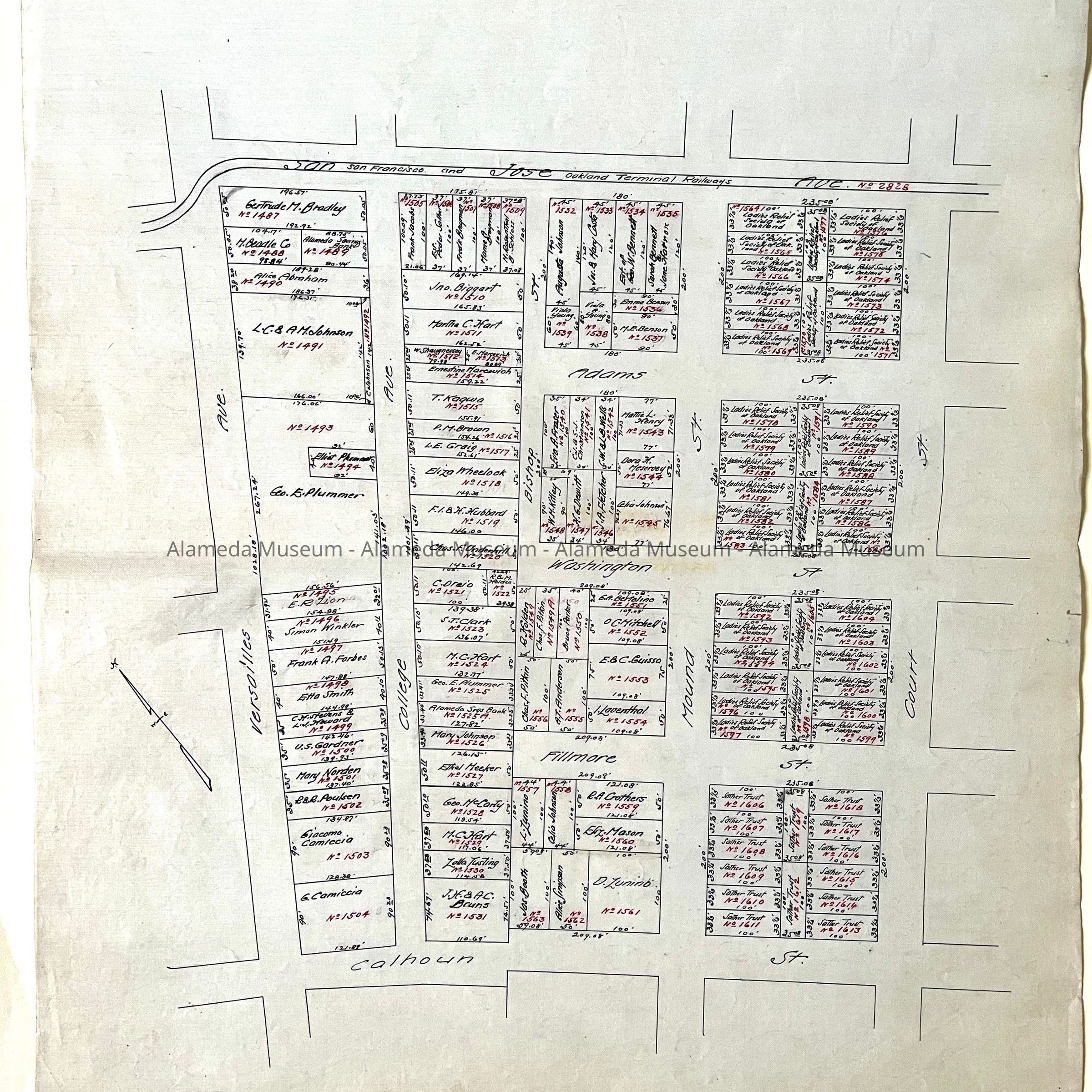 HISTORY OF OBJECTS: MAPS WITH PROPERTY OWNER NAMES AND TYPEWRITTEN LISTING OF PROPERTY OWNERS WHO HAD BEEN AFFECTED BY THE WIDENING OF ENCINAL AVENUE IN ALAMEDA, CA. DOCUMENTS ARE DATED MAY 7, 1916.