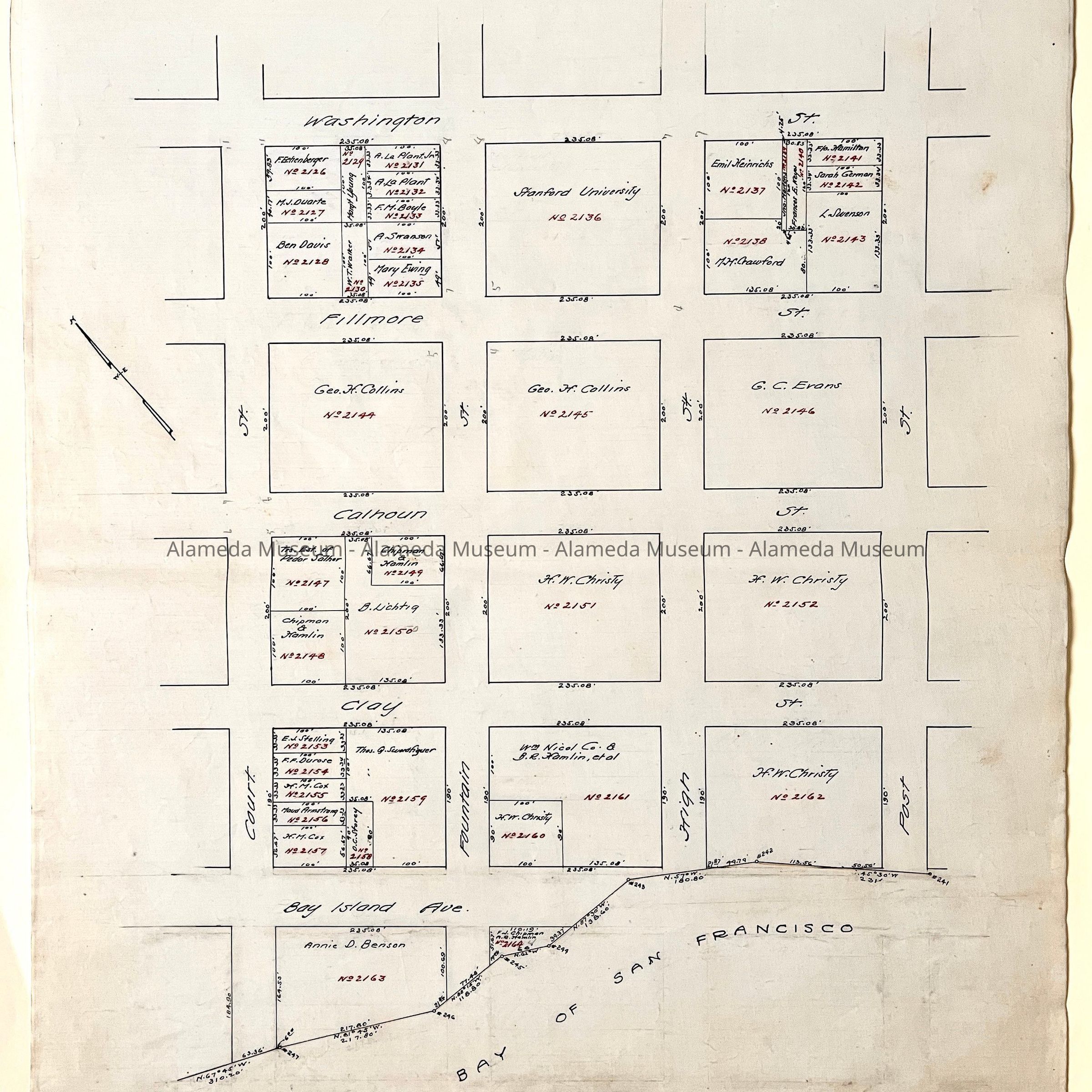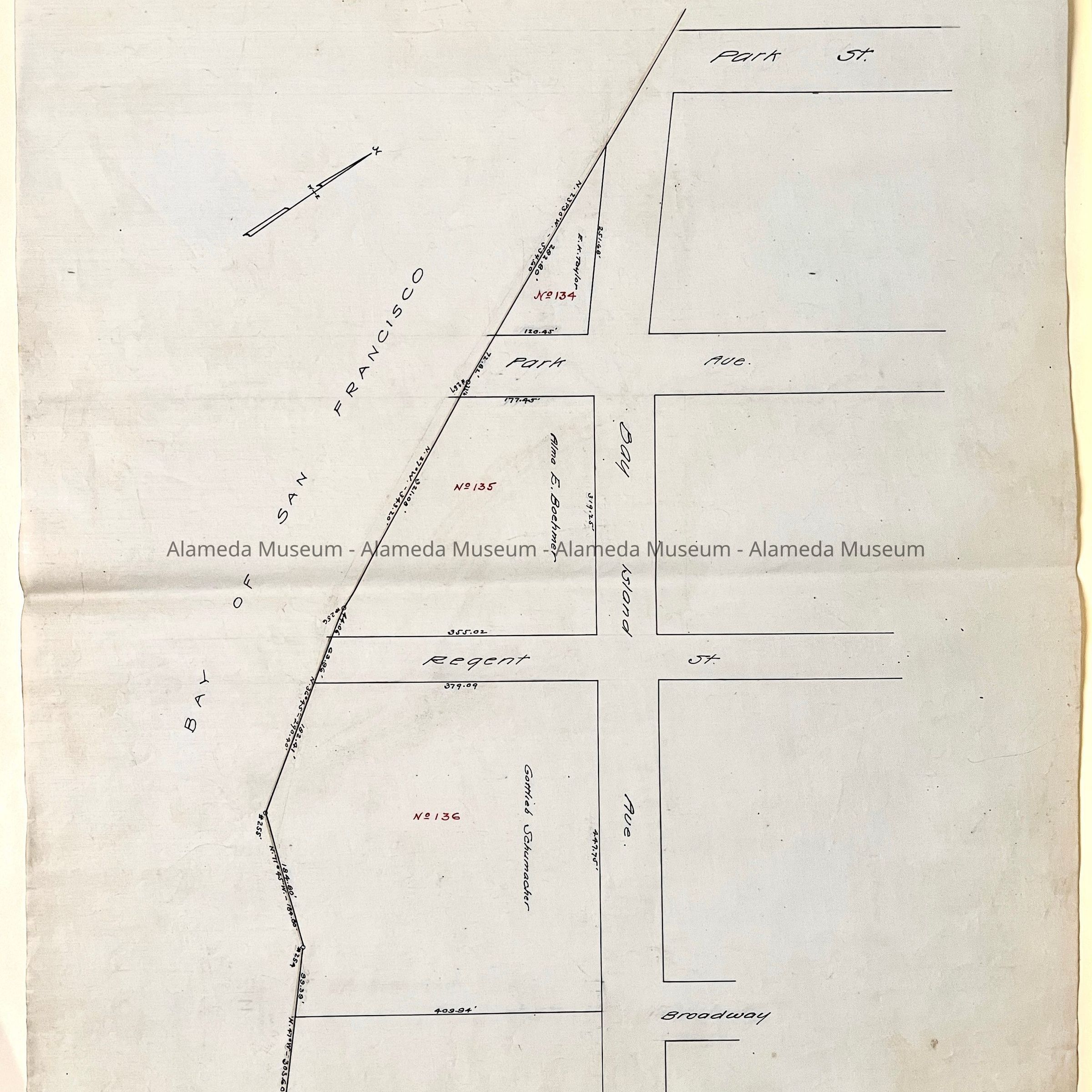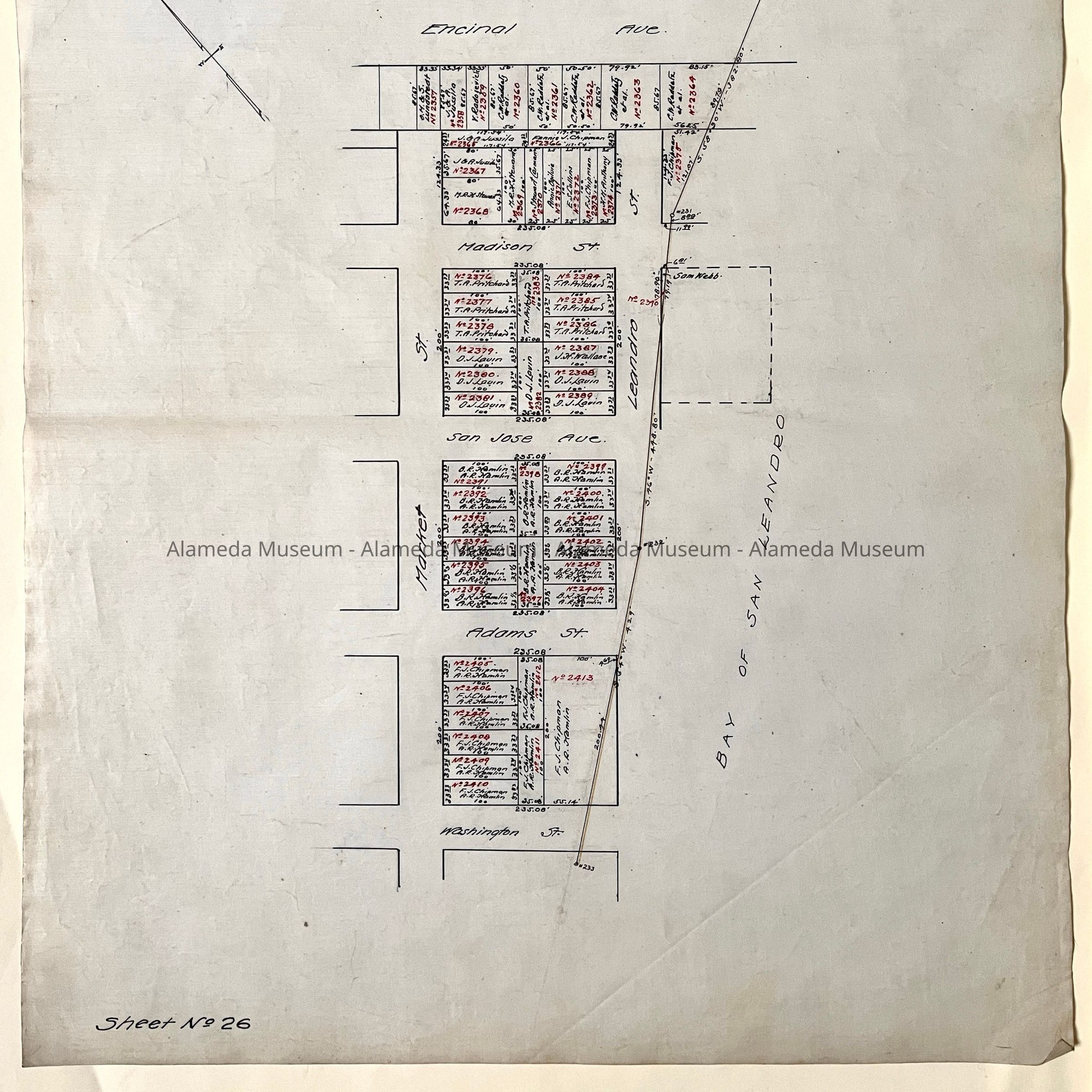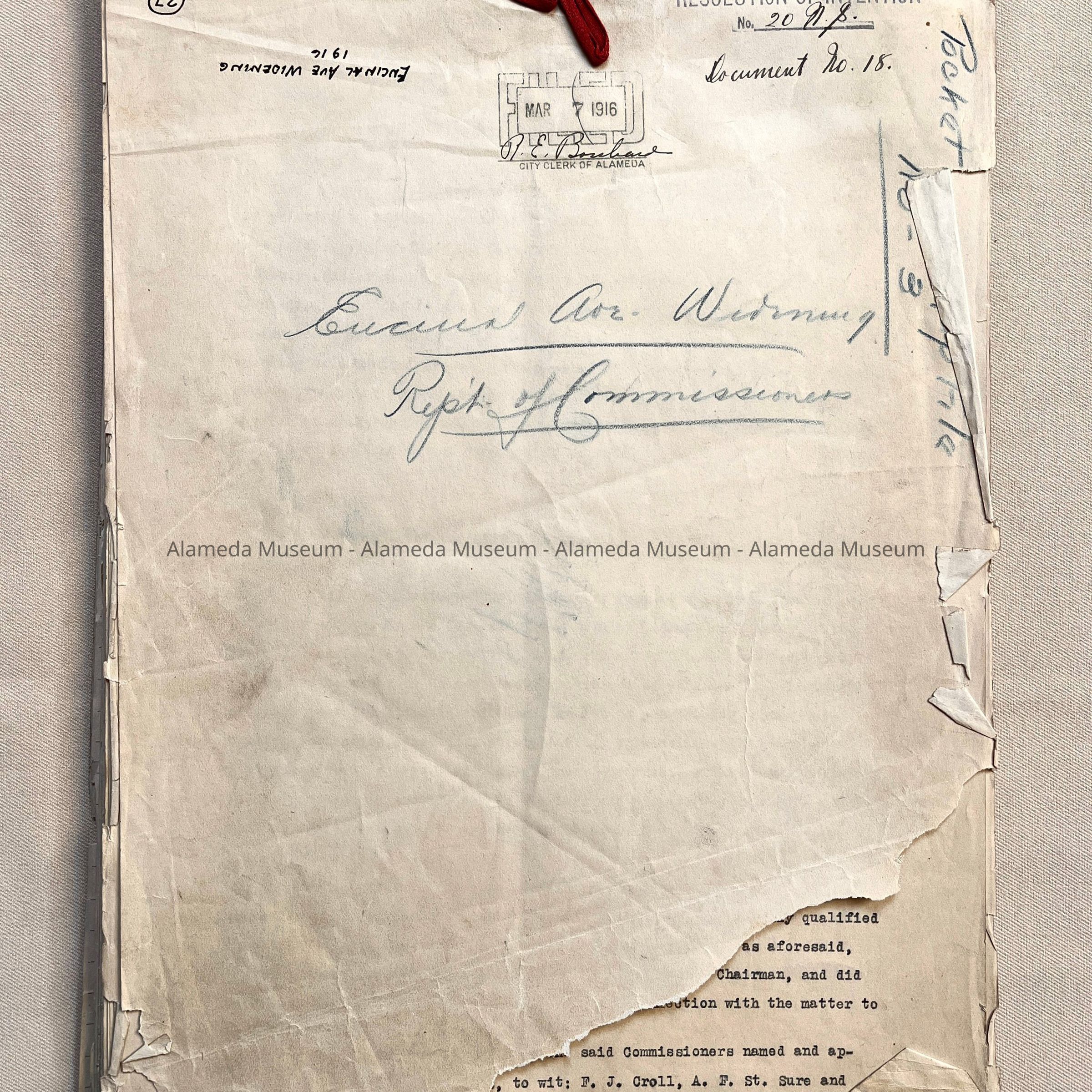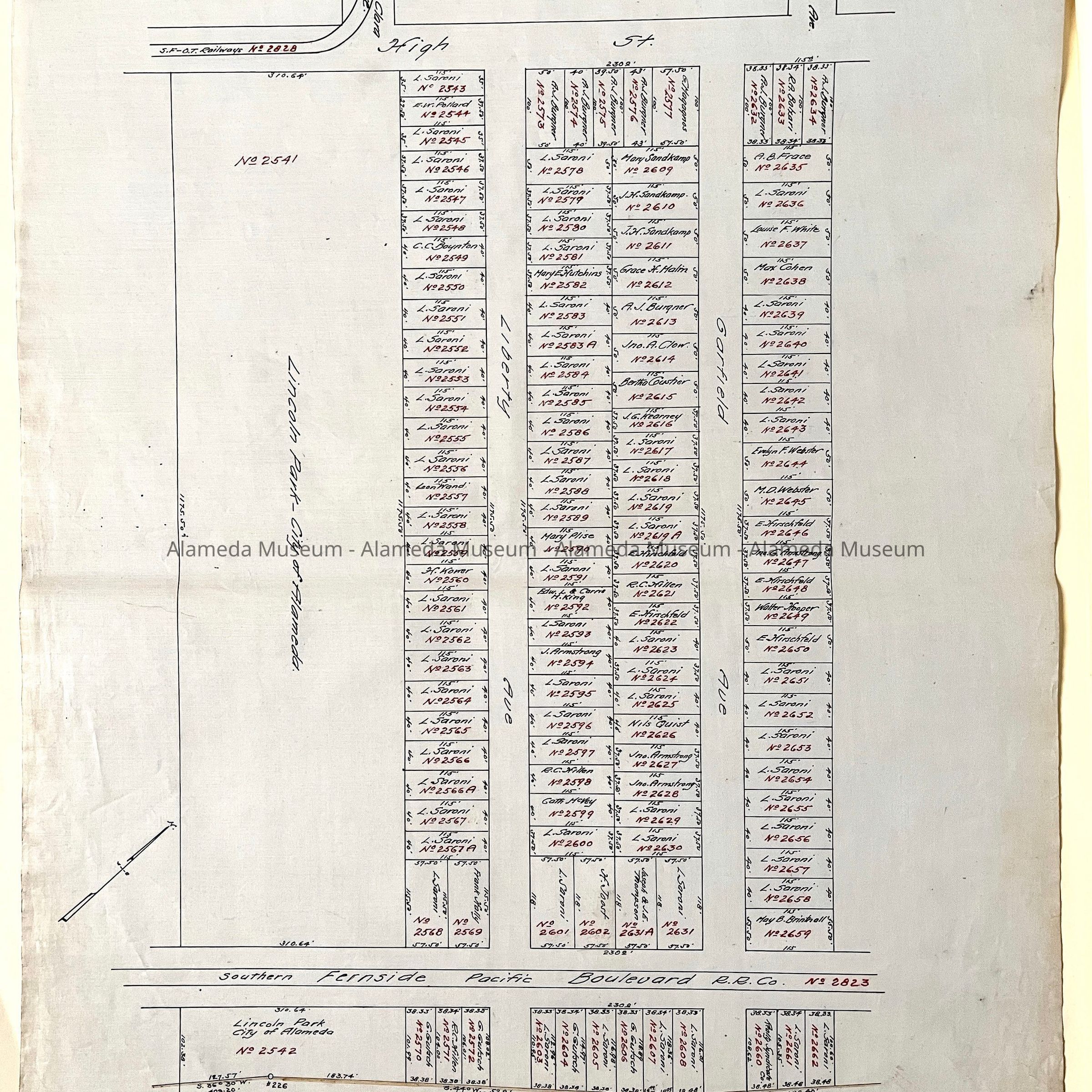 HISTORY OF OBJECTS: MAPS WITH PROPERTY OWNER NAMES AND TYPEWRITTEN LISTING OF PROPERTY OWNERS WHO HAD BEEN AFFECTED BY THE WIDENING OF ENCINAL AVENUE IN ALAMEDA, CA. DOCUMENTS ARE DATED MAY 7, 1916.