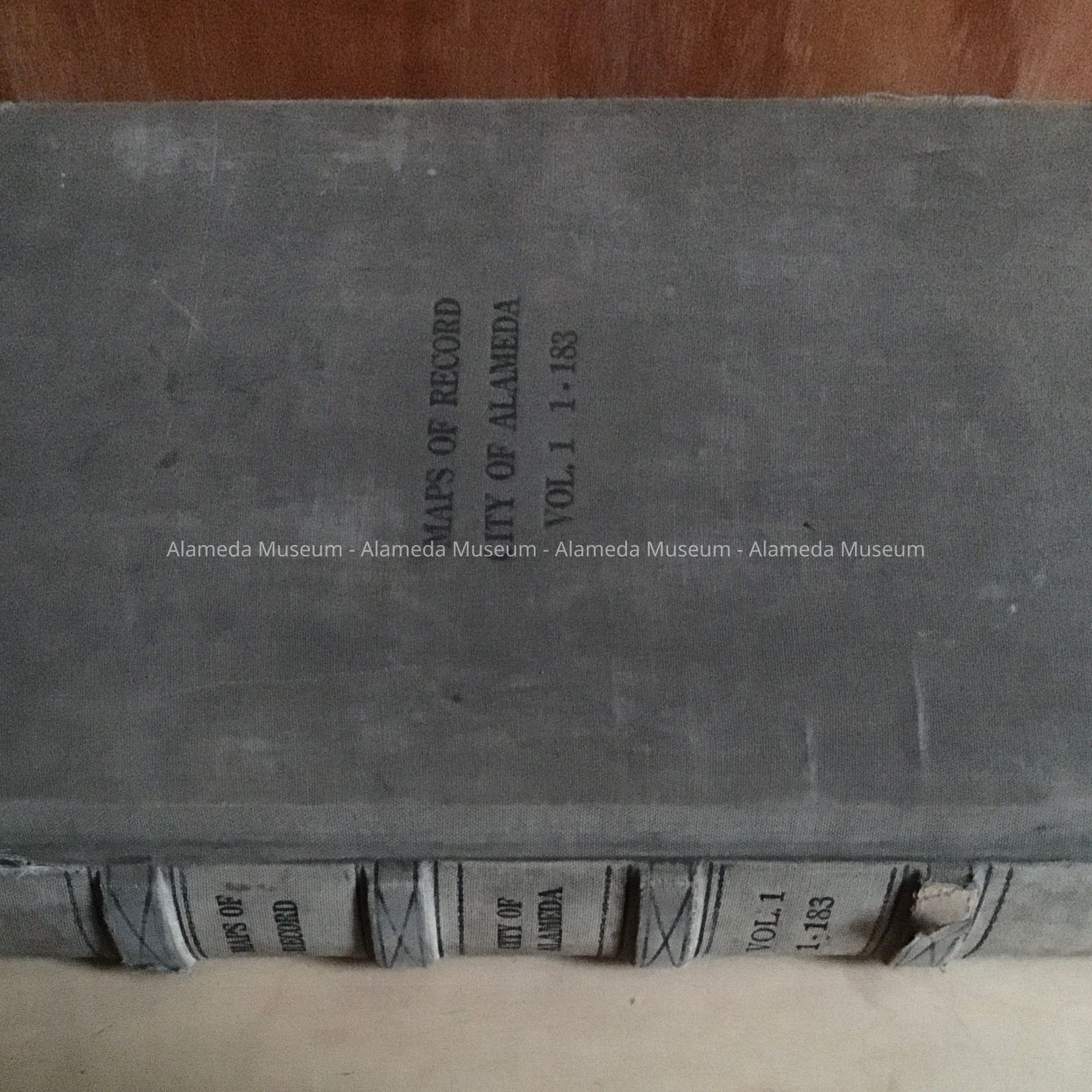 Description: Hardbound volume, gray binding. On the spine of book "Maps of Record, City of Alameda, Vol. 1-183".