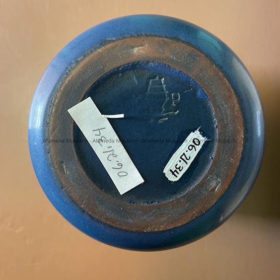 HISTORY OF OBJECT: A VASE MANUFACTURED BY THE MARBLEHEAD POTTERY COMPANY IN MASSACHUSETTS. VASE BELONGED TO THE AMES FAMILY OF 2146 SAN JOSE AVENUE, ALAMEDA. THEIR HOME WAS ERECTED IN 1921 AND IS STILL STANDING.