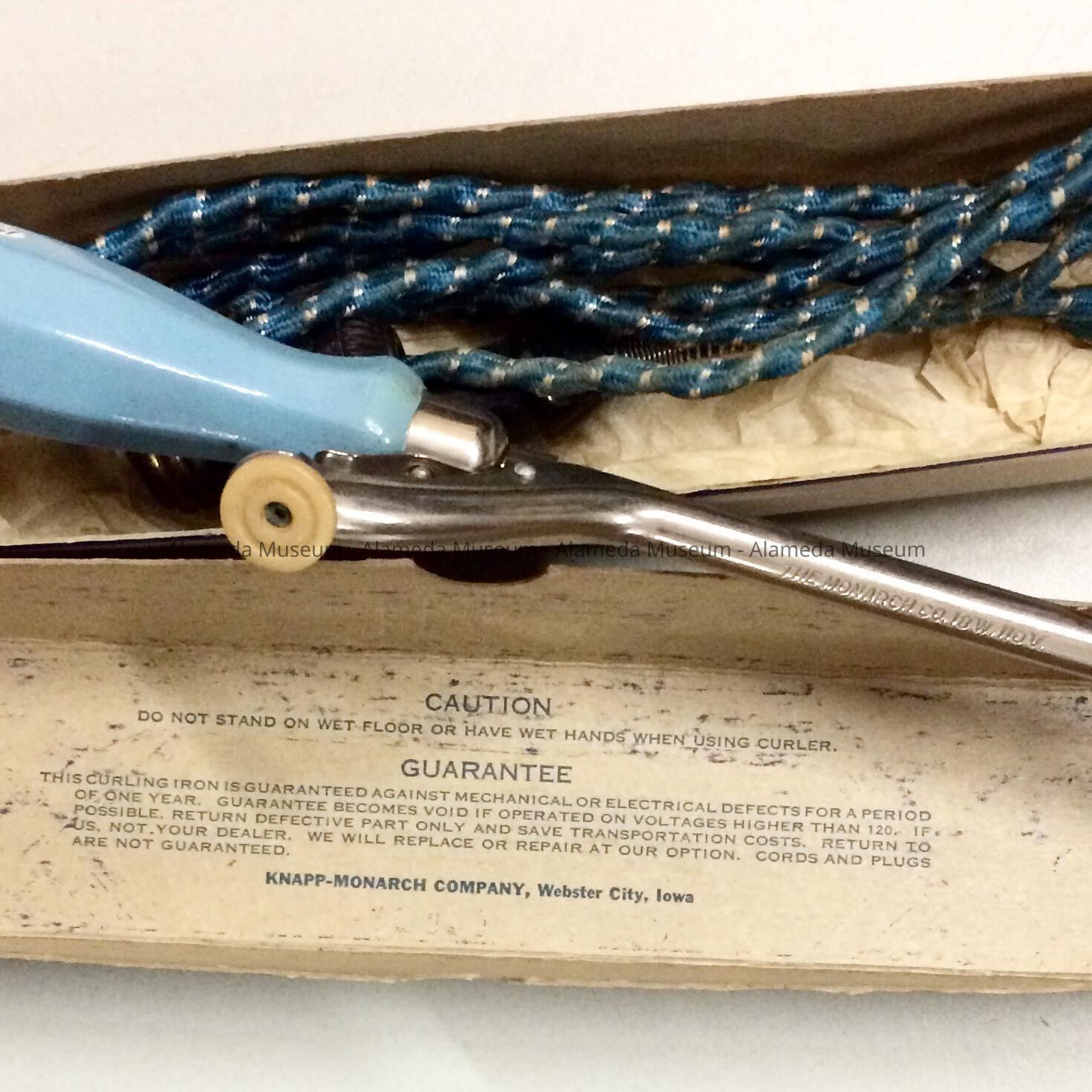 DESCRIPTION: AN ELECTRICAL CURLING IRON IN ITS ORIGINAL BOX WITH A BLUE COLORED HANDLE ATTACHED TO A PUSH LEVER AND CHROME PLATED SHAFT WITH DETACHABLE ELECTRICAL CORD WRAPPED IN SILK THREAD. ELECTRICAL PLUG HAS AN ADAPTER SO THAT IT CAN BE SCREWED INTO A LAMP SOCKET. THE BOX COVER STATES, "MONARCH CURLER," IN YELLOW, ORANGE, AND BLUE COLORED TYPE. THE CURLING IRON WAS PRODUCED BY MONARCH CURLER, WEBSTER CITY, IOWA.
