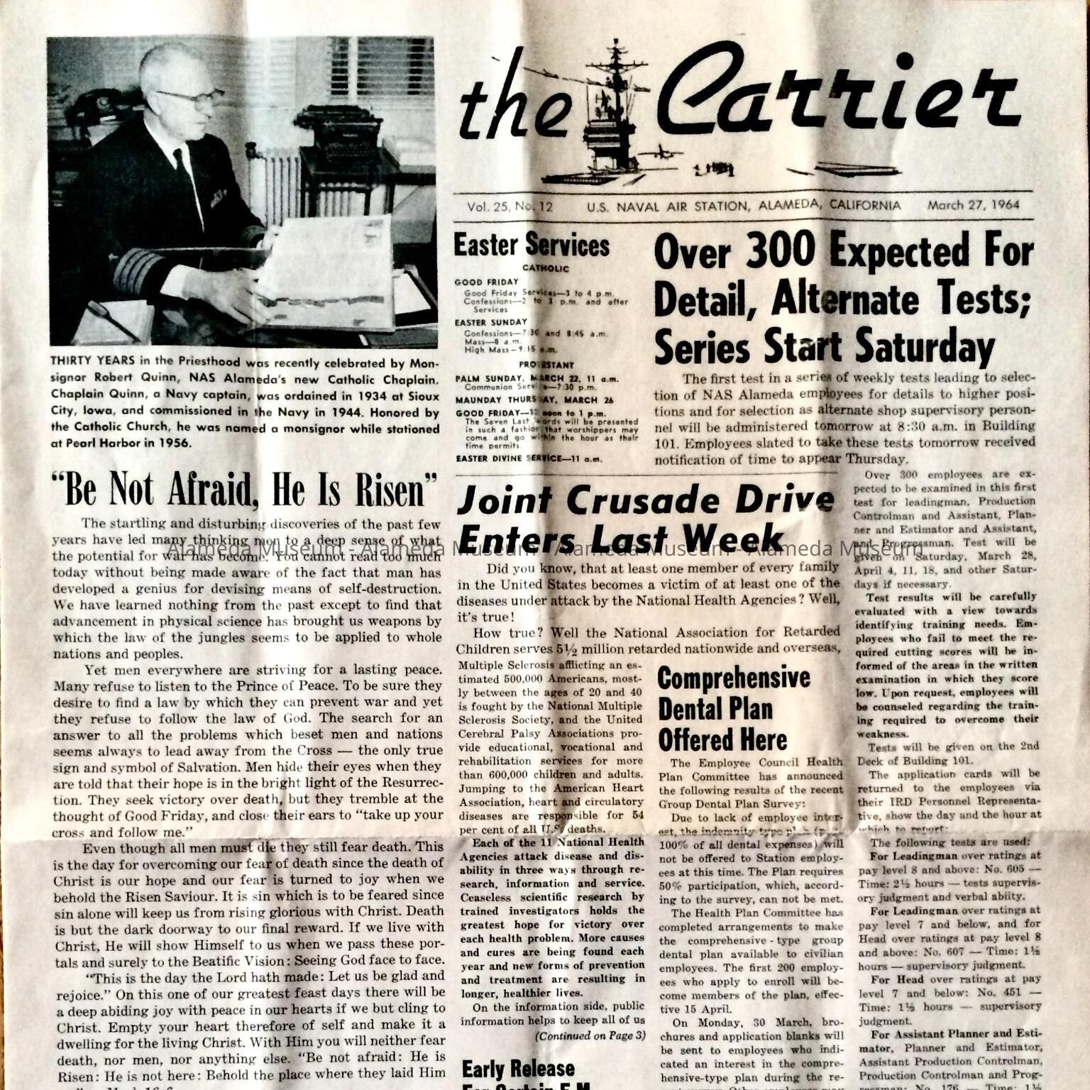 History of Object: The March 27, 1964 edition of "The Carrier", published by the U.S. Naval Air Station, Alameda, CA.