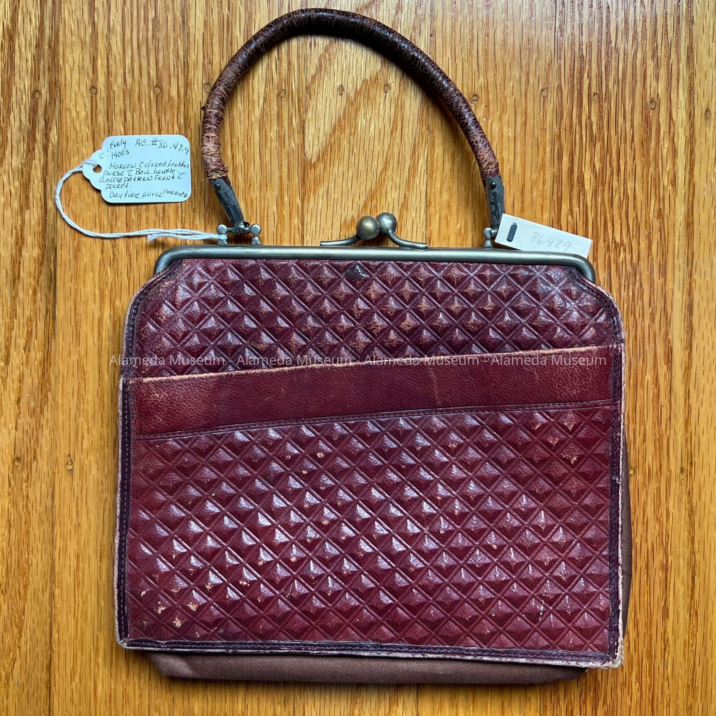 Description: Maroon colored leather purse with bail handle. Nickel plated brass frame & catch. Waffle pattern embossed leather front with pocket, brown material lining.