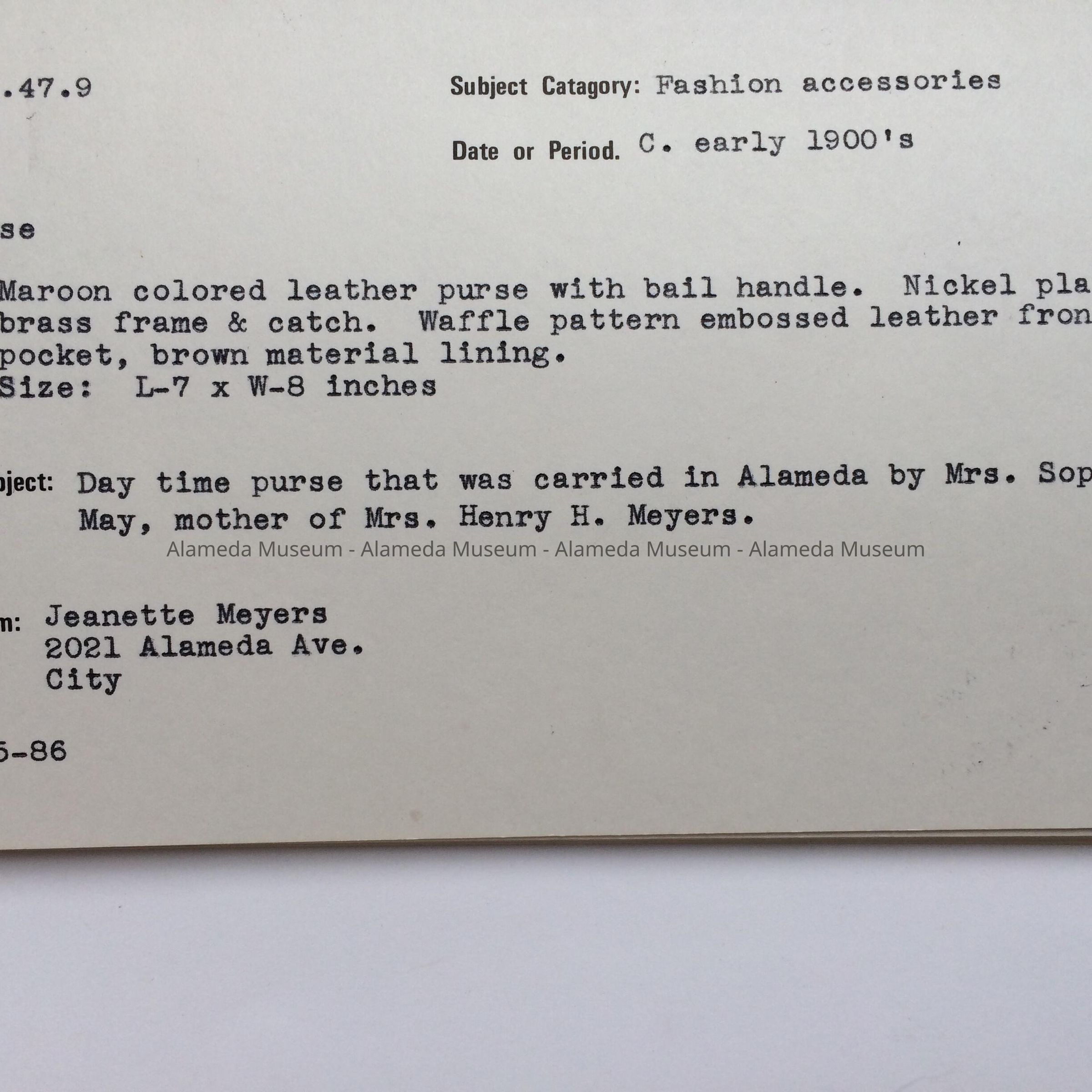 History of Object: Day time purse that was carried in Alameda by Mrs. Sophia May, mother of Mrs. Henry H. Meyers.