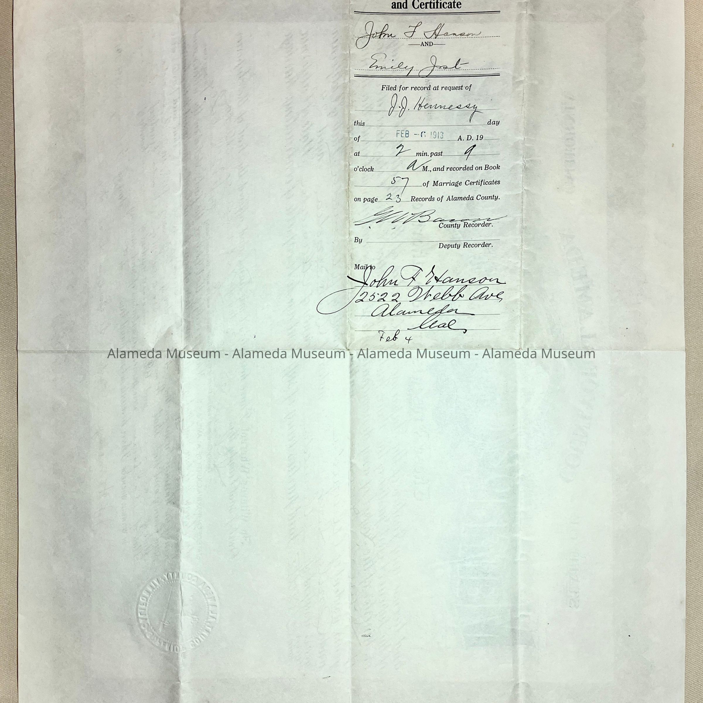 History of Object: Marriage license (certificate) of John F. Hanson to Emily Jost, dated Feb. 6, 1913. They were the parents of the donor and members of old time Alameda families.