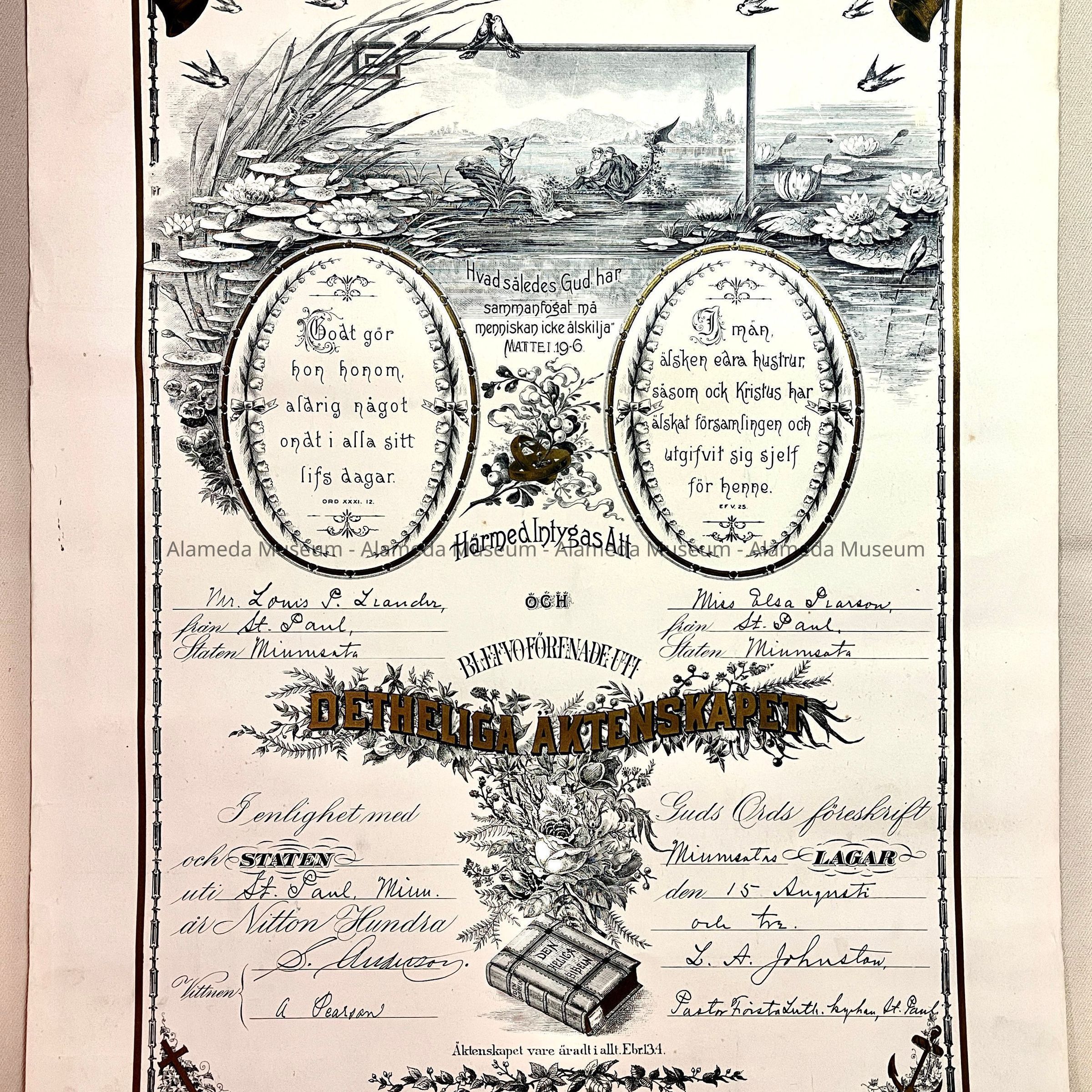 HISTORY OF OBJECT: THE MARRIAGE CERTIFICATE OF LOUIS P LEANDER AND MS ELSA PEARSON. THEY WERE MARRIED IN MINNESOTA IN AUGUST, 1903, AND LATER BECAME RESIDENTS OF ALAMEDA. THEIR DAUGHTER, EVELYN LEANDER HOPKINS, ATTENDED ALAMEDA HIGH SCHOOL IN THE EARLY 1920's.