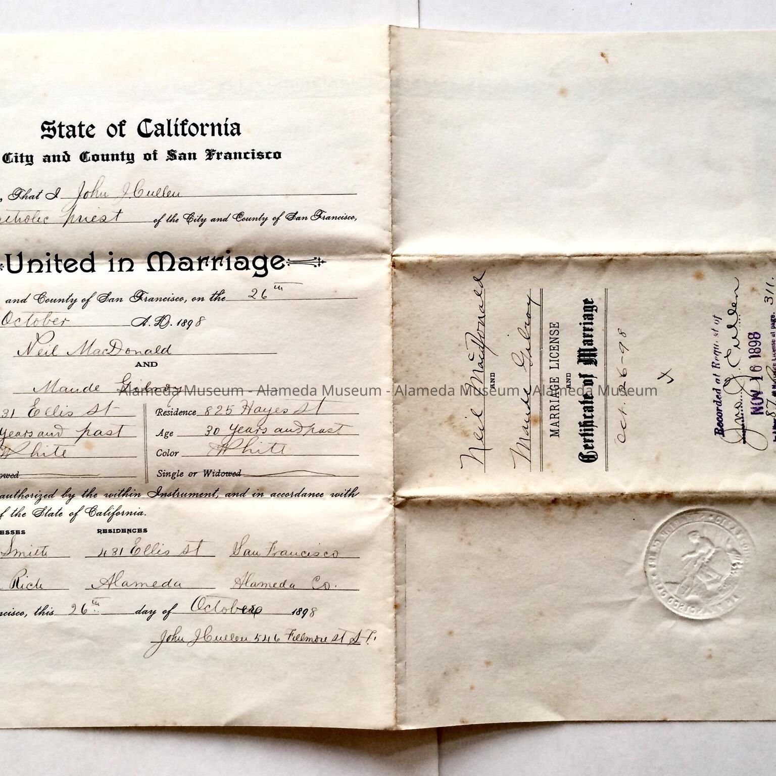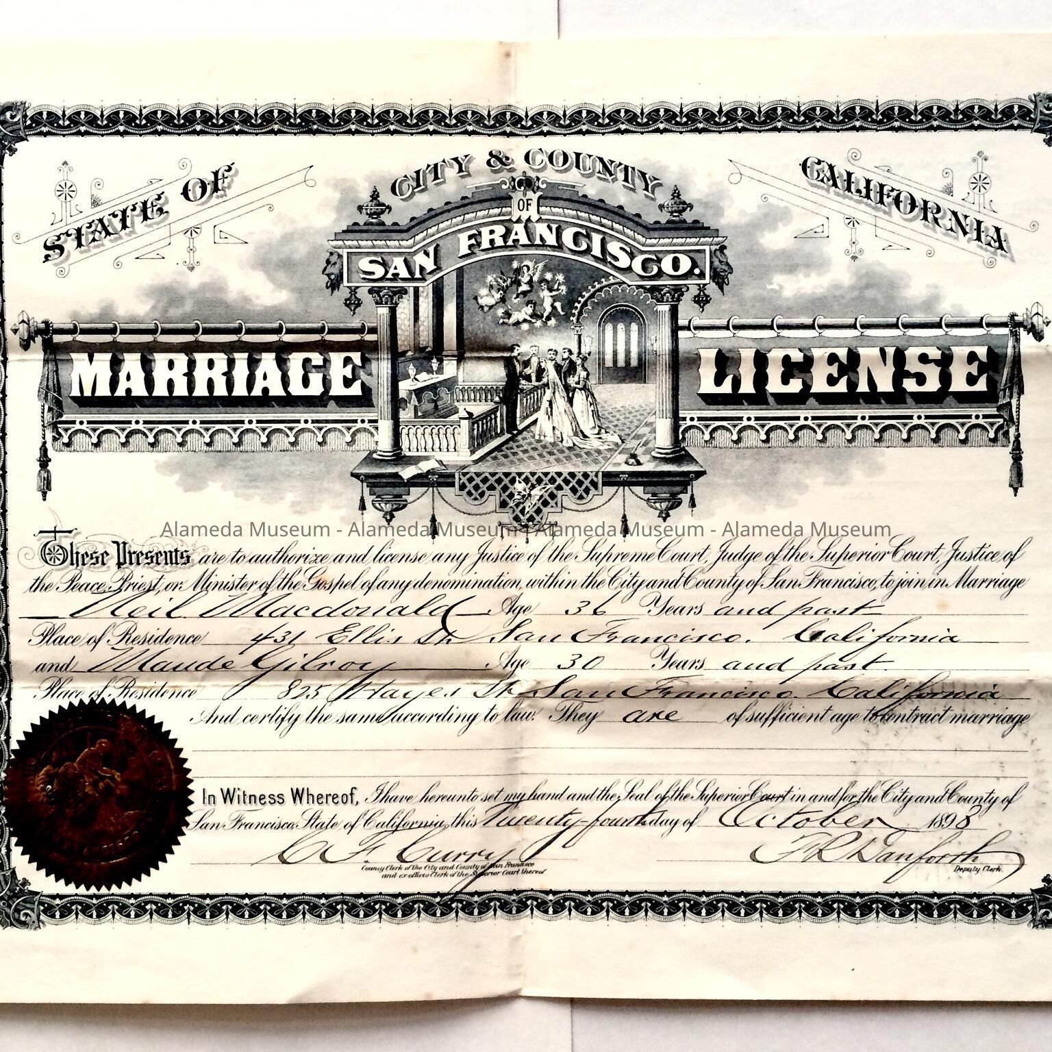 A MARRIAGE CERTIFICATE OF NEIL MACDONALD AND MAUDE GILROY. MARRIAGE CEREMONY WAS PERFORMED IN SAN FRANCISCO ON OCTOBER 20, 1898. FOLLOWING THEIR MARRIAGE, THEY SUBSEQUENTLY MOVED TO A LAMEDA AND LATER BECAME PARENTS OF ONE CHILD, ANNE.