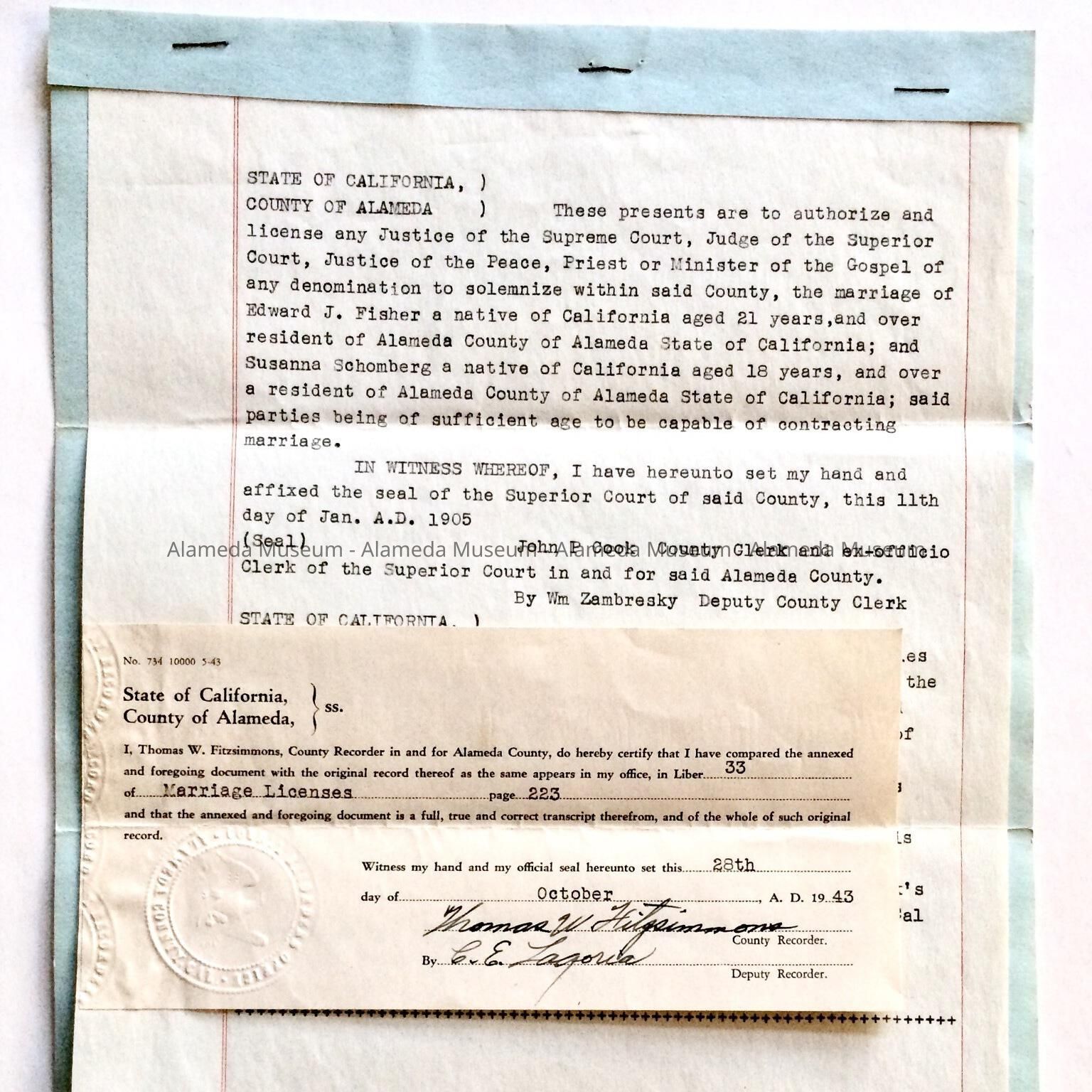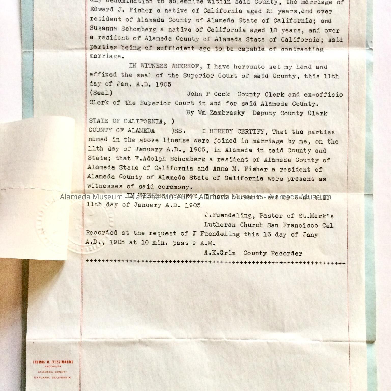 Typewritten marriage contract of Edward J. Fisher to Susanna Schomborg, dated January 11, 1905. They were both old-time residents of Alameda, and the parents of Edward E. Fisher (donor’s late husband).