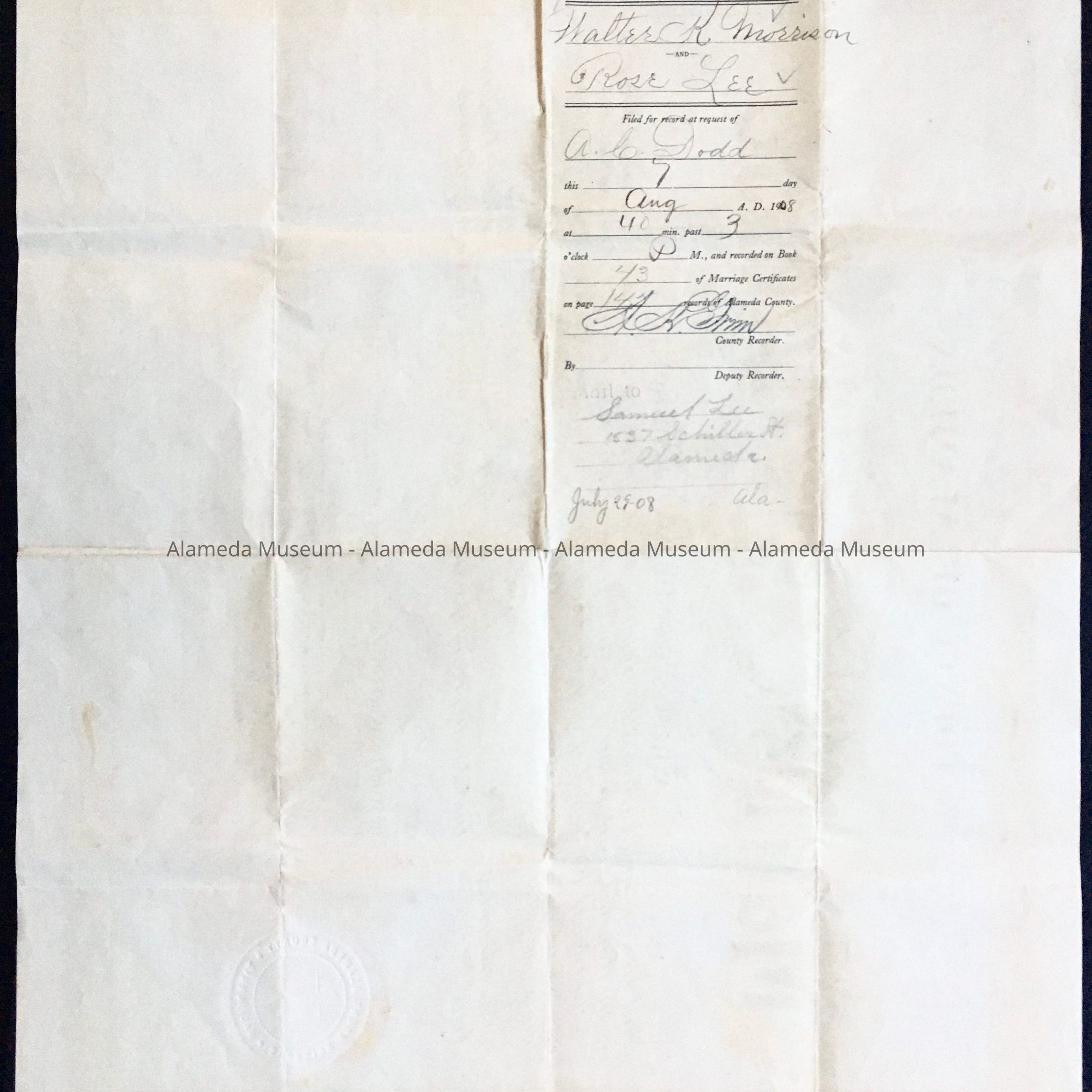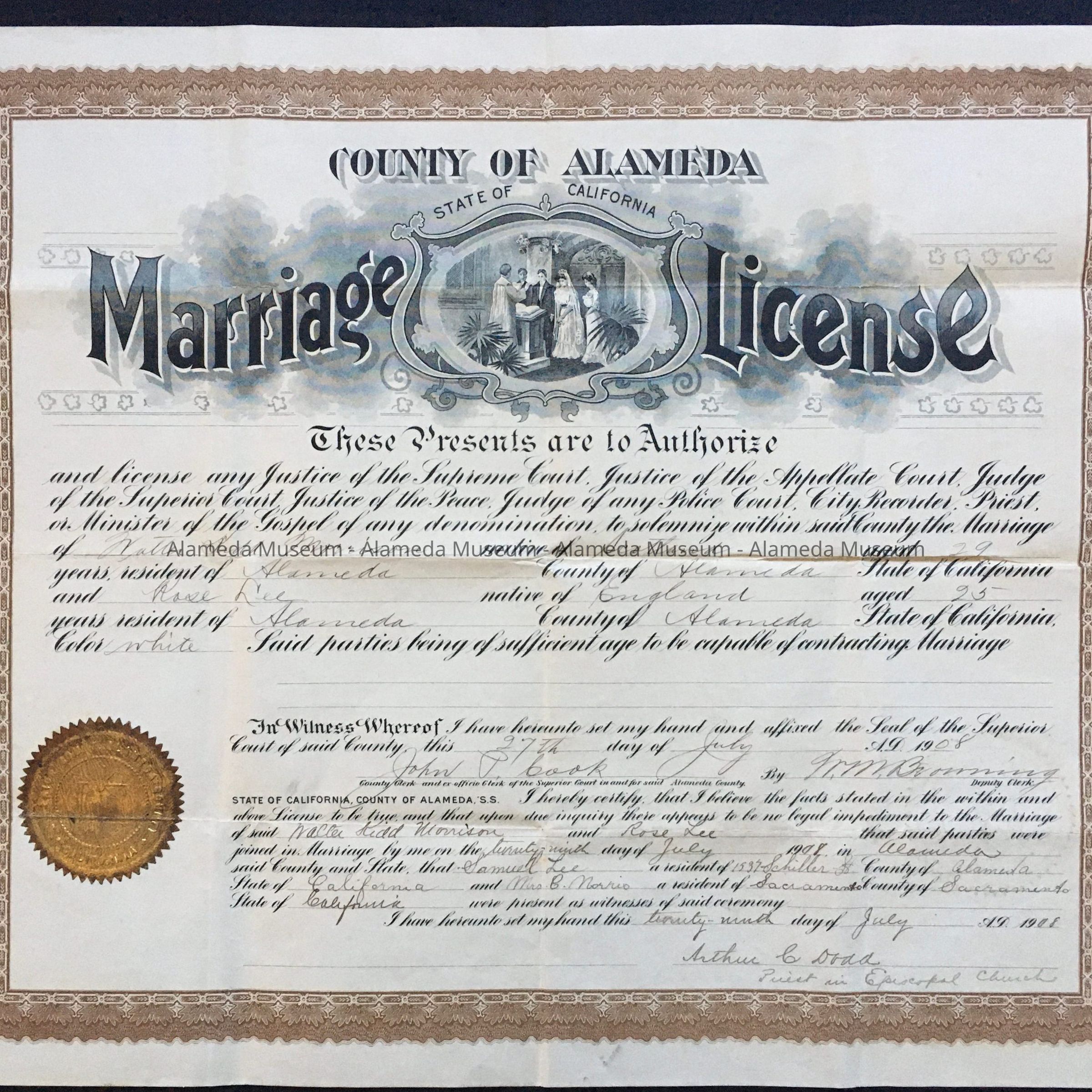 HISTORY OF OBJECT: A MARRIAGE LICENSE FOR WALTER KIDD MORRISON TO ROSELEE. BOTH WERE ALAMEDA RESIDENTS. THEY WERE MARRIED ON JULY 27, 1908 IN THE CITY OF ALAMEDA, BY ARTHER C. DODD, EPISCOPAL CHURCH PRIEST. INFORMATION CONCERNING BOTH FAMILIES CAN BE FOUND IN ACC. NO. 06.87.3.