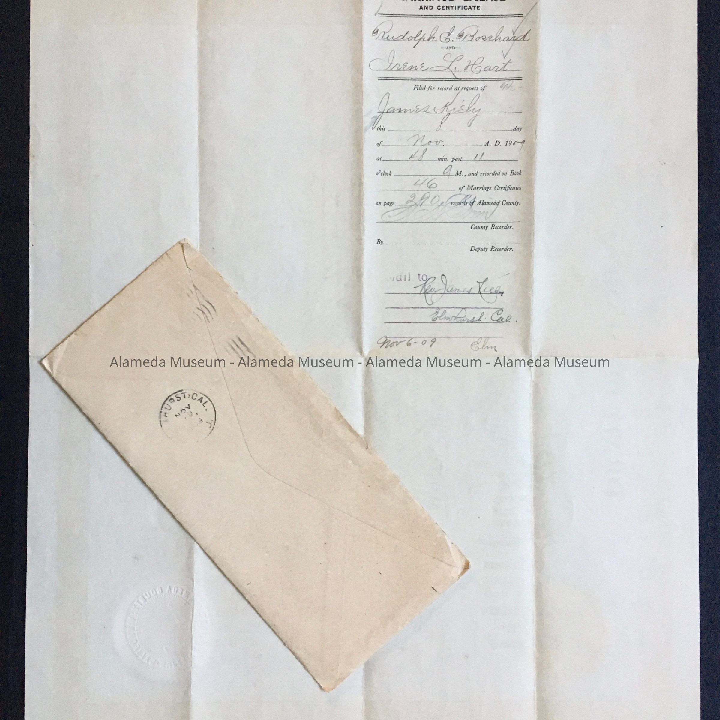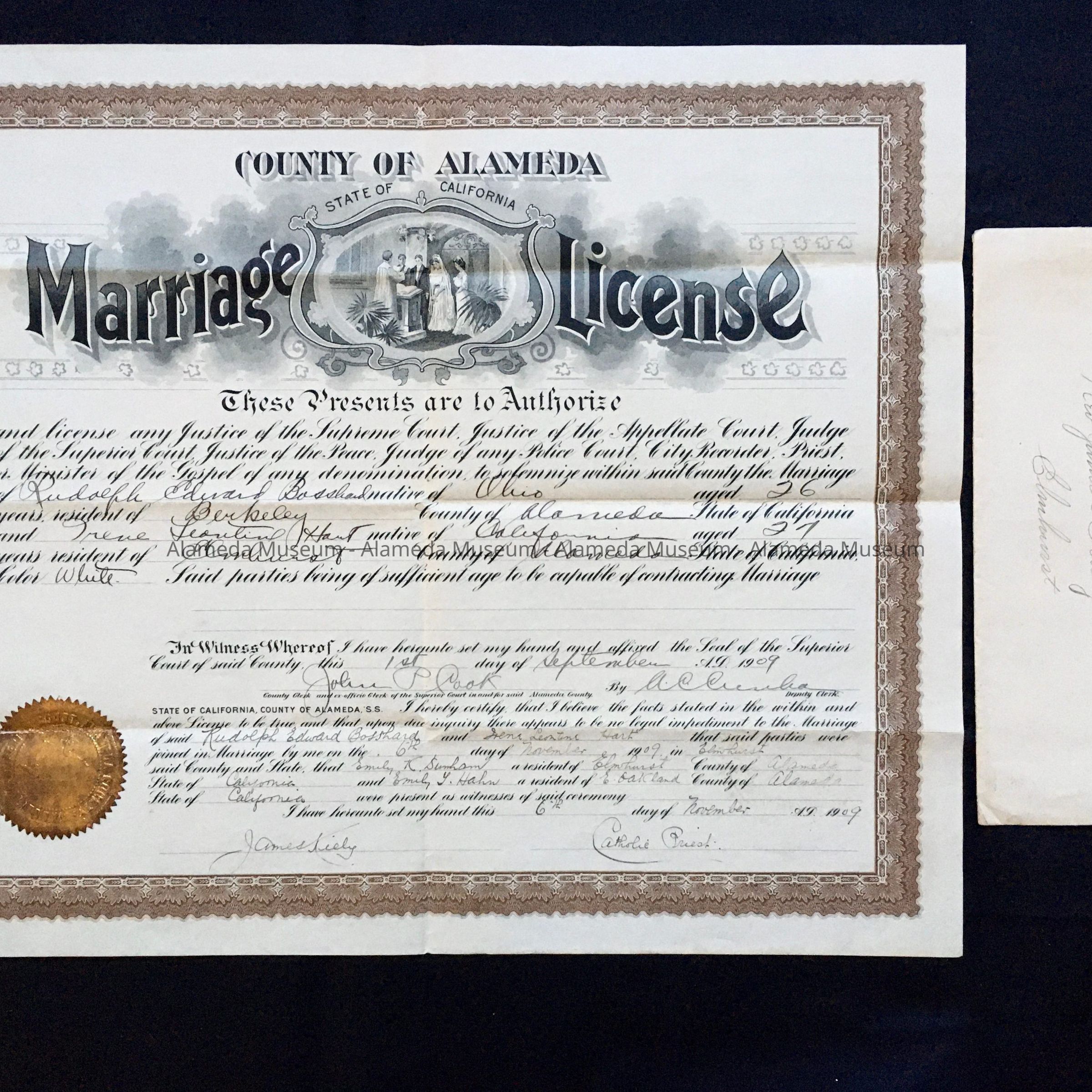 MARRIAGE LICENSE, ISSUED NOVEMBER 6, 1909, TO RUDOLPH EDWARD BOSSHARD, NATIVE OF OHIO, AGE 26, AND RESIDENT OF BERKELEY, AND IRENE LEONTINE HART, NATIVE OF CALIFORNIA, AGE 27, AND RESIDENT OF ELMHURST, COUNTY OF ALAMEDA, STATE OF CALIFORNIA. MR BOSSHARD WAS WELL KNOWN IN ALAMEDA, SERVING AS CITY CLERK AND AN EDUCATOR IN THE ALAMEDA SCHOOLS. HE LATER SERVED ON THE ALAMEDA COUNTY BOARD OF EDUCATION. MR BOSSHARD DIED IN 1959 AT THE AGE OF 76.