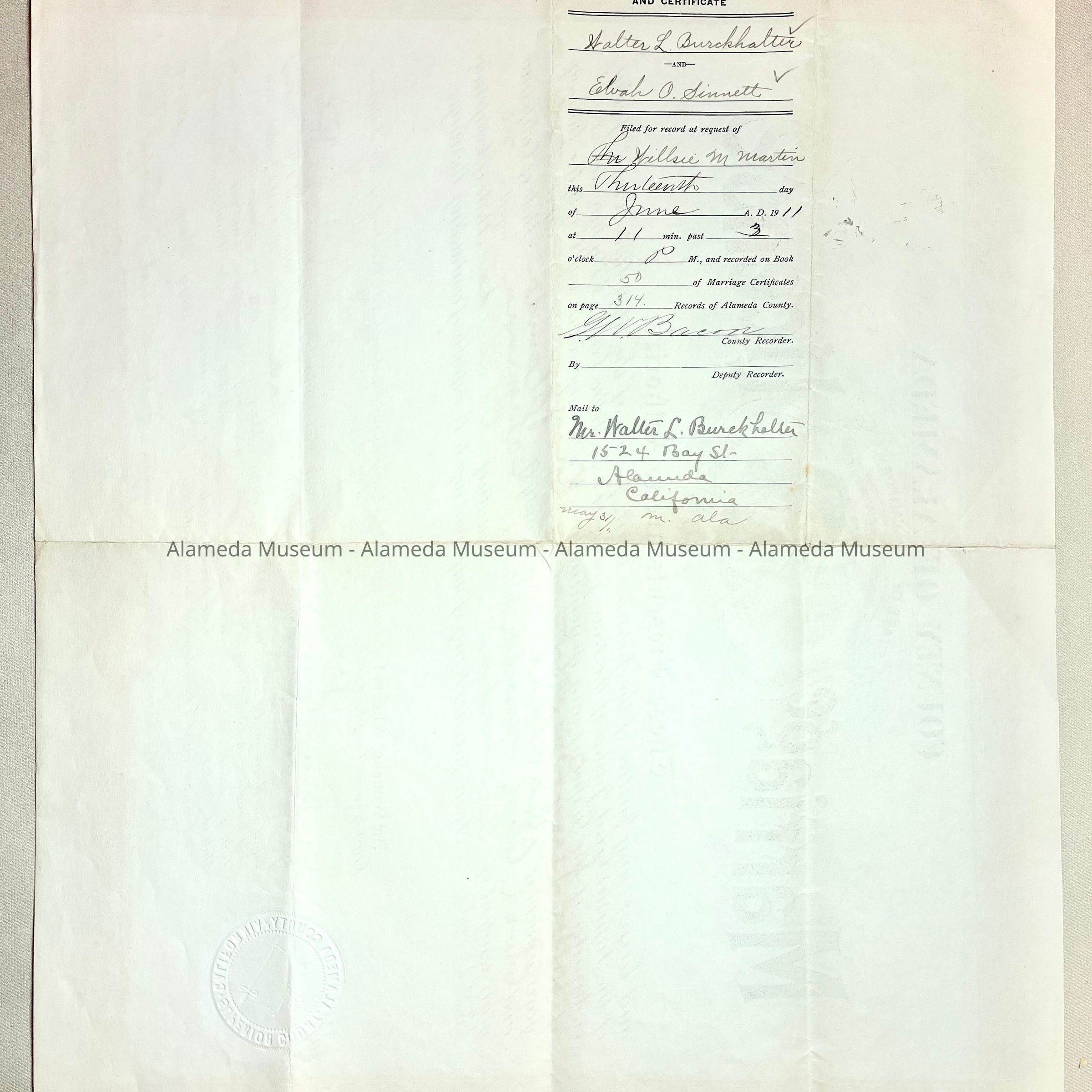 MARRIAGE LICENSE OF WALTER I BURCKHALTER, OF OAKLAND, TO ELVAH OLIVE SINNETT, MAY 31, 1911; WEDDING AT THE FIRST METHODIST EPISCOPAL CHURCH IN ALAMEDA, CALIF. WILLSIE MANNING MARTIN, MINISTER. MRS BURCKHALTER WAS THE DAUGHTER OF ALVAH SINNETT, 1524 BAY STREET, ALAMEDA. MR AND MRS BURCKHALTER WERE THE PARENTS OF PAULINE B. MCINTOSH, LATE WIFE OF THE DONOR.