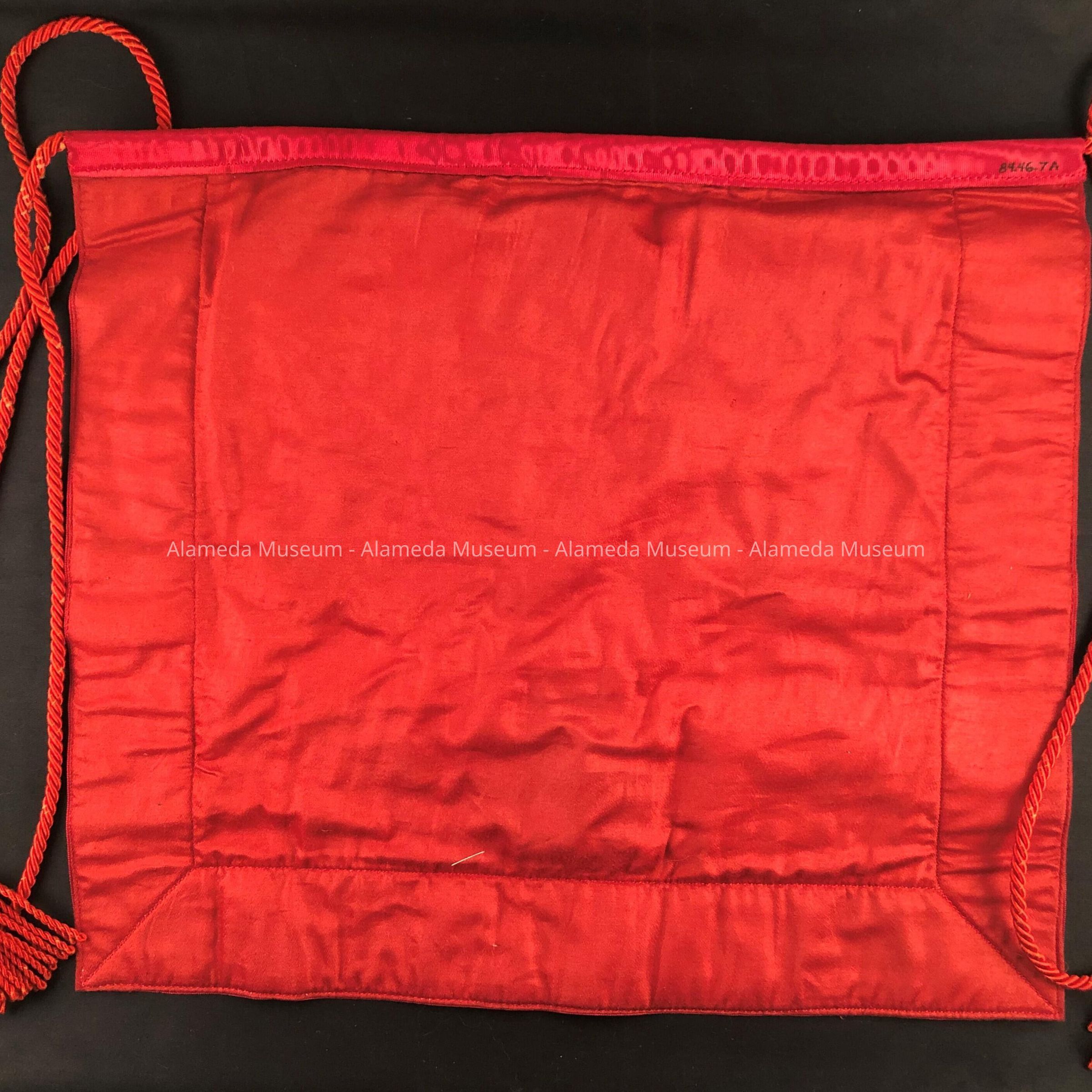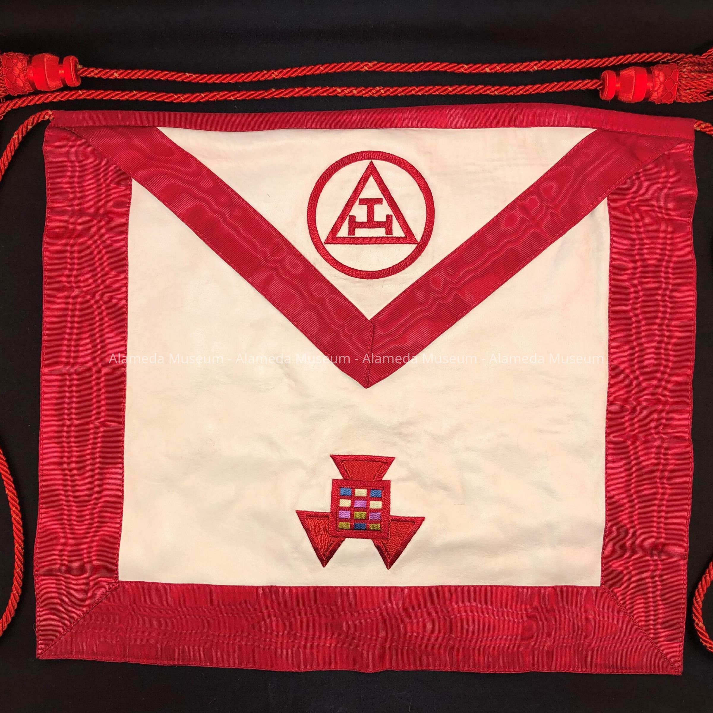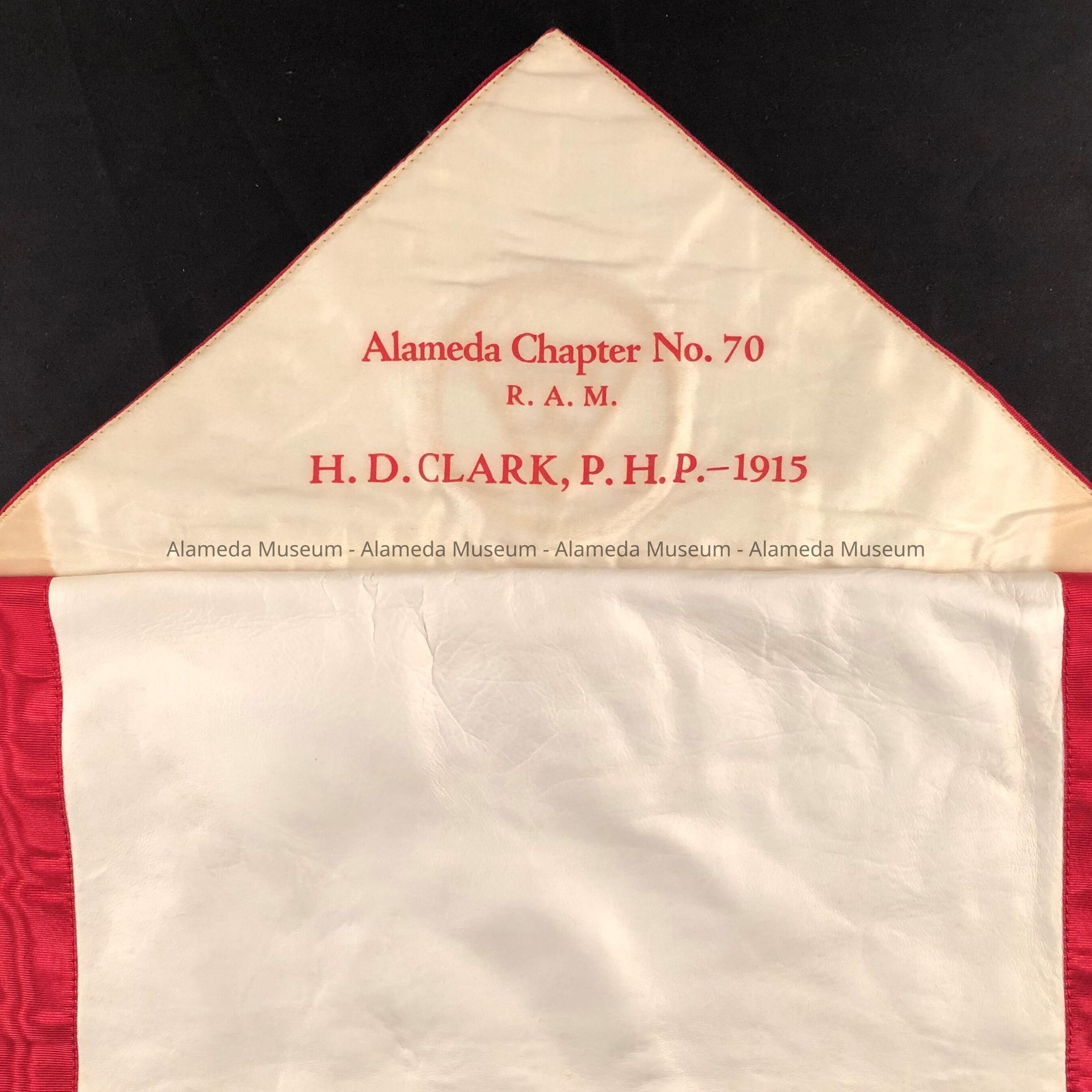 Masonic apron of white kid trimmed in red colored moire silk and embroidered in red silk thread with Masonic symbols. Printed (in red type) to the underside of a triangular flap is the caption "Alameda Chapter No. 70 R. A. M., H. D. Clark, P.H.P.-1915". Apron is tied to the waist by red colored silk cord ending in tassels.