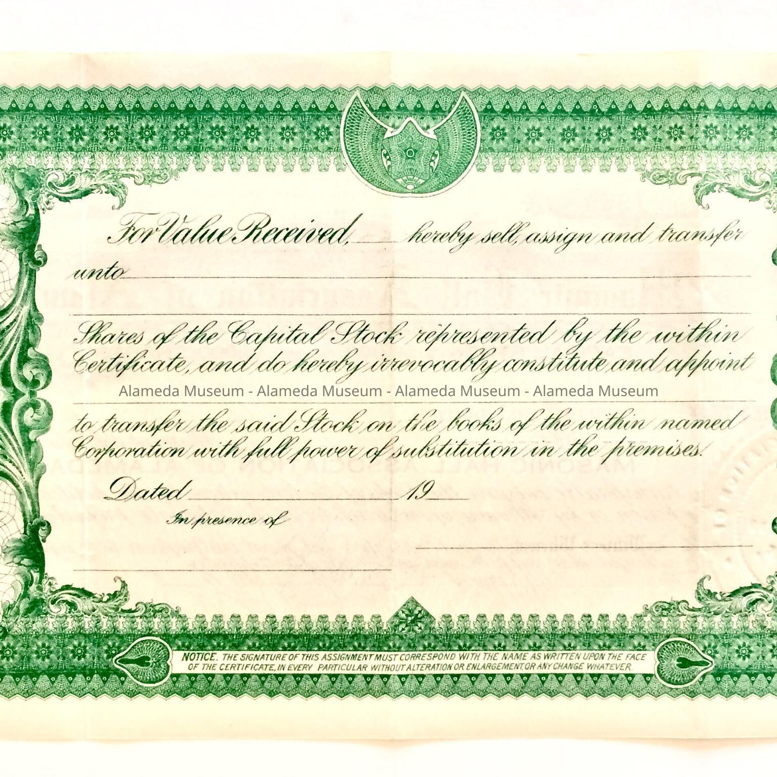 History of Object: A Masonic Hall Association of Alameda stock certificate from the estate of James Z. Nelson.