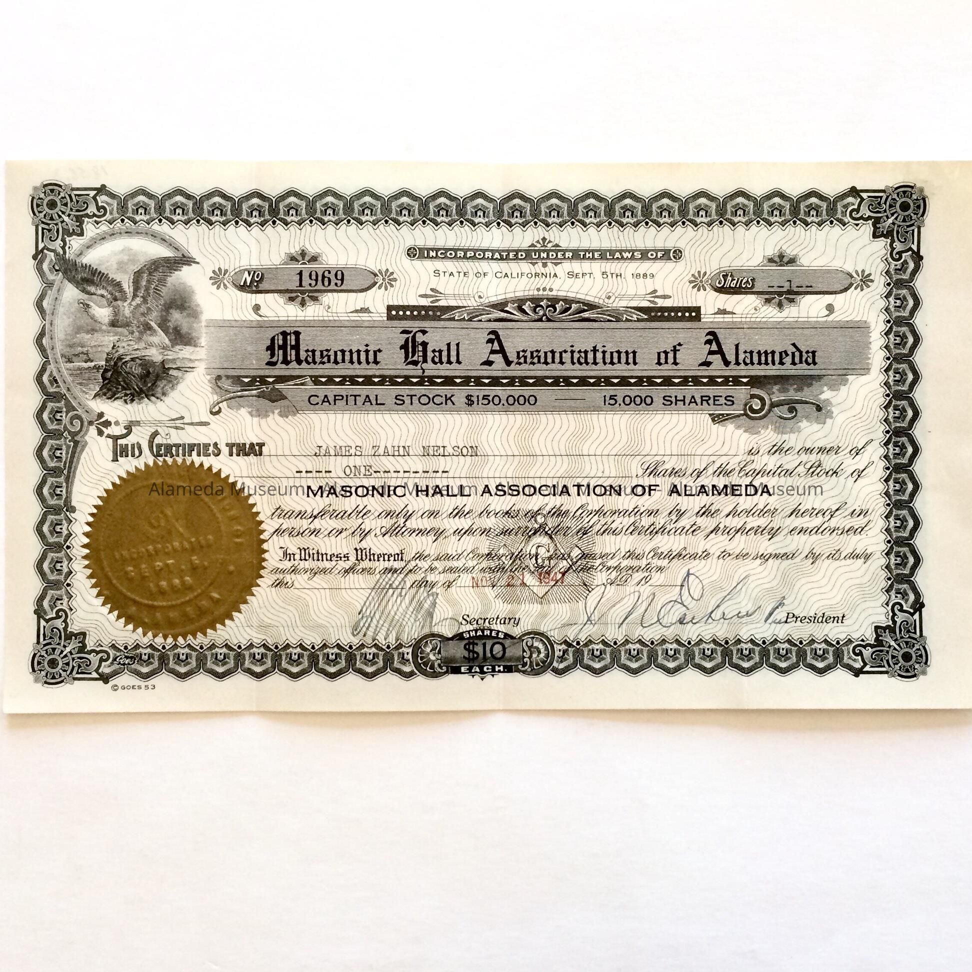 Description: An engraved stock certificate with black lettering and designs, with wavy red security lines. A gold Masonic Lodge seal is affixed to it. The certificate is imprinted "Masonic Hall Association of Alameda", with the name "James Z. Nelson", and "one" share of stock typewritten within.