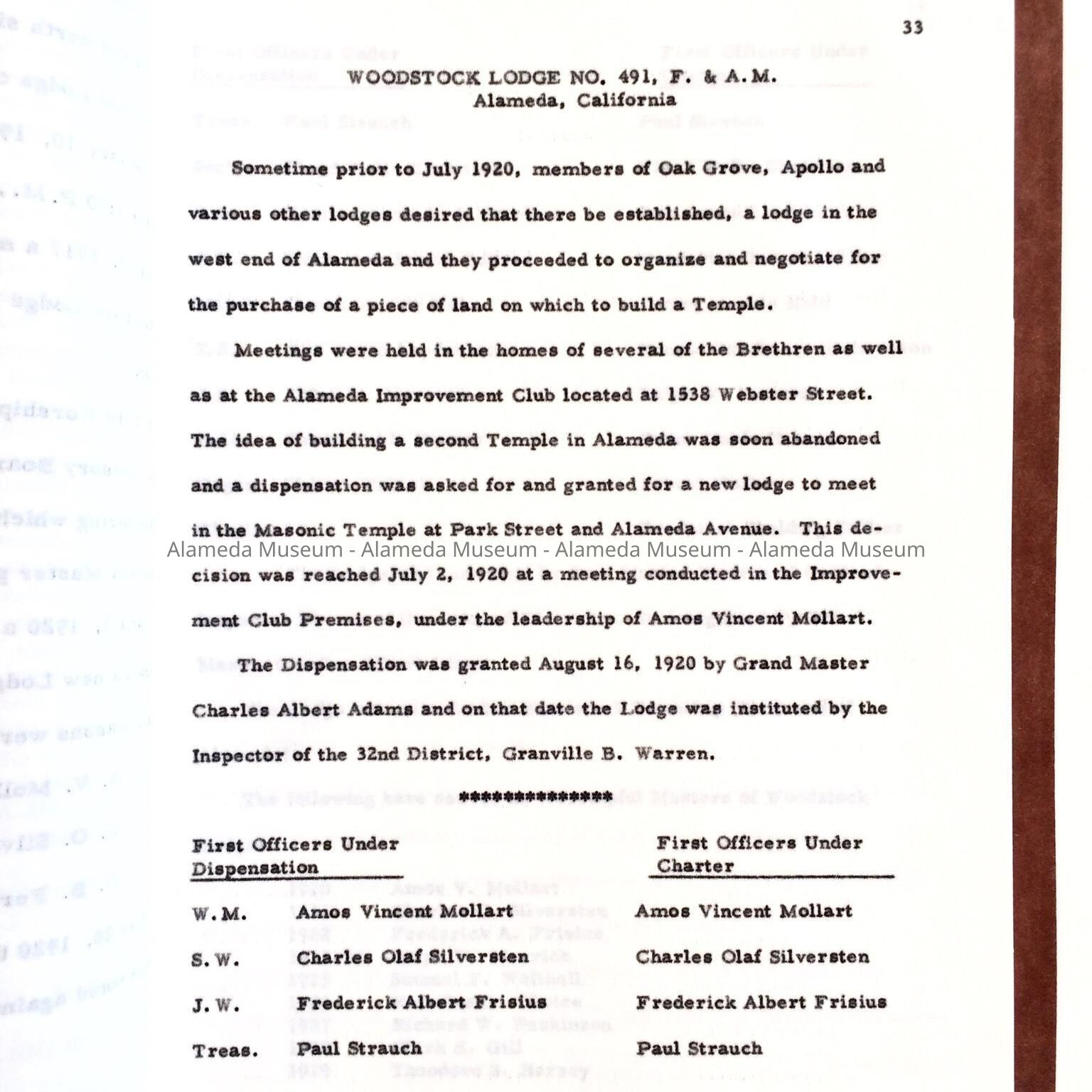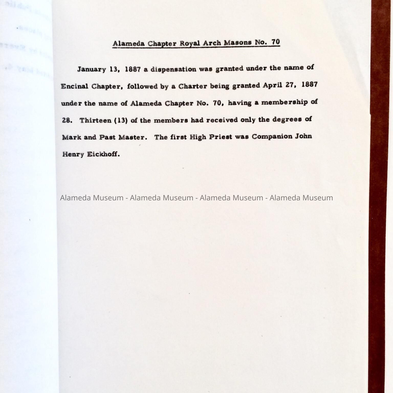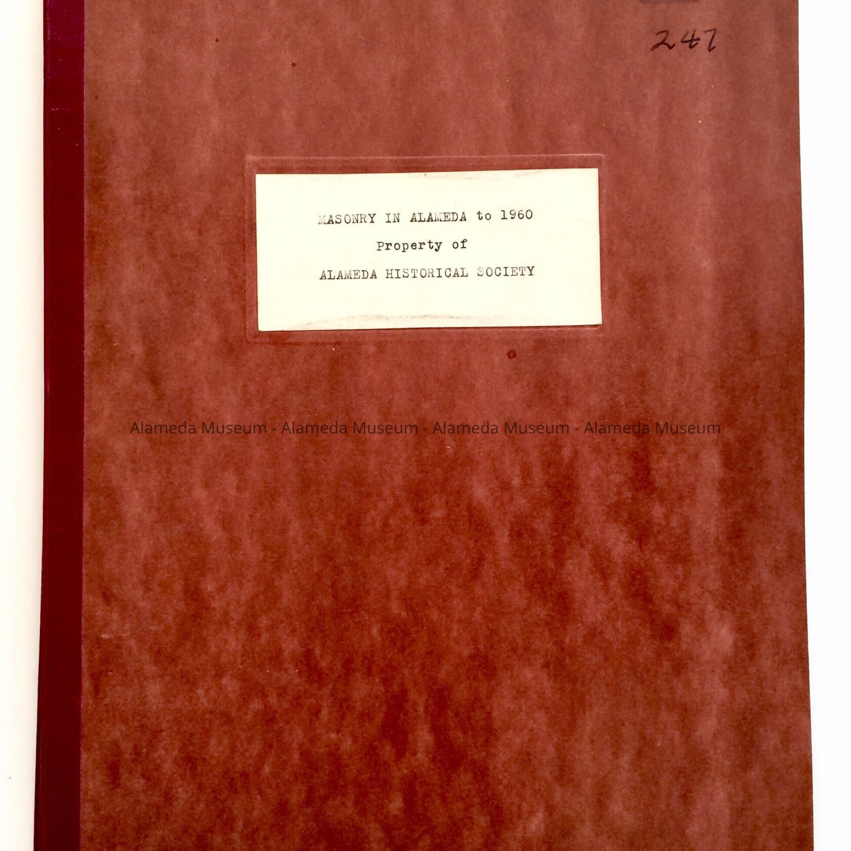Description: Forty-three page carbon copy history contained in a loose leaf soft cover jacket. The Jacket (or coverlet) is brown colored tagboard. Cover has typewritten caption on white colored paper "Masonry in Alameda to 1960".
