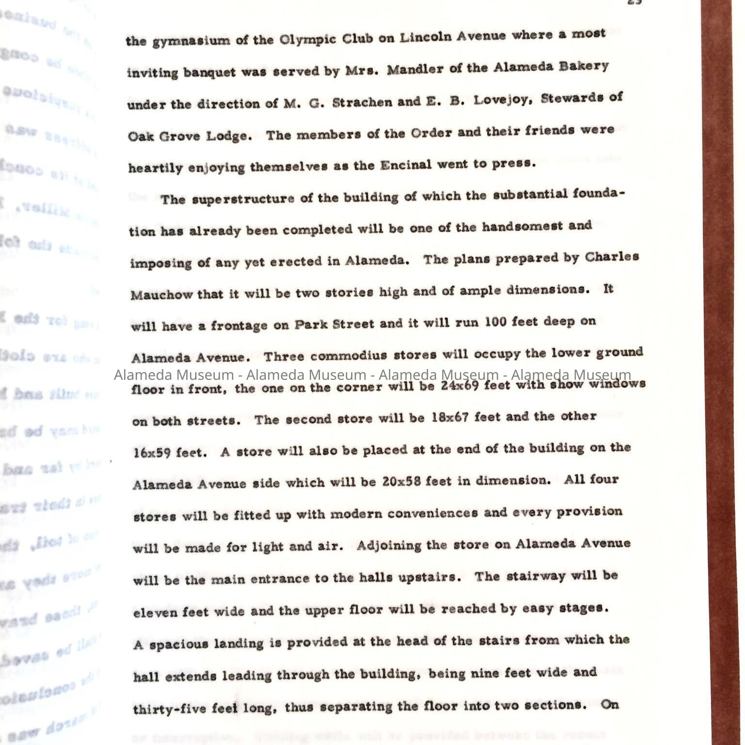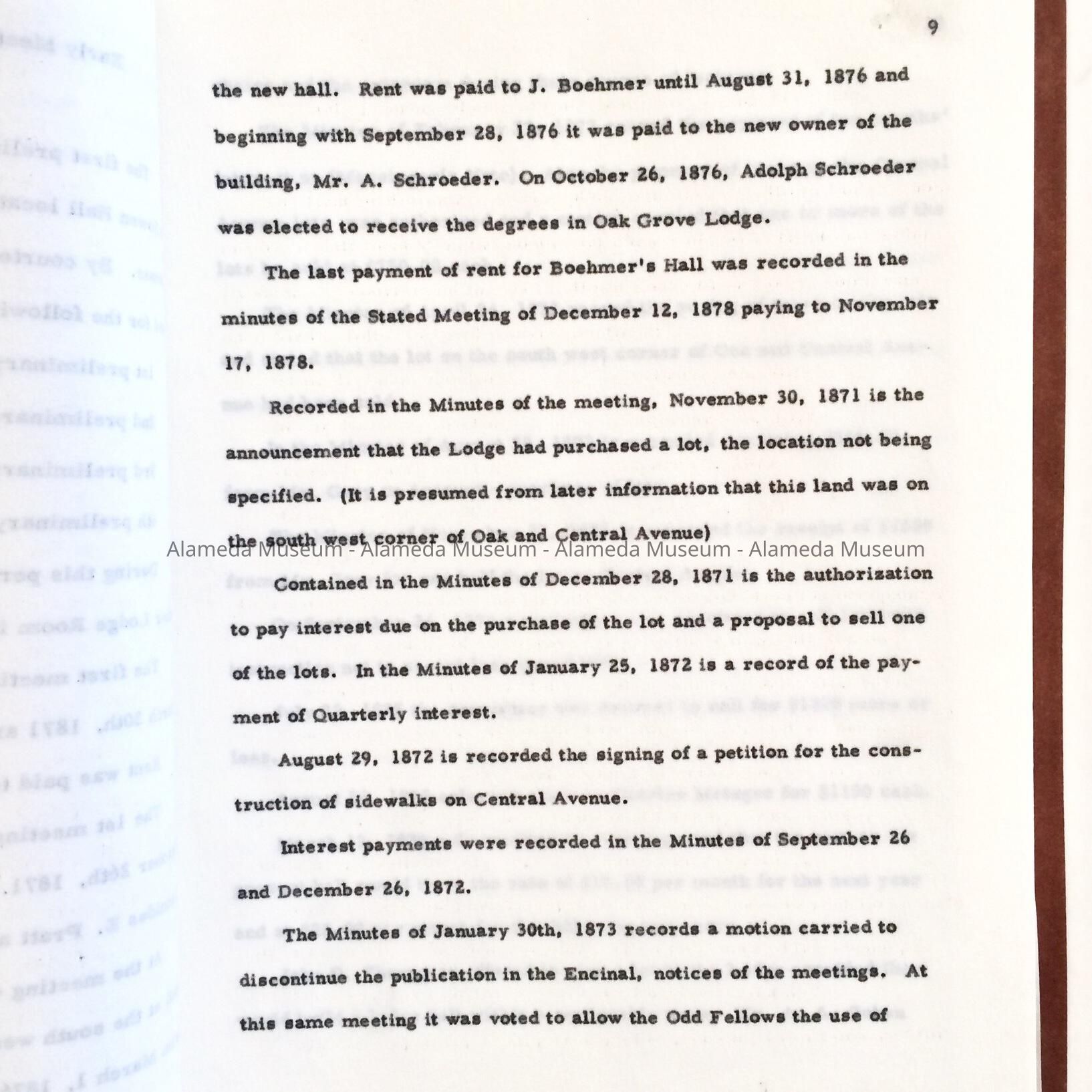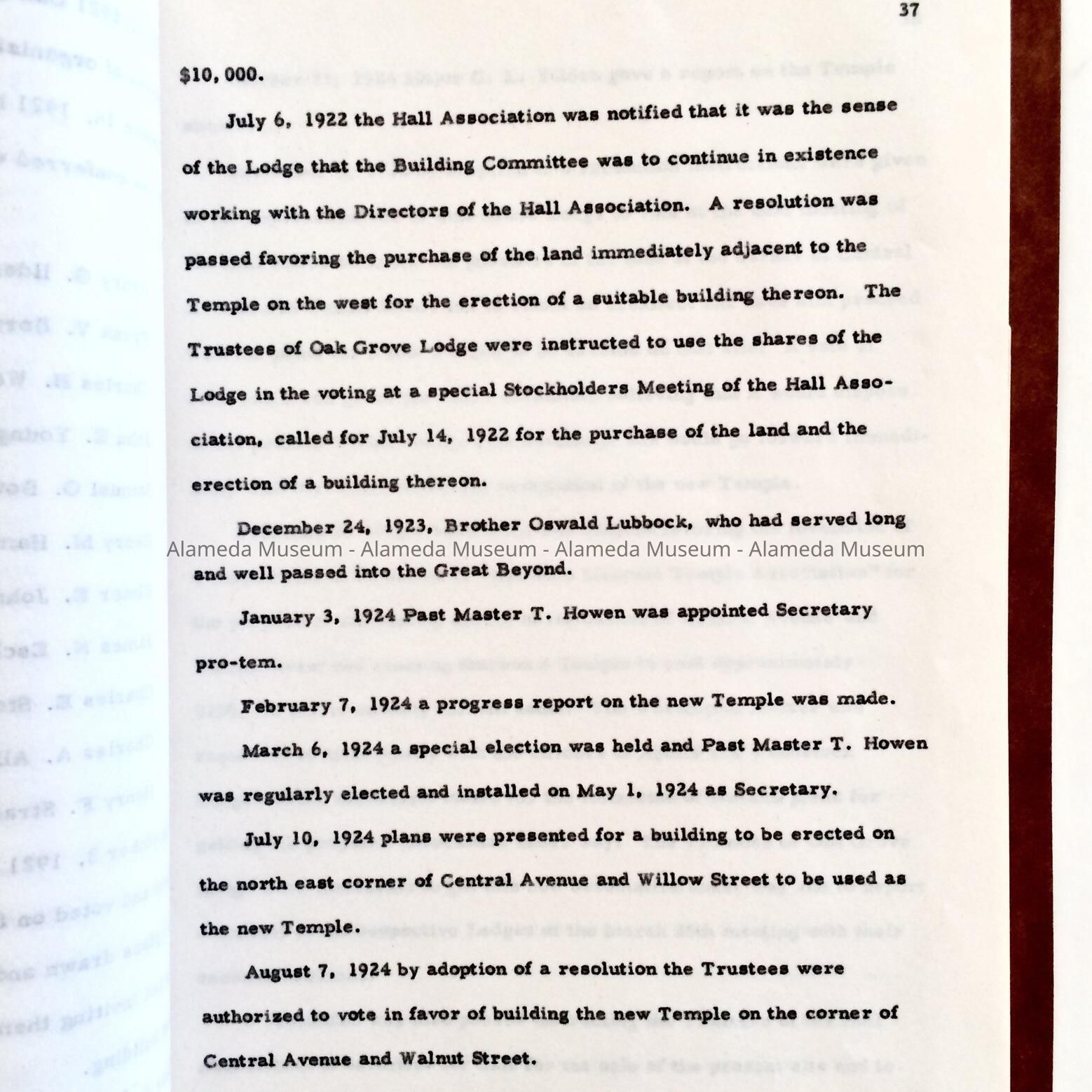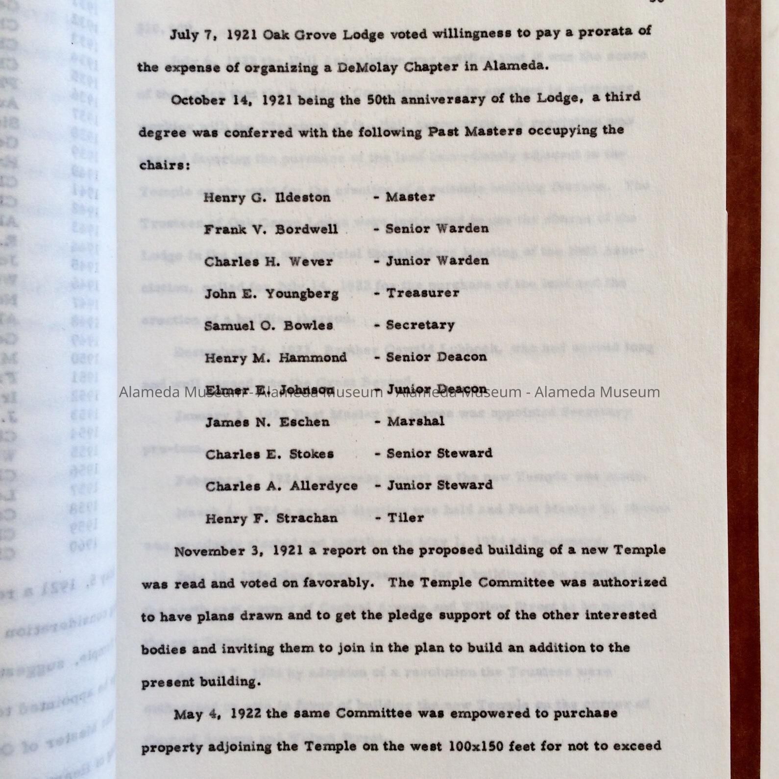 Description: Forty-three page carbon copy history contained in a loose leaf soft cover jacket. The Jacket (or coverlet) is brown colored tagboard. Cover has typewritten caption on white colored paper "Masonry in Alameda to 1960".