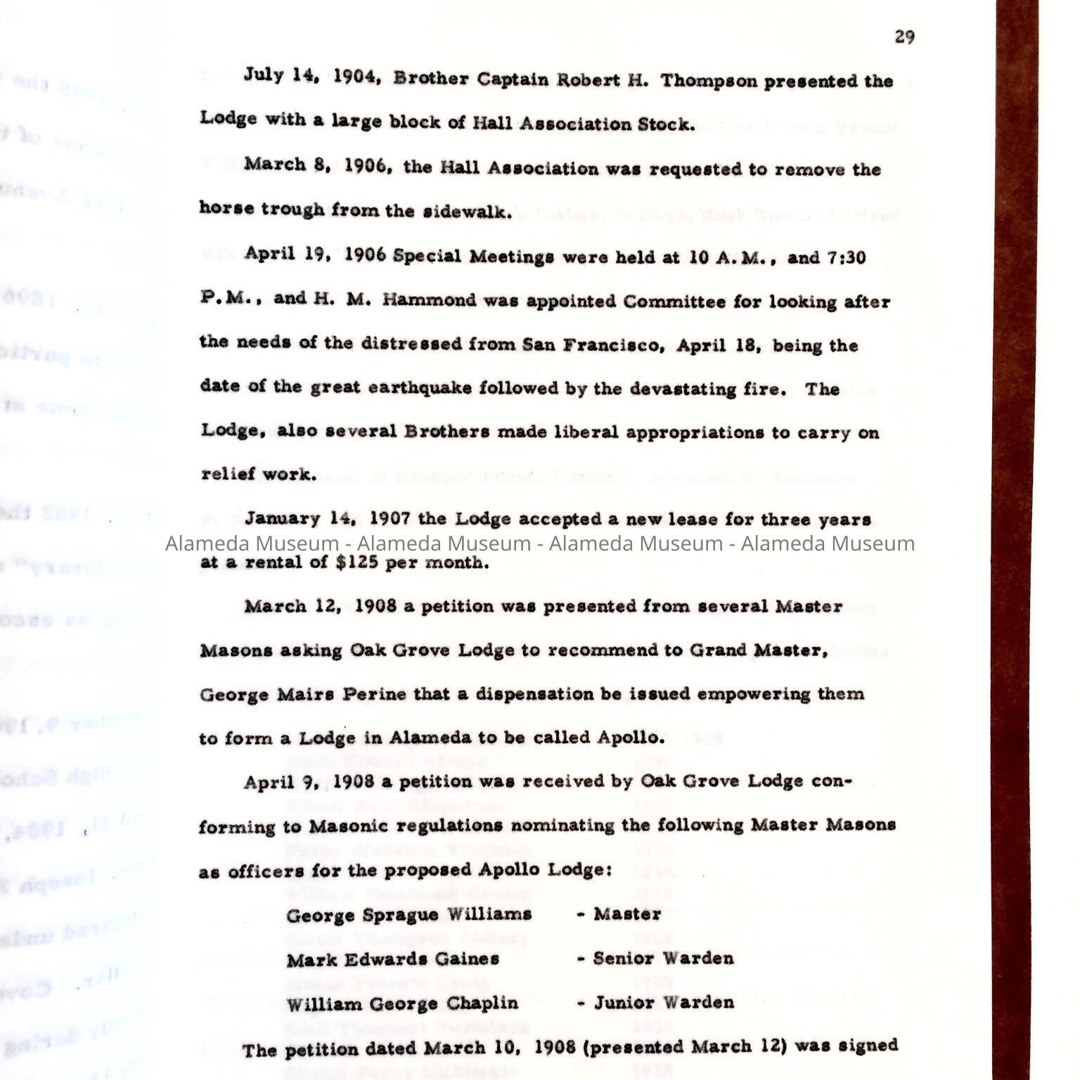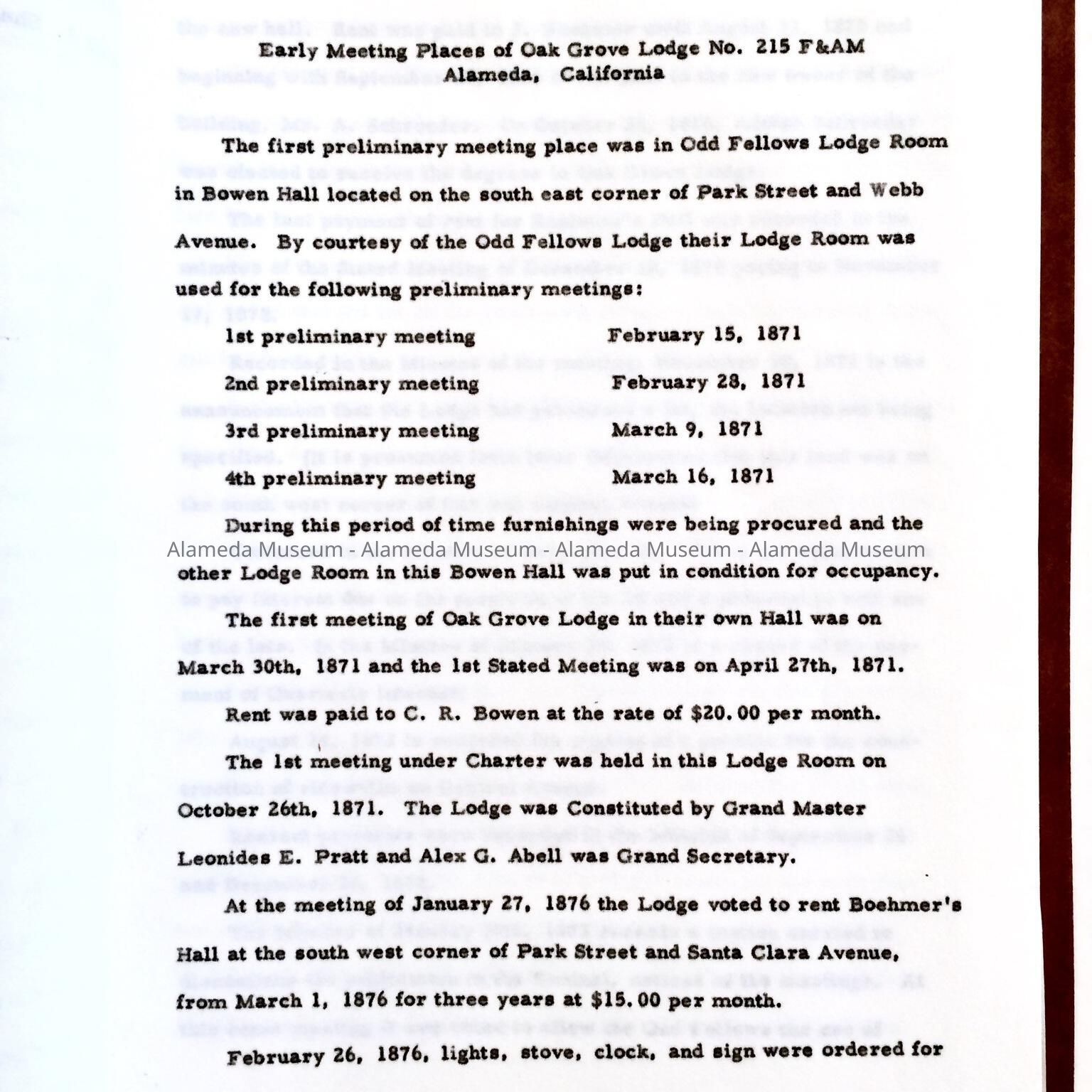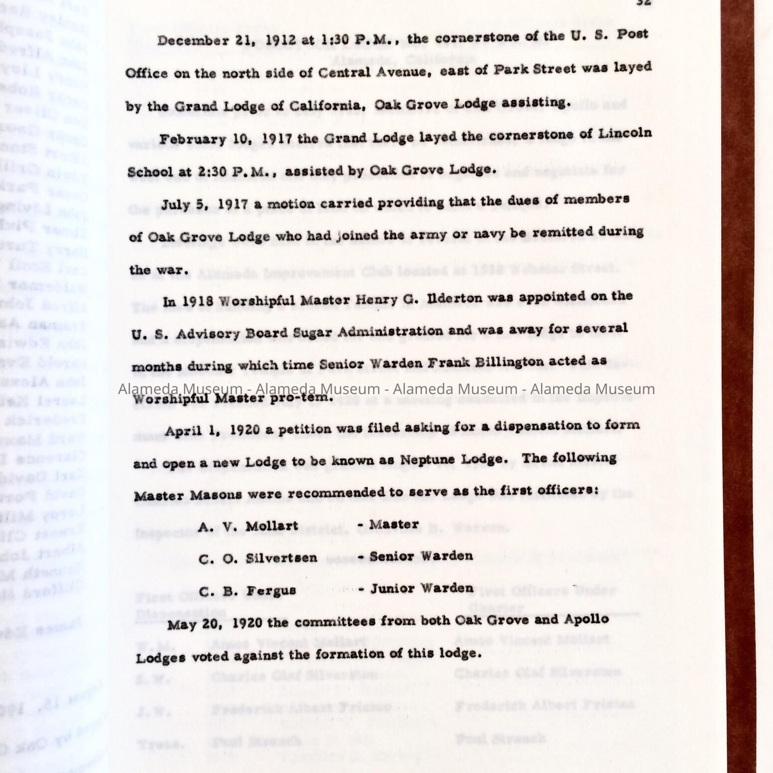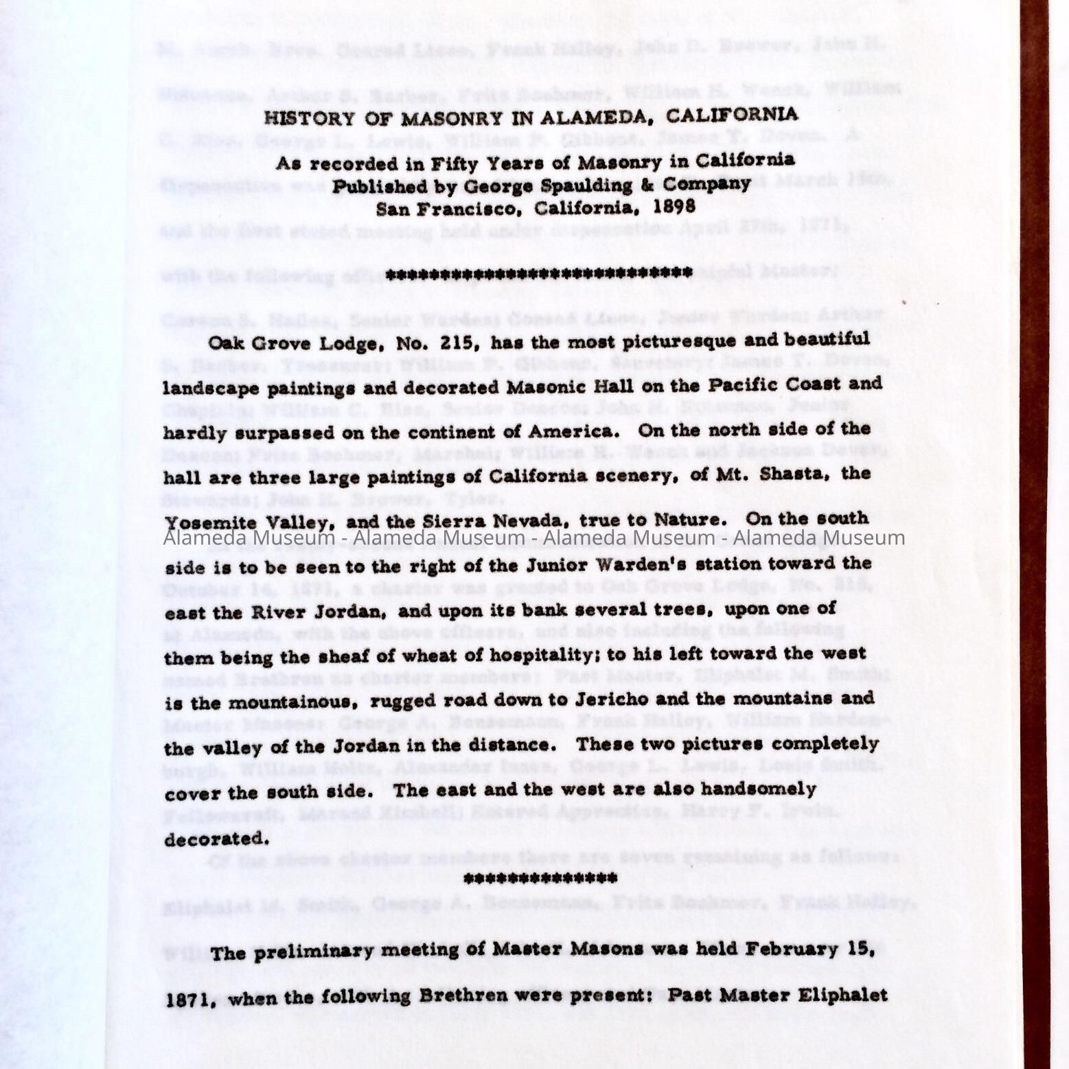 History of Object: Publication entitled "Masonry in Alameda to 1960" compiled by Everett Farwell. Included is a chapter devoted to the dedication of the original Masonic Hall erected in 1890 on the corner of Park St. and Alameda Ave.