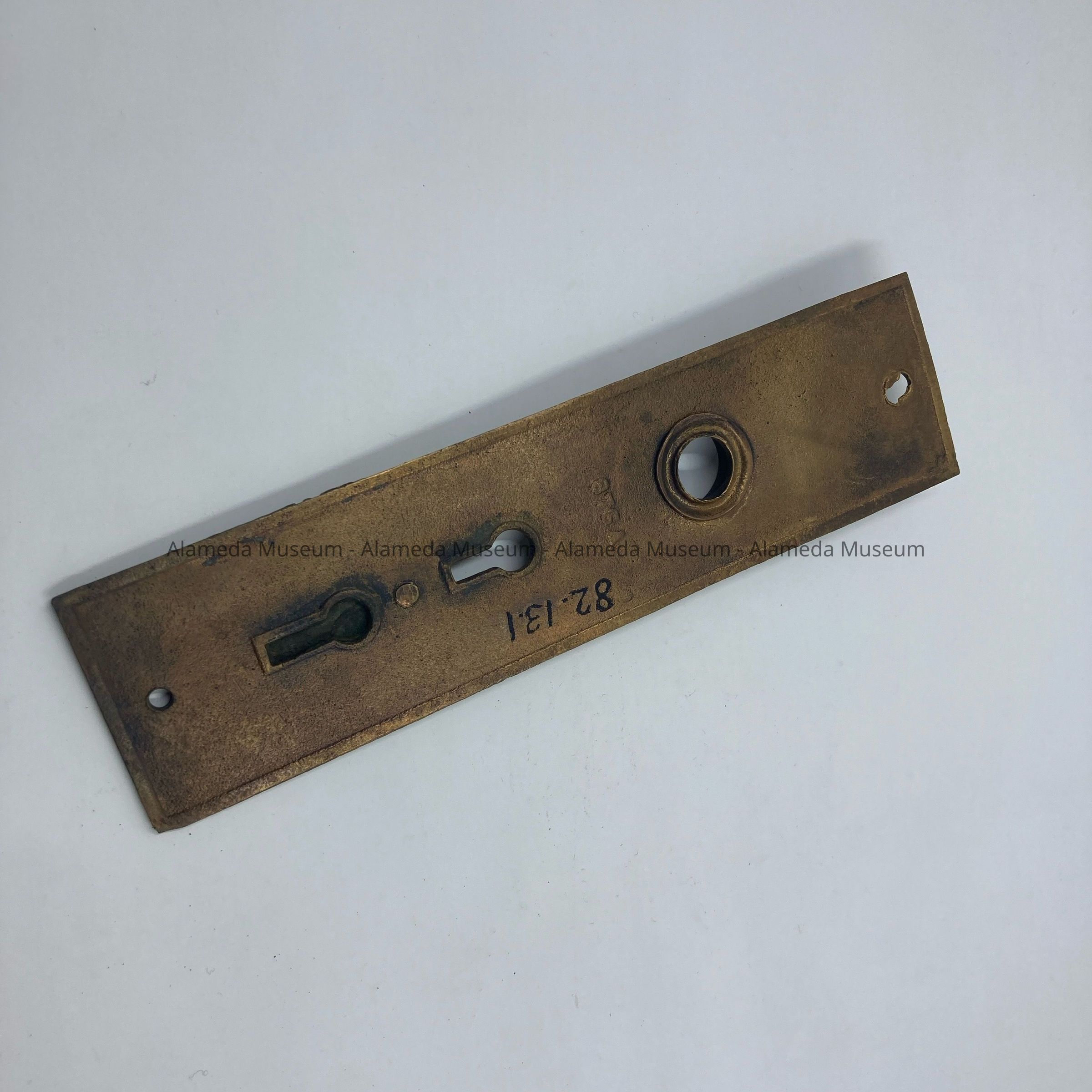 History of Object: Master front door escutcheon from 1807 Santa Clara Avenue, demolished April, 1982. The house was erected in 1891, by A. W. Pattiani, architect and builder, for Geo. Shreve, a S. F. gun dealer. The escutcheon was found in the yard of the house following demolition by the donor, who was using a metal detector. It appeared to have been in the ground for some time, possibly thrown there during remodeling.