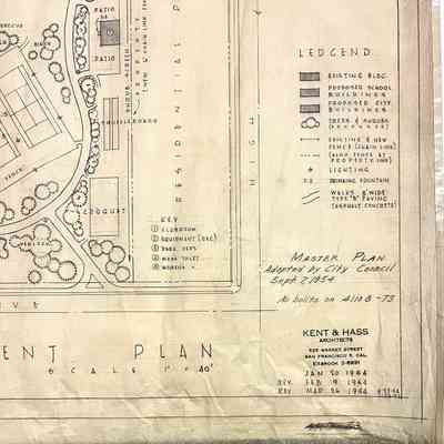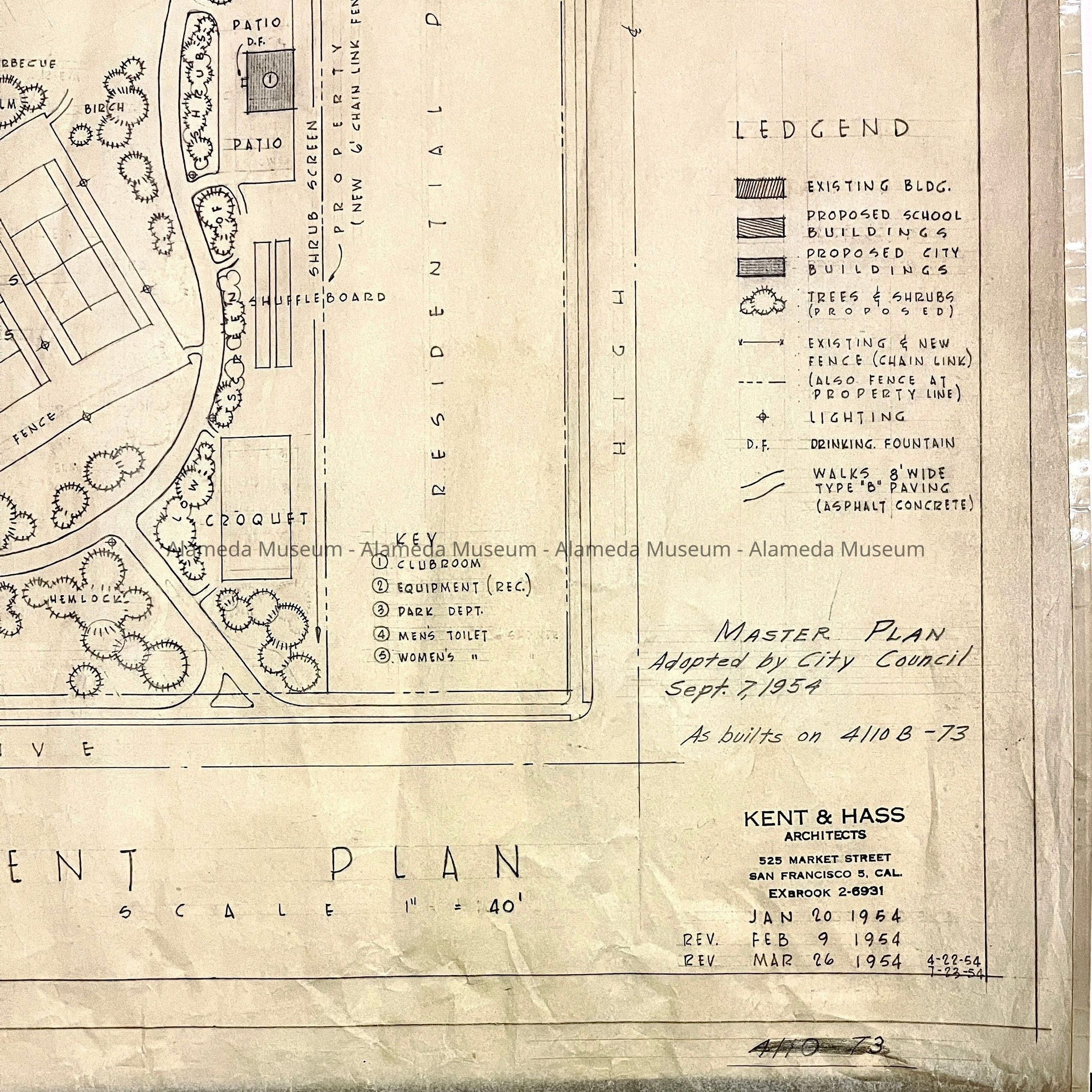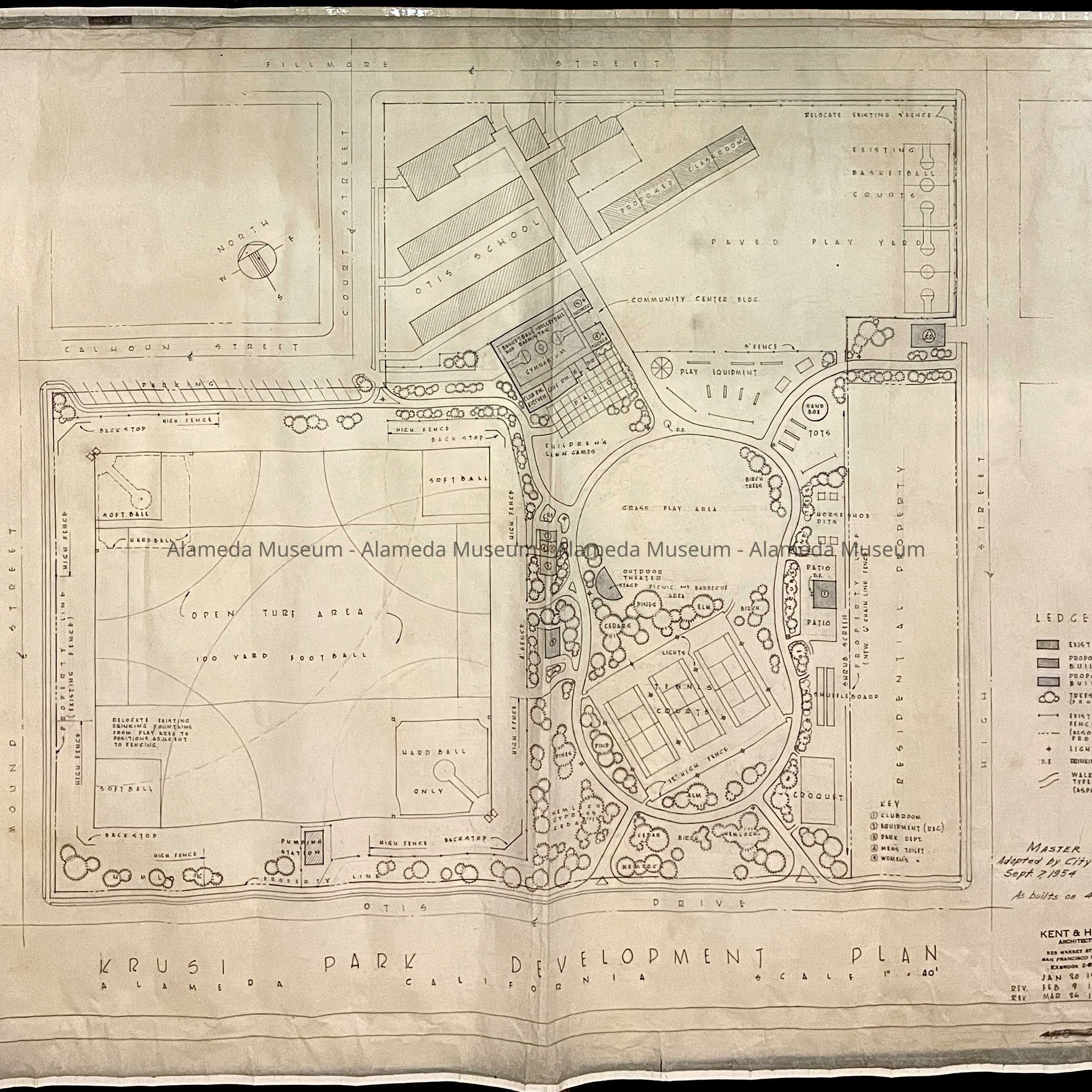 HISTORY OF OBJECT: A MASTER PLAN FOR THE DEVELOPMENT OF THE KRUSI PARK ADOPTED BY THE ALAMEDA CITY COUNCIL, SEPTEMBER 1954. THE PLANS WERE DRAWN BY KENT & HASS, SAN FRANCISCO, CA.