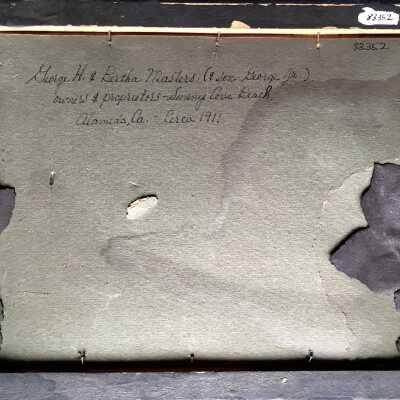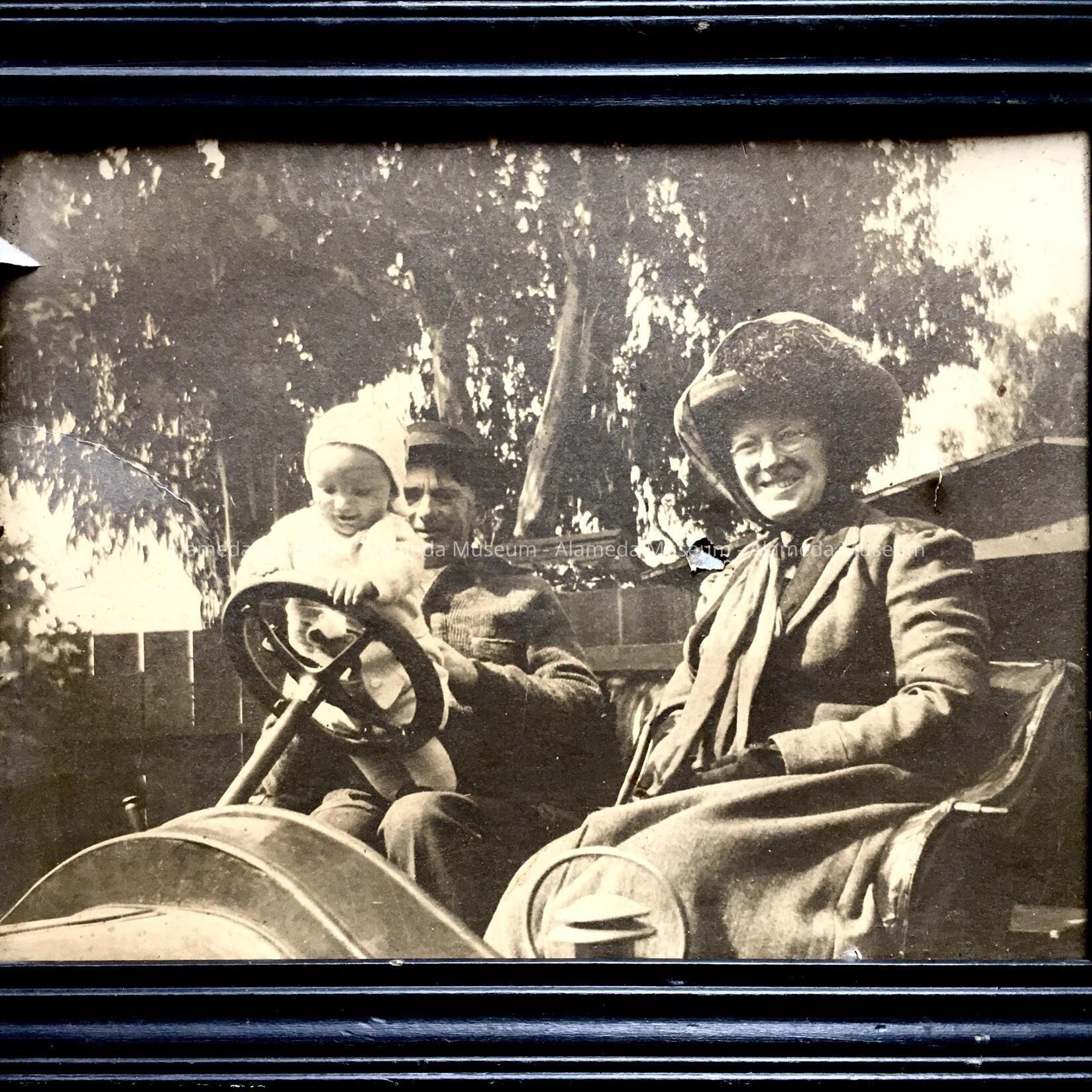 History of Object: Photograph of George H. & Bertha Masters (& son George Jr.), owners and proprietors, Sunny Cove Beach, Alameda, Cae, circa 1911. The photo depicts the family sitting in the front seat of their automobile, at Sunny Cove Beach.