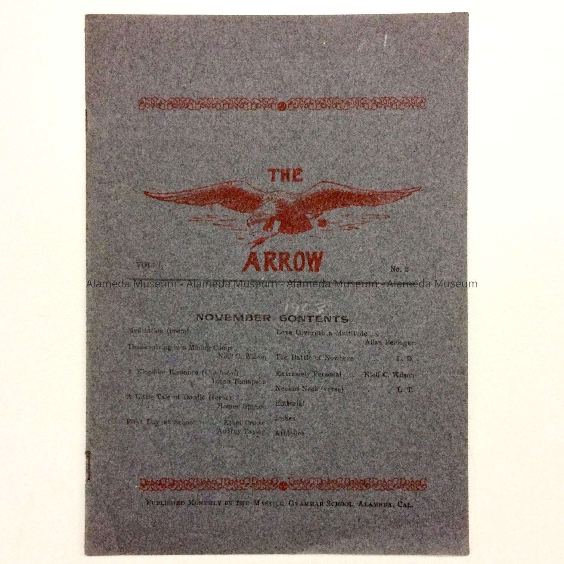 History of Object: Booklet "The Arrow," published monthly by the Mastick Grammar School, Alameda, for Nov., 1904. Contents; school events, articles by student body members, etc.