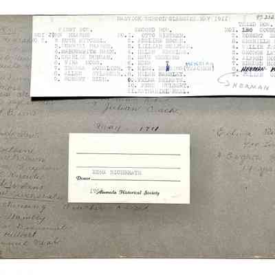 Description: Sepia-toned photo, mounted on charcoal paperboard. Photographer: Hugo Weitz, Fruitvale, CA (per imprinting in silver on the mounting). The image is damaged by white identifying numerals and a typed white description label overlapping its bottom edge, over the mounting. An old green cataloging label is glued to the upper left corner of the mounting.