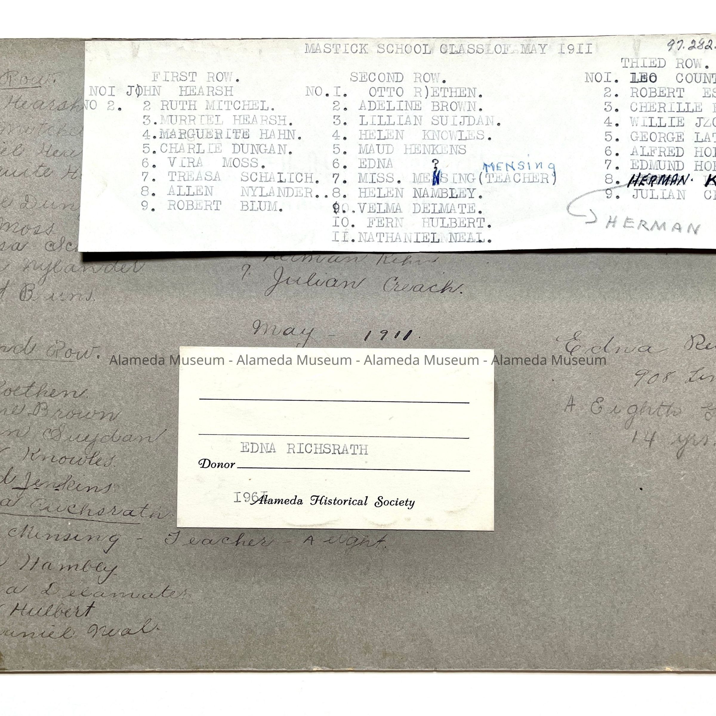 History of Object: Mastick School Class of 1941, posed outdoors. The class members are identified on the verso.
