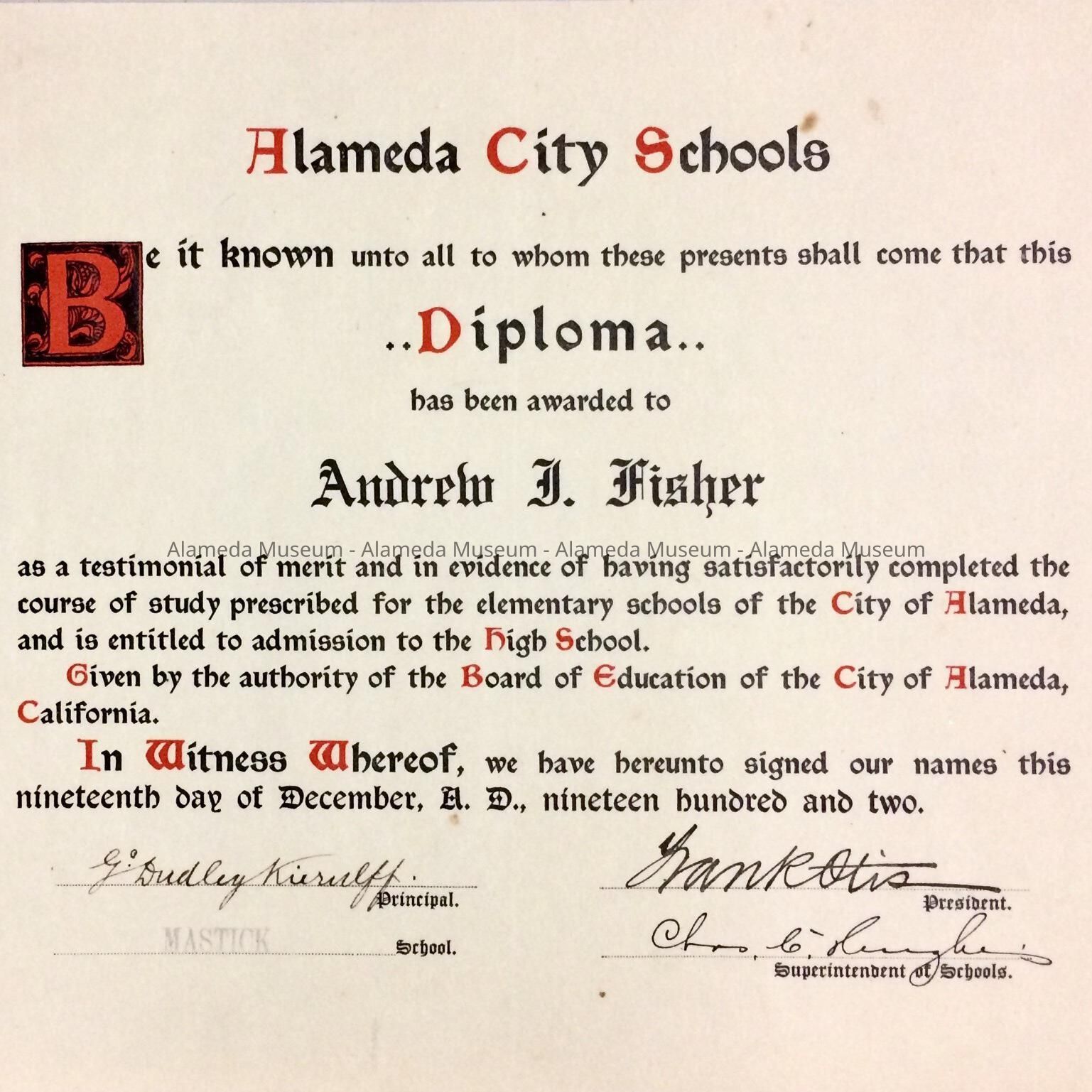 History of Object: Diploma awarded Andrew T. Fisher, December 10. 1902 from Mastick Elementary School, Alameda.