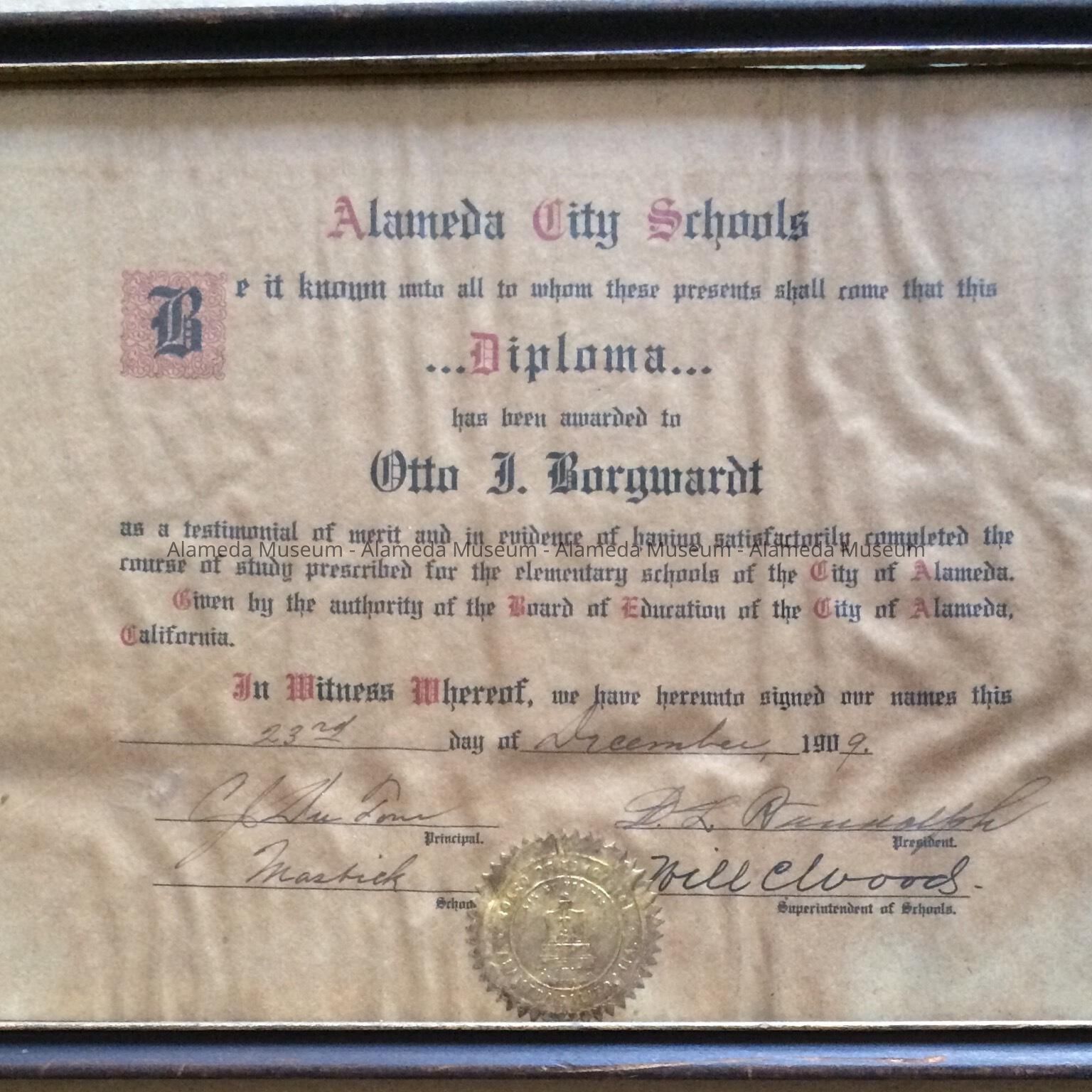 Description: Brown wooden frame enclosing a parchment paper diploma with gold seal of the Alameda School Department.