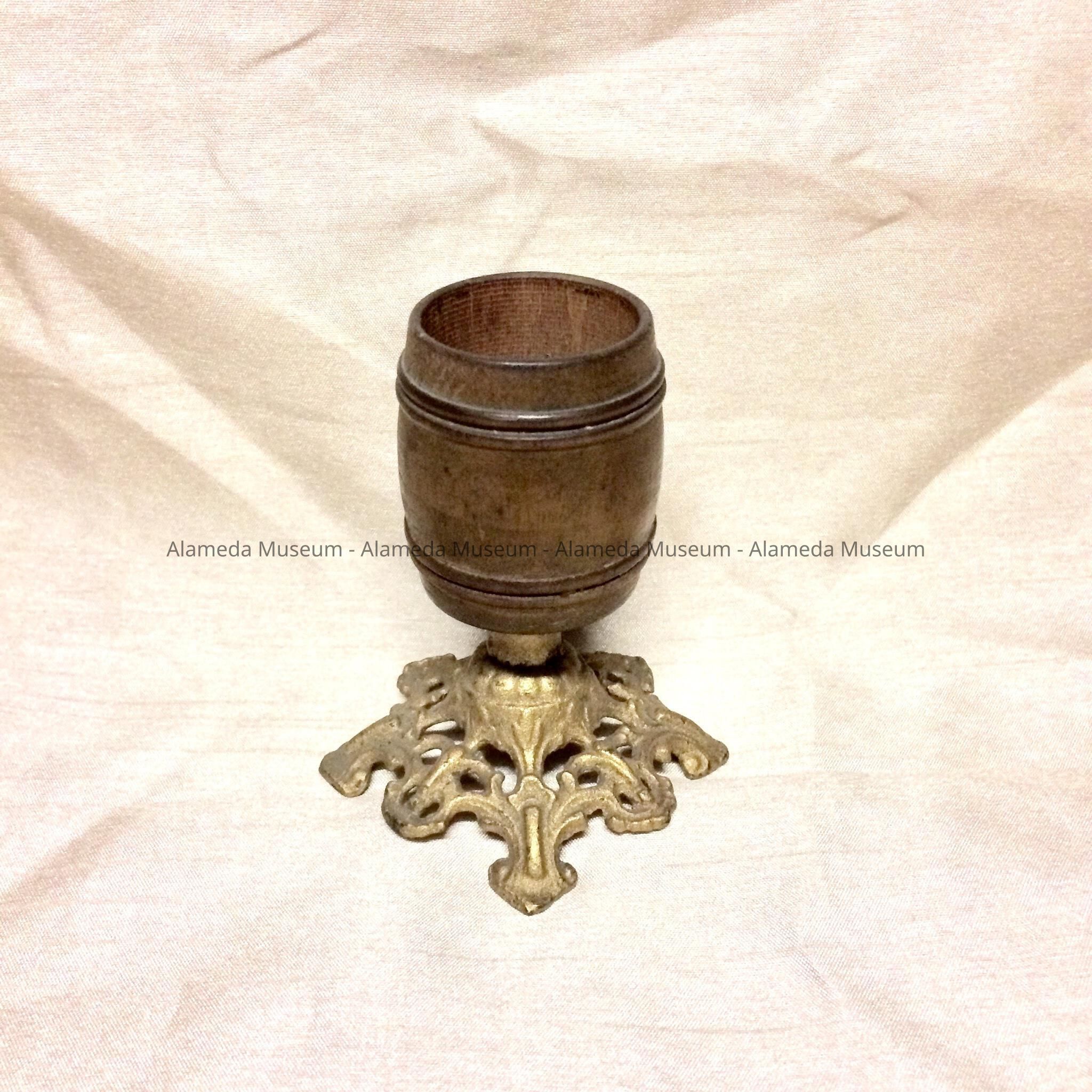 Description: A miniature wooden barrel supported by a pedestal of reposé patterned iron. The pedestal has its original gold finish. The container section is of natural wood with a varnish finish.