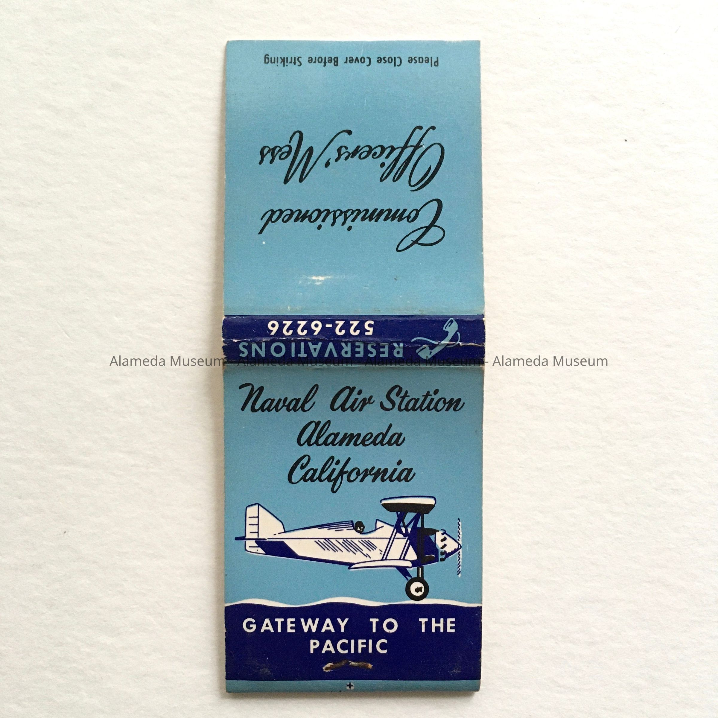 Description: A matchbook cover with a bright blue background with navy blue and white design, stating on the flap: 'Commissioned Officers' Mess', and on the back: 'Naval Air Station Alameda California', a design of a biplane, and 'Gateway to the Pacific'. On the spine: Reservations 522-6226 and an image of the horn of a rotary-type telephone. No matches left, but base remnant is stapled in place.