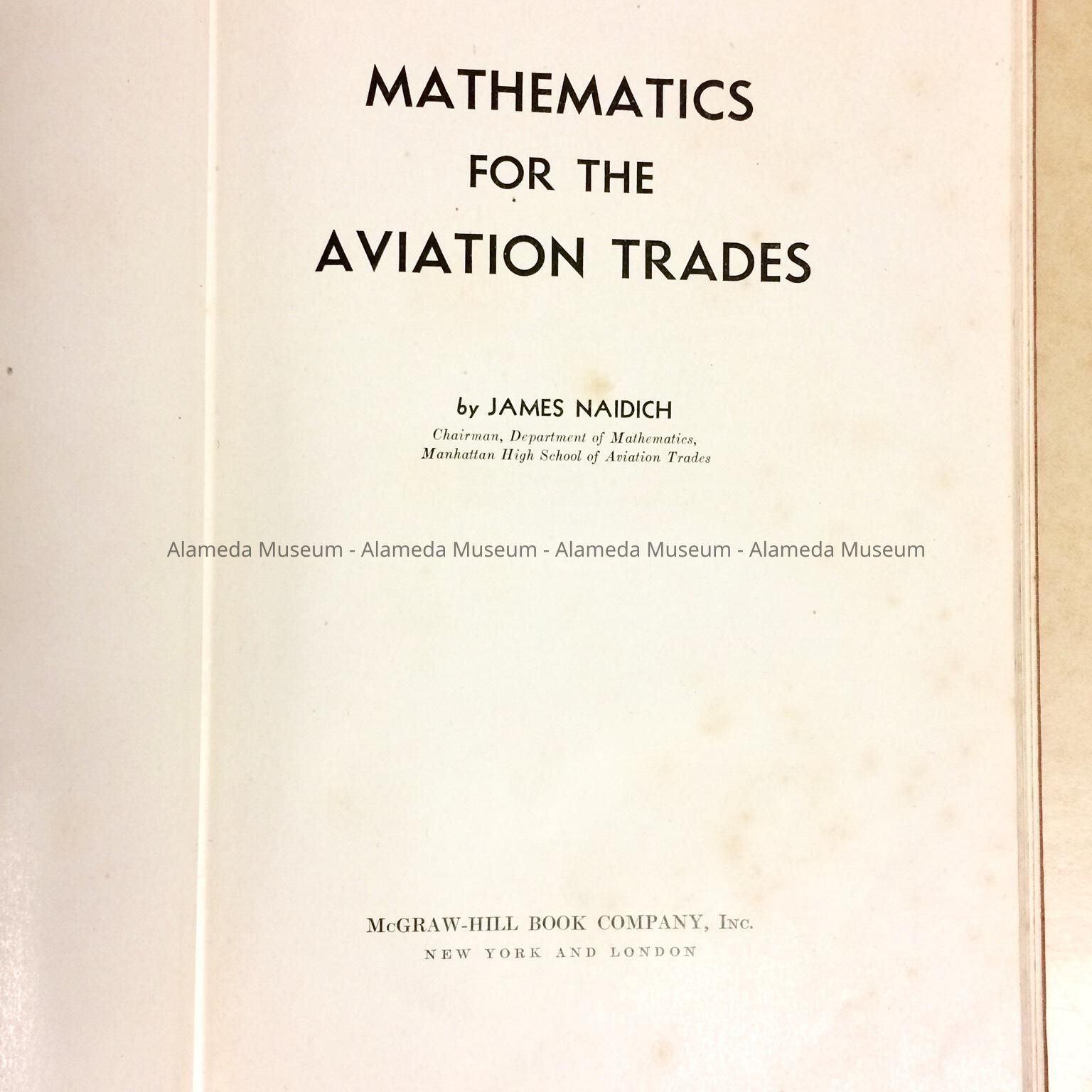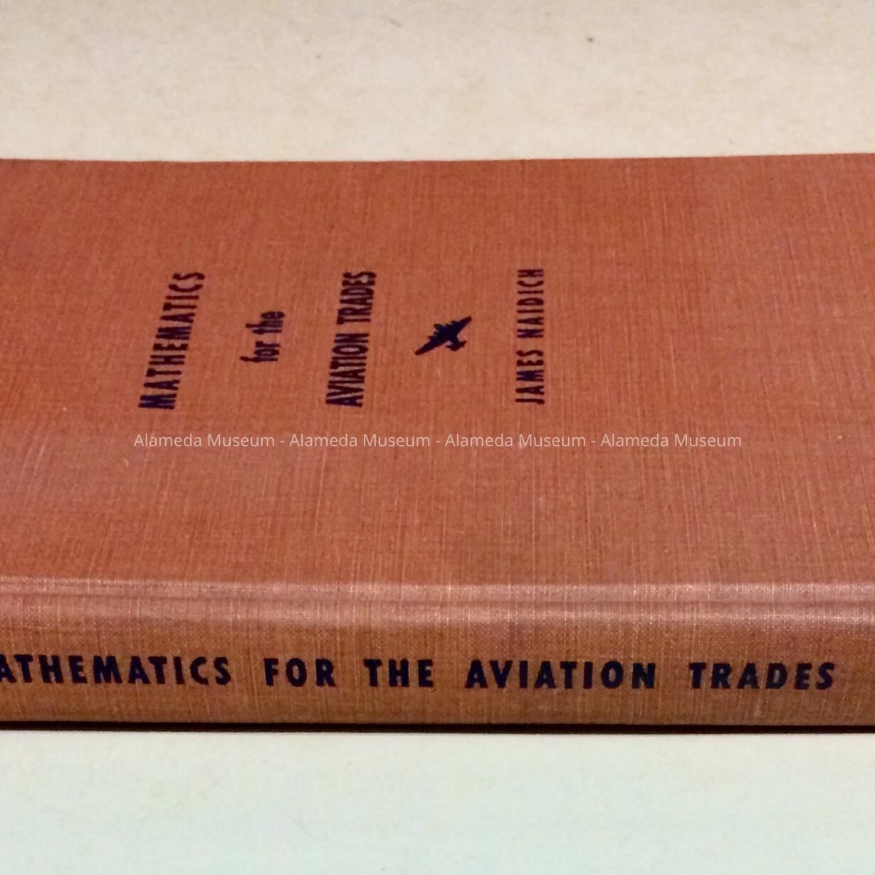 Description: Hardbound book with a brown buckram cover, title in blue-colored type "Mathematics for the Aviation trades," by James Naidieh. Contents: text and diagrams.