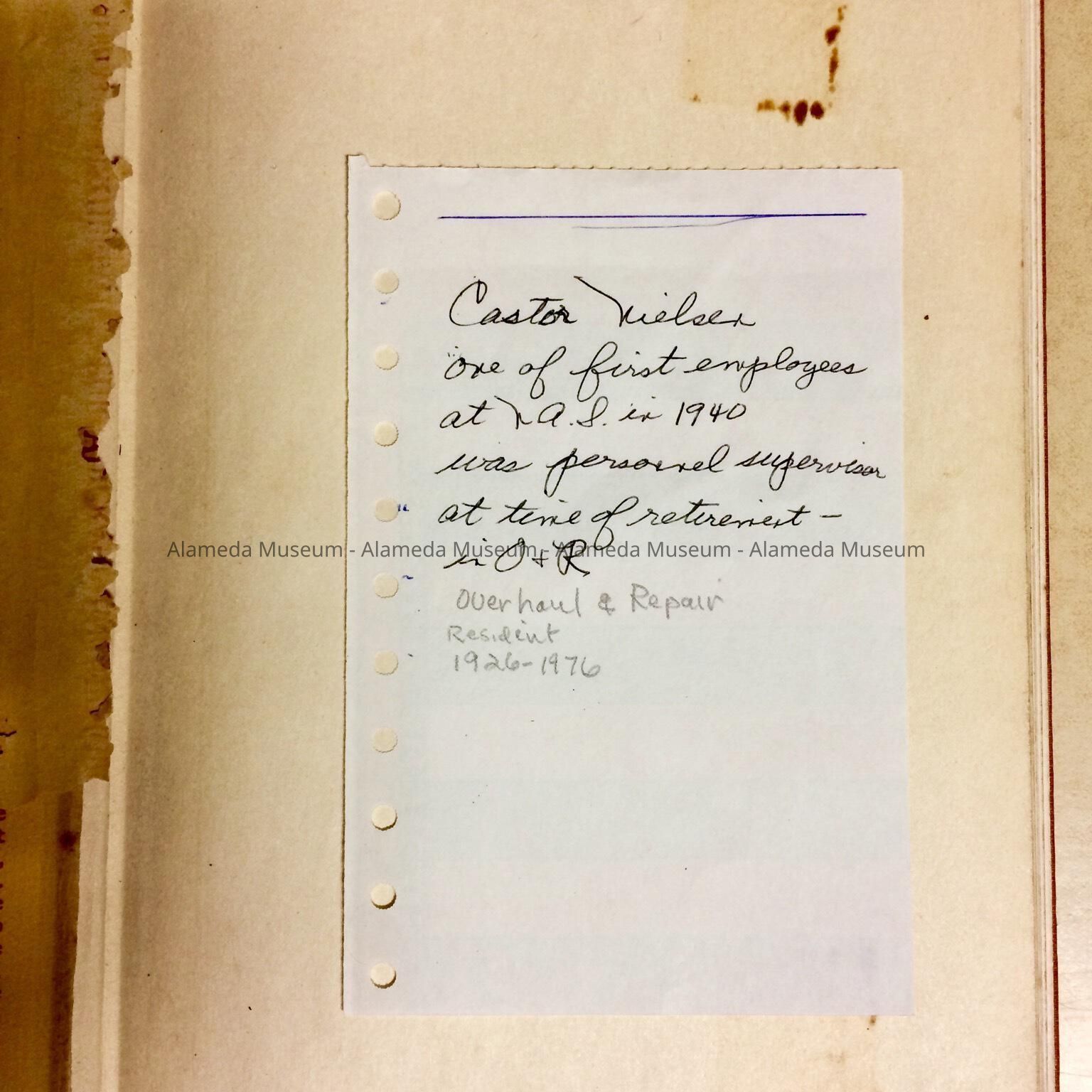 History of Object: Textbook used by Castor Nielsen, employee of the Naval Air Station. Textbooks used in civilian training classes for air mechanics for Naval Air Station in 1942-43. Castor Nielsen was coordinator with the Base and school. A longtime resident of Alameda, he was hired as an air mechanic in April 1941 and retired as a personnel supervisor in 1959.