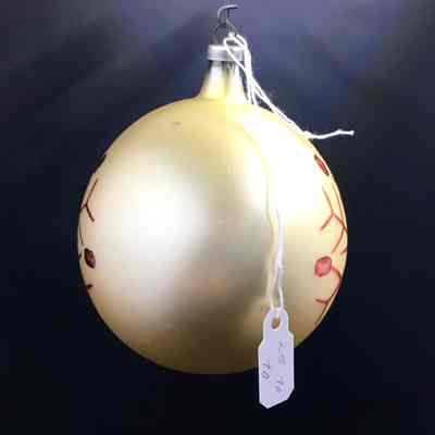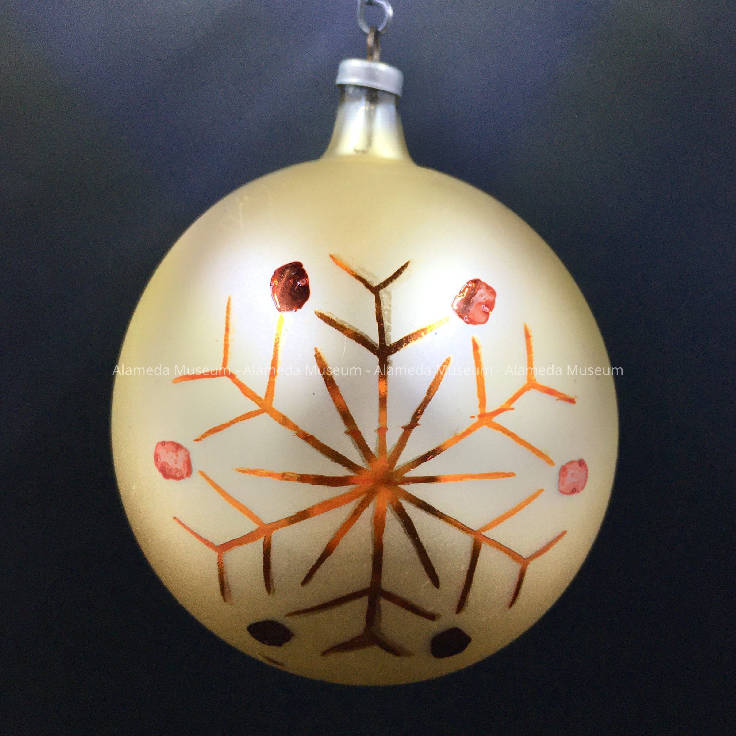 Description: A spherical ornament of matte ivory colored glass, with a decoration, repeated once, of red metallic lines forming a snowflake, and six red dots. There is an inscription on the cap saying "Made in Austria".