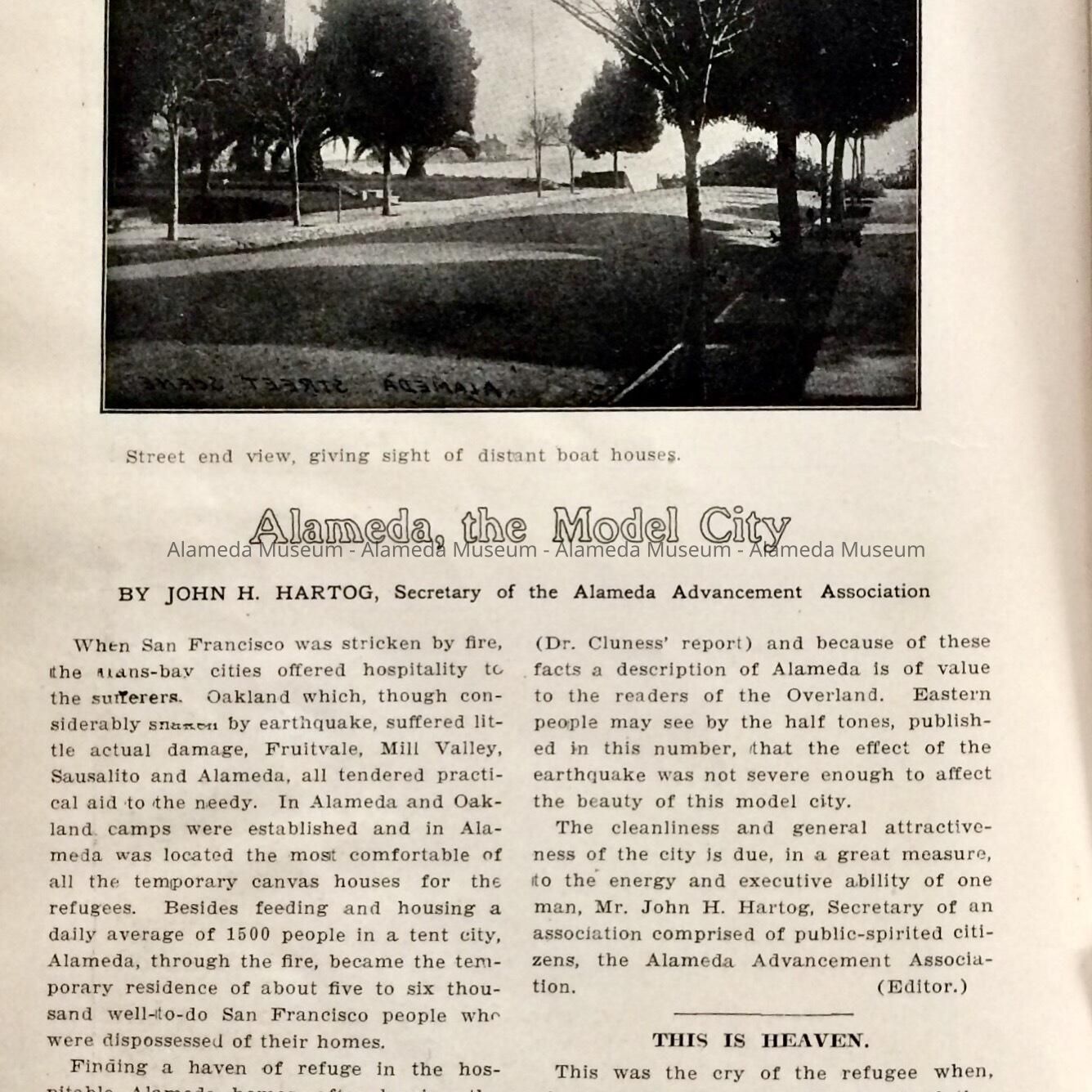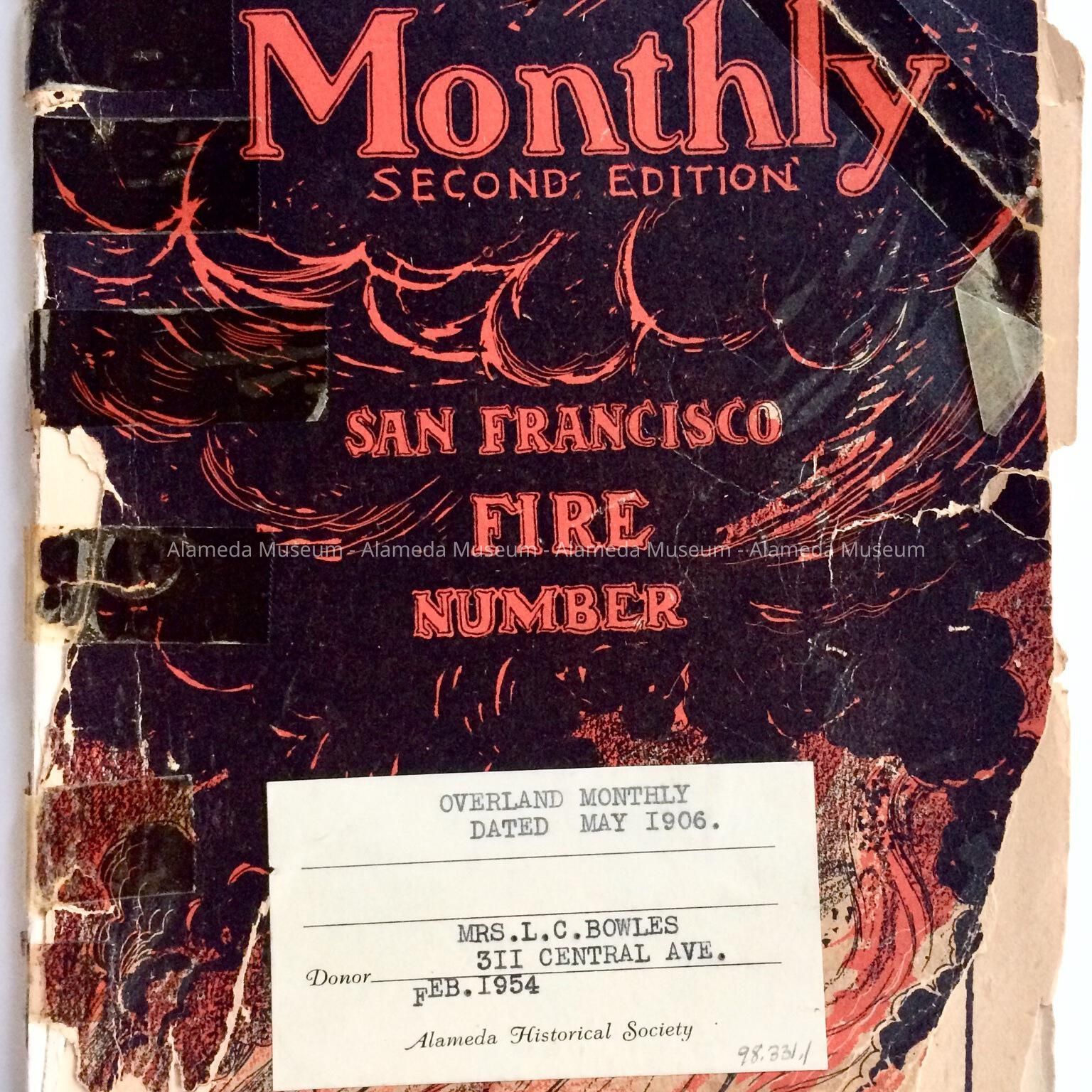 MAY 1906 ISSUE OF THE "OVERLAND MONTHLY" MAGAZINE, WITH ILLUSTRATIONS OF DESTRUCTION BY FIRE OF SAN FRANCISCO, CALIFORNIA, FOLLOWING THE 1906 EARTHQUAKE. AN ARTICLE TOWARD THE BACK OF THE BOOKLET IS ENTITLED, "ALAMEDA, THE MODEL CITY," AND IS PROFUSELY ILLUSTRATED WITH VIEWS OF ALAMEDA HOMES, CHURCHES, ETC. THIS COPY WAS GIVEN TO THE ALAMEDA HISTORICAL SOCIETY IN 1954 AND NOT OFFICIALLY CATALOGED AT THAT TIME.