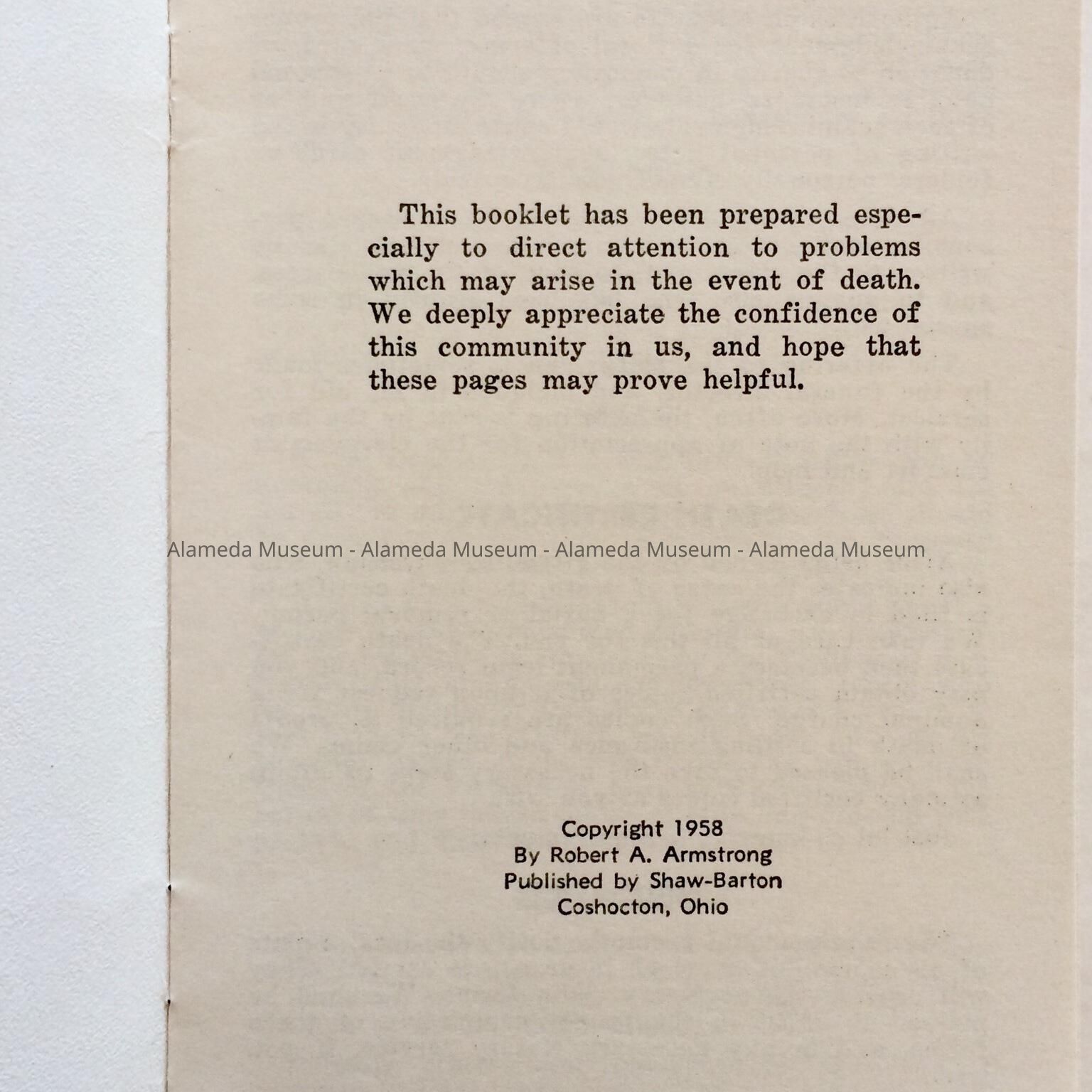 Booklet giving information to the bereaved issued by Smiley & Gallagher Company, Morticians, 1415 Oak Street.