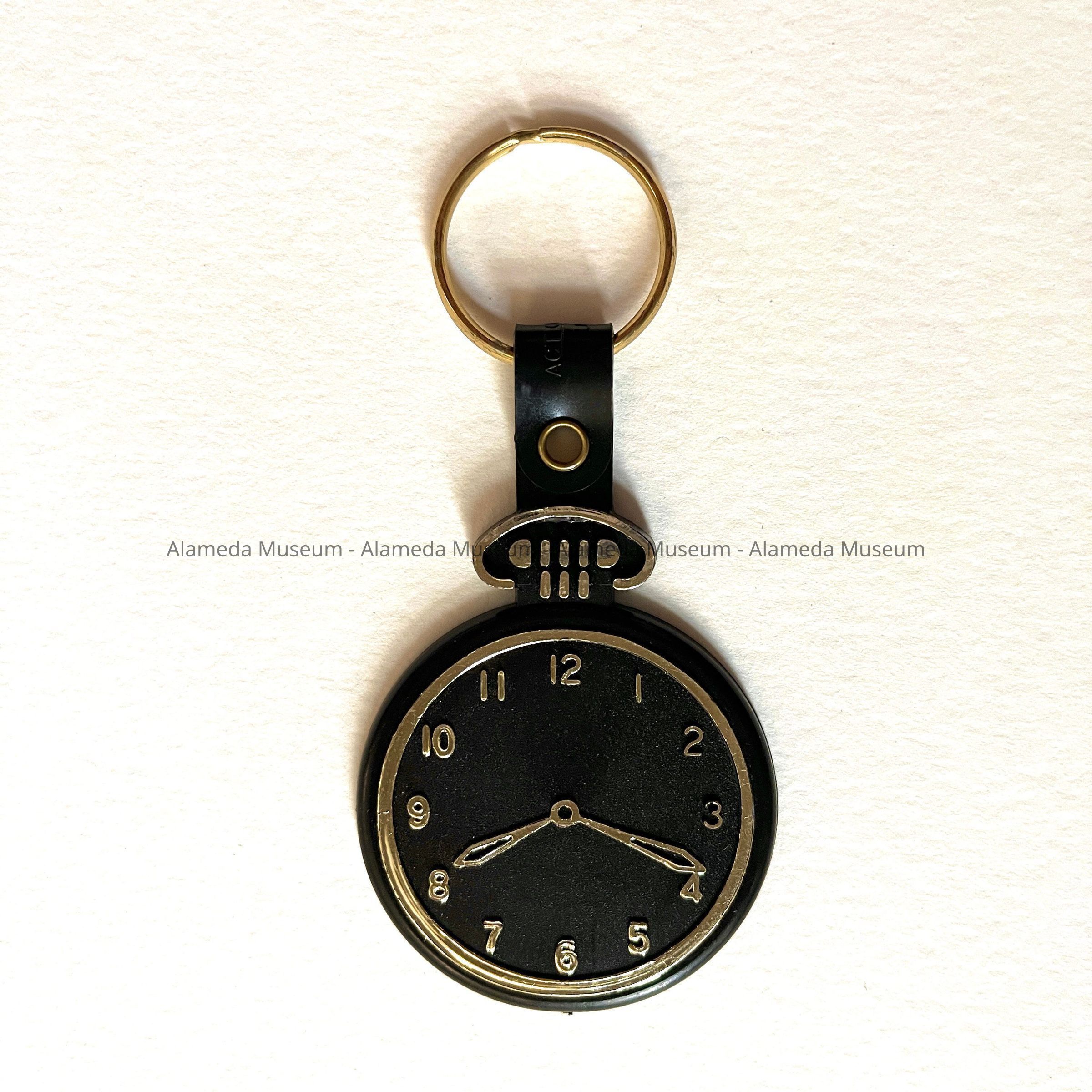 Description: A key chain composed of a metal split ring, and plastic tag in the shape of a watch with embossed design picked out in gold-colored paint, attached with a section of more flexible plastic. On the back of the 'watch' is a design of two right hands holding each other and the text: 'IT'S TIME TO SAY THANKS / 15th Anniversary / MC IVER / STUDIO / 2311 A Santa Clara / Alameda CA 94501'
