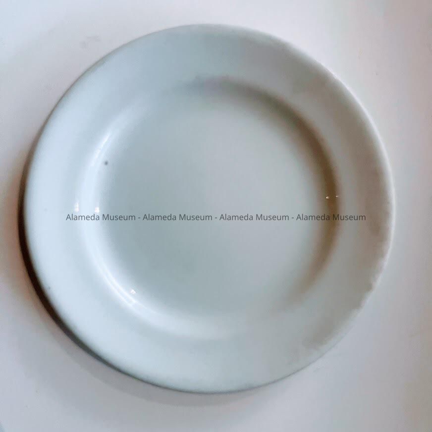 BREAD-AND-BUTTER SIZE PLATE OF UNDECORATED WHITE-COLORED SEMI-PORCELAIN IRONSTONE CHINA. REVERSE SIDE HAS BLACKCOLORED TYPE MARK, STATING, "IRONSTONE CHINA, J & G MEAKIN, HENLEY, ENGLAND."