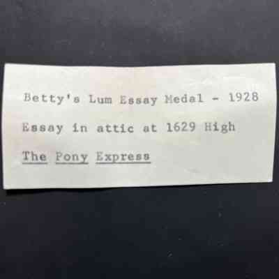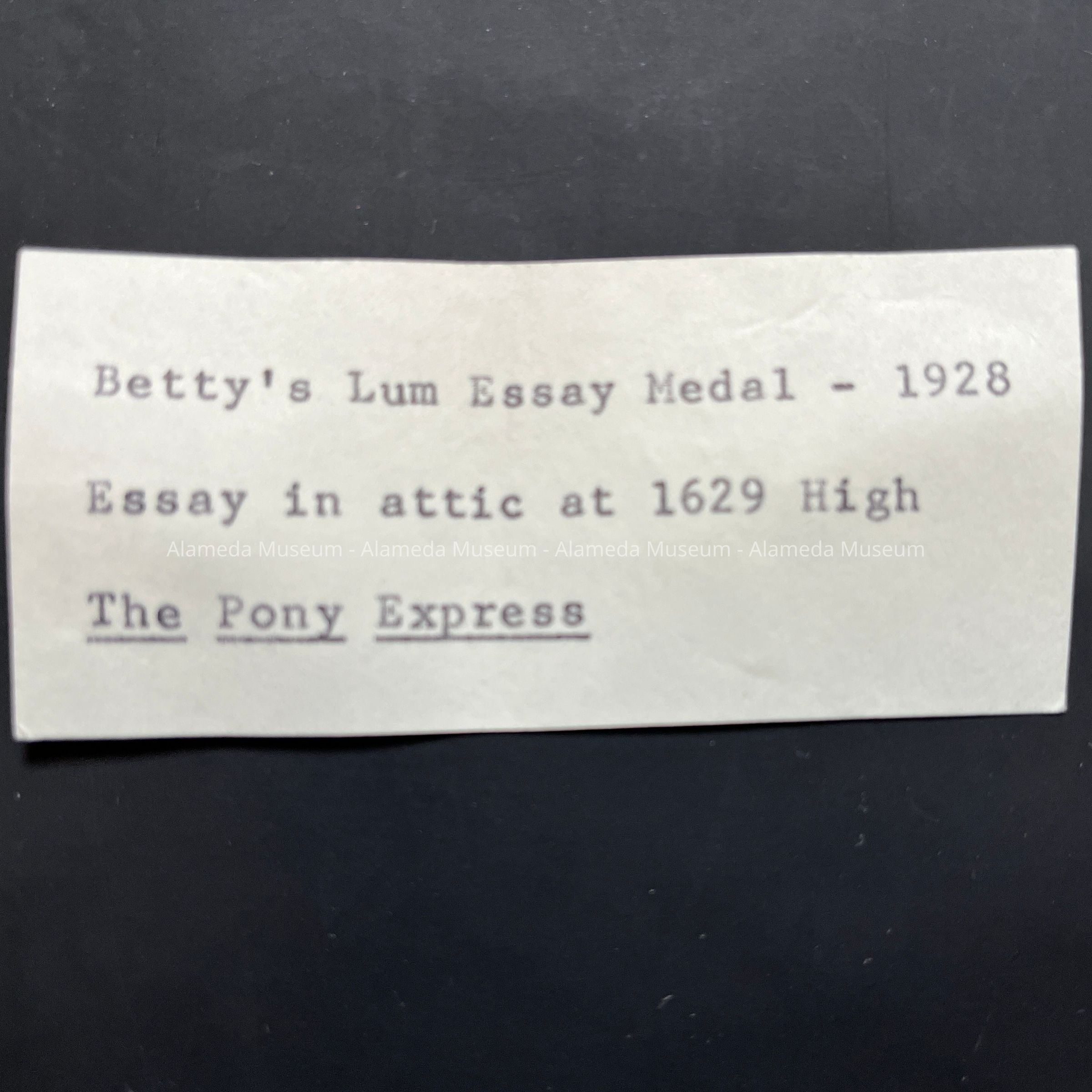 History of Object: Medal, awarded to Betty Crawford of 1629 High Street, for writing an essay called The Pony Express. Reportedly, a copy of the essay was located in the attic of 1629 High Street but has not been passed to the museum. Betty Crawford was a descendent of W.P. Dillon, early resident of Alameda. She married Richard McIntosh and went to live at 1629 High Street. Betty died in 2006.