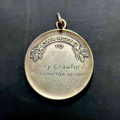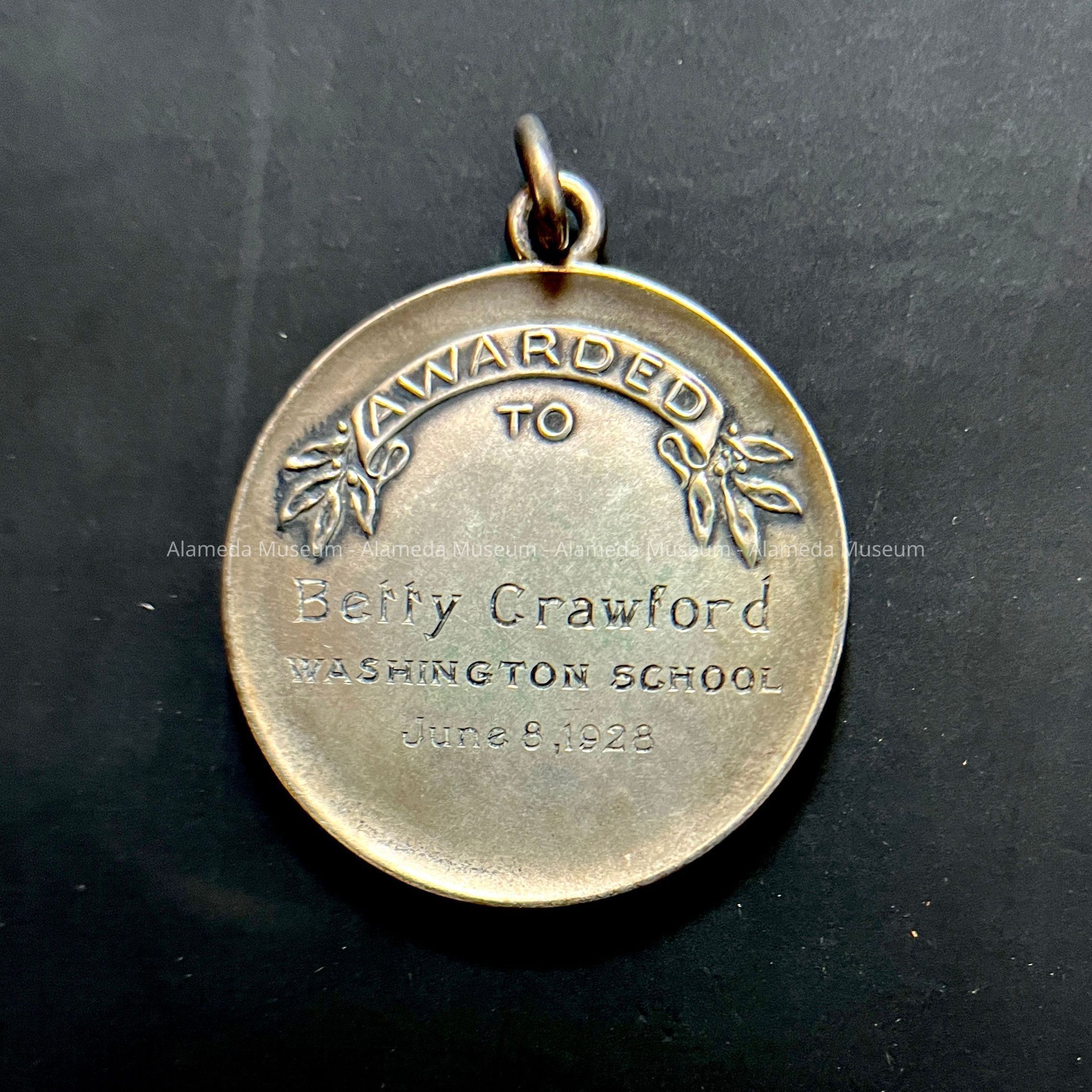 Description: a circular metal medal, with one attached chain link, with on the front, a design of symbols of wisdom and honor - eagle with spread wings, laurel branch, a globe, rays of light, and a book. Text in an arch around top half: ‘Alameda Grammar Schools’ and horizontally at bottom half: ‘American History Contest’. Reverse has machine-embossed ‘Awarded to’, and engraved: ‘Betty Crawford / WASHINGTON SCHOOL / June 8,1928’.
