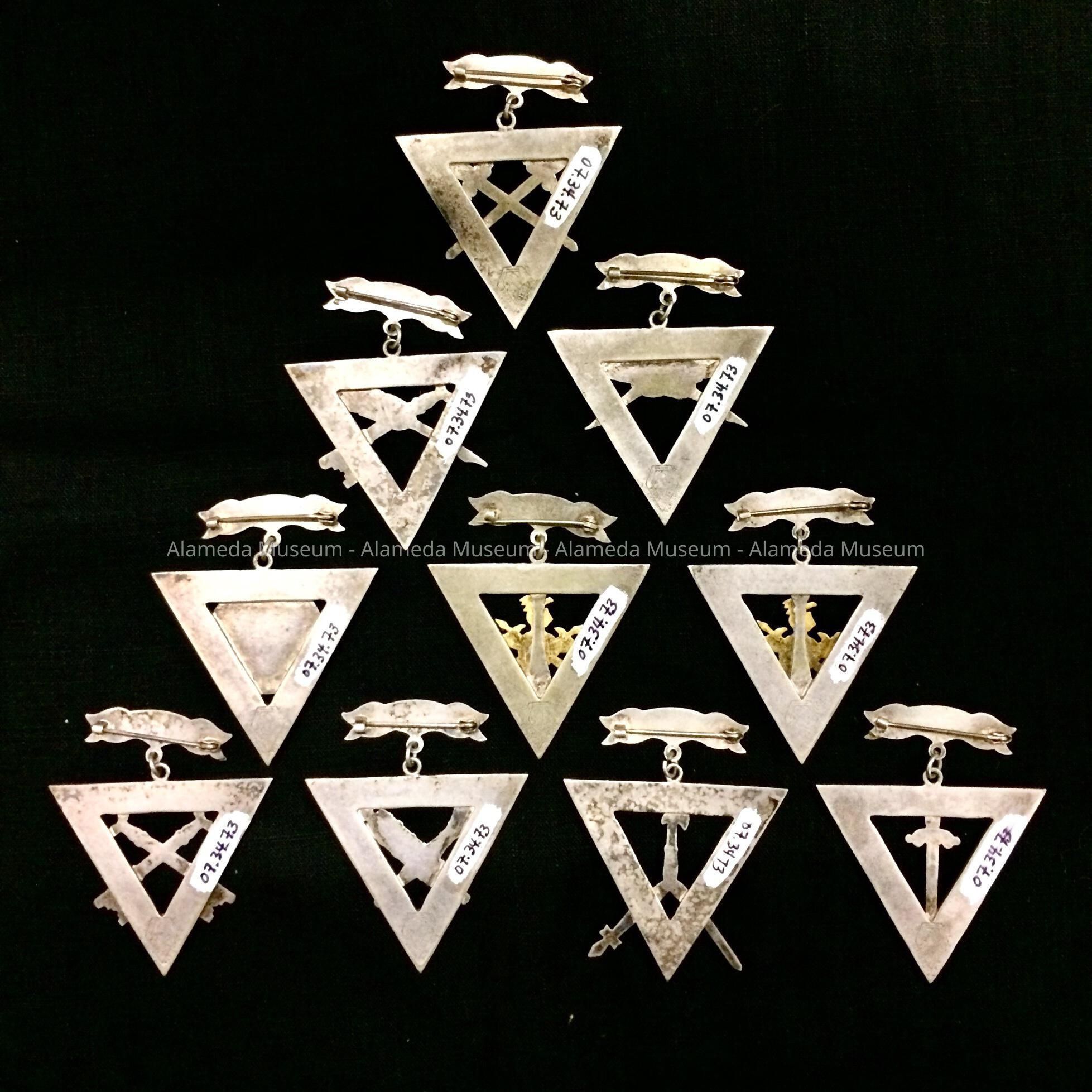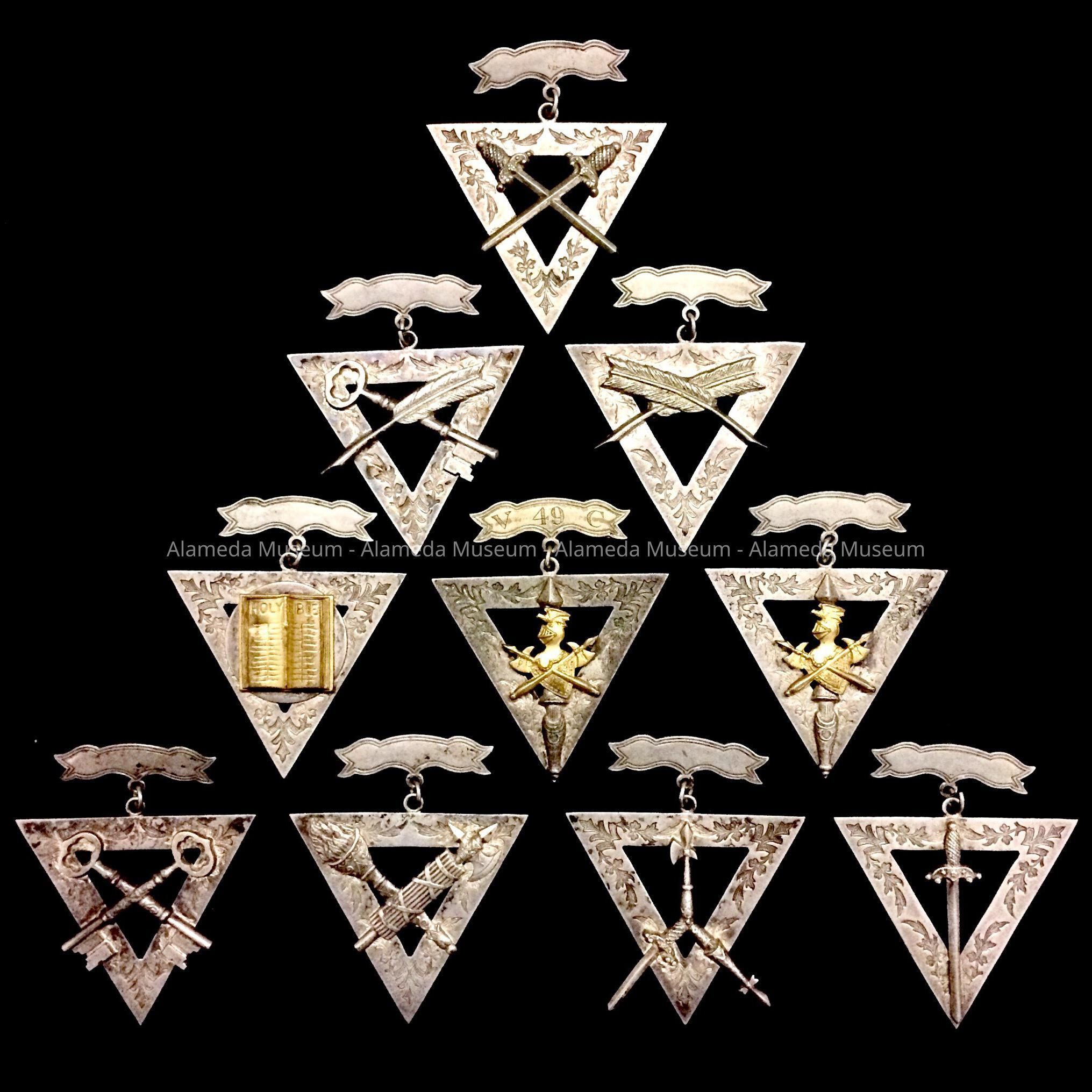 TRIANGULAR-SHAPED GERMAN SILVER MEDALS. ETCHED PATTERNS OF LEAVES, ETC. ARE ON EACH MEDAL WHICH ALSO HAS ITS OWN INDIVIDUAL EMBLEM --- QUILLS, PENS, SWORDS, KEYS, ETC.