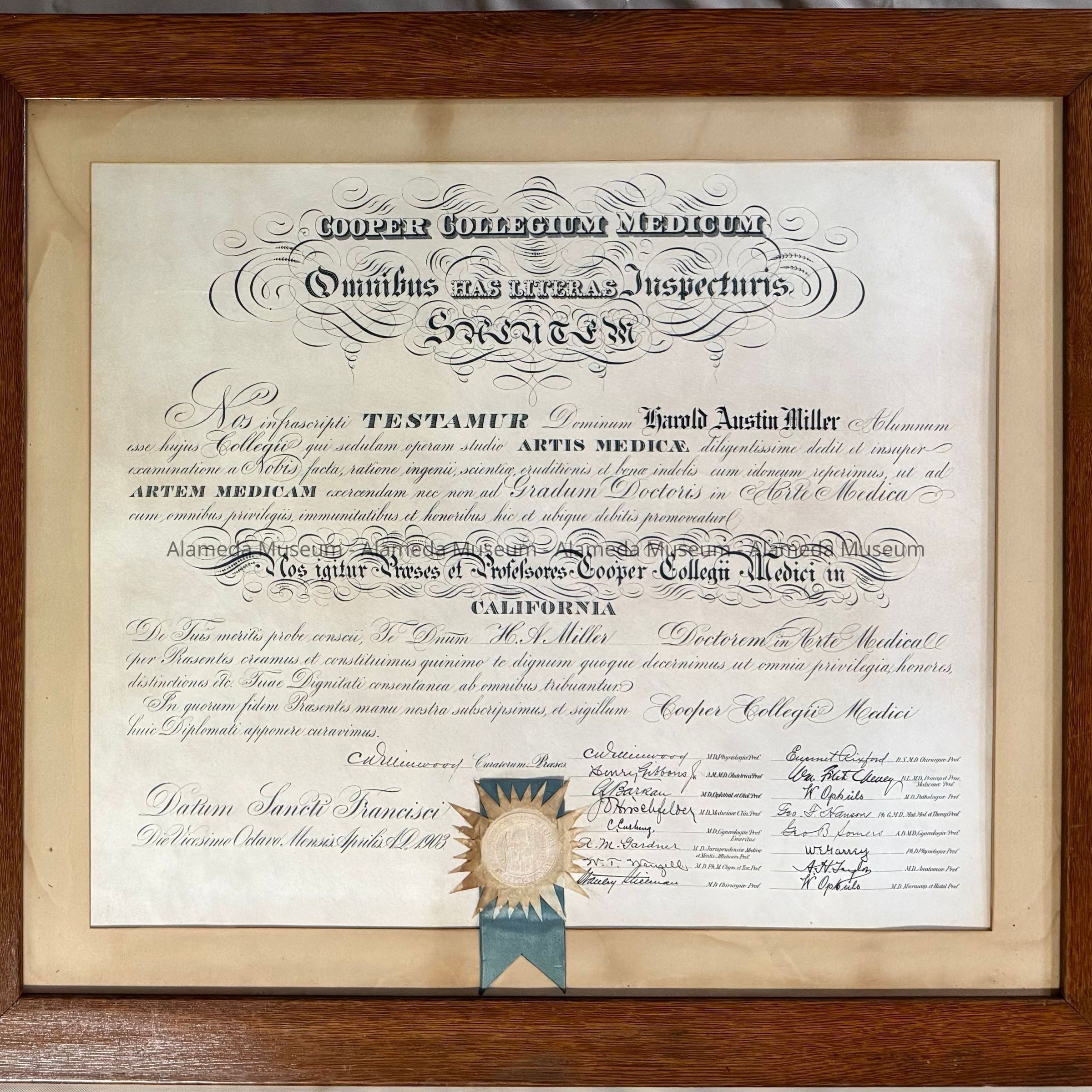 History of Object: Medical certificate (diploma) awarded Harold Austin Miller, graduate of Cooper Medical College, San Francisco, 1903. Dr. Miller practiced medicine in Alameda for many years and lived at 740 Santa Clara Avenue (corner Page Street) in a house he had built in 1911. He was the father of the late Mary Romanowitz, former secretary of the Alameda Historical Society.
