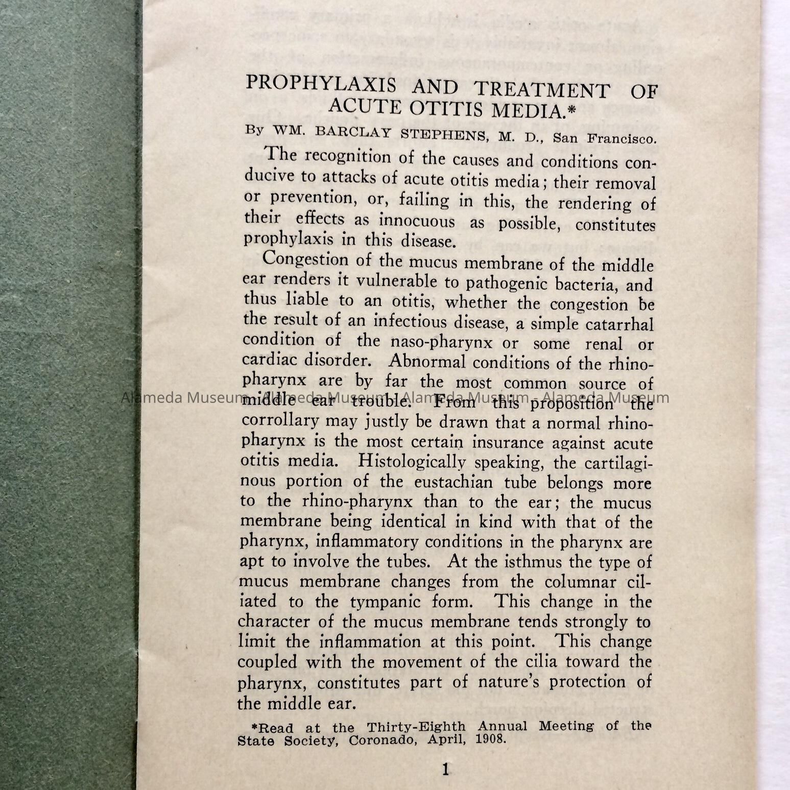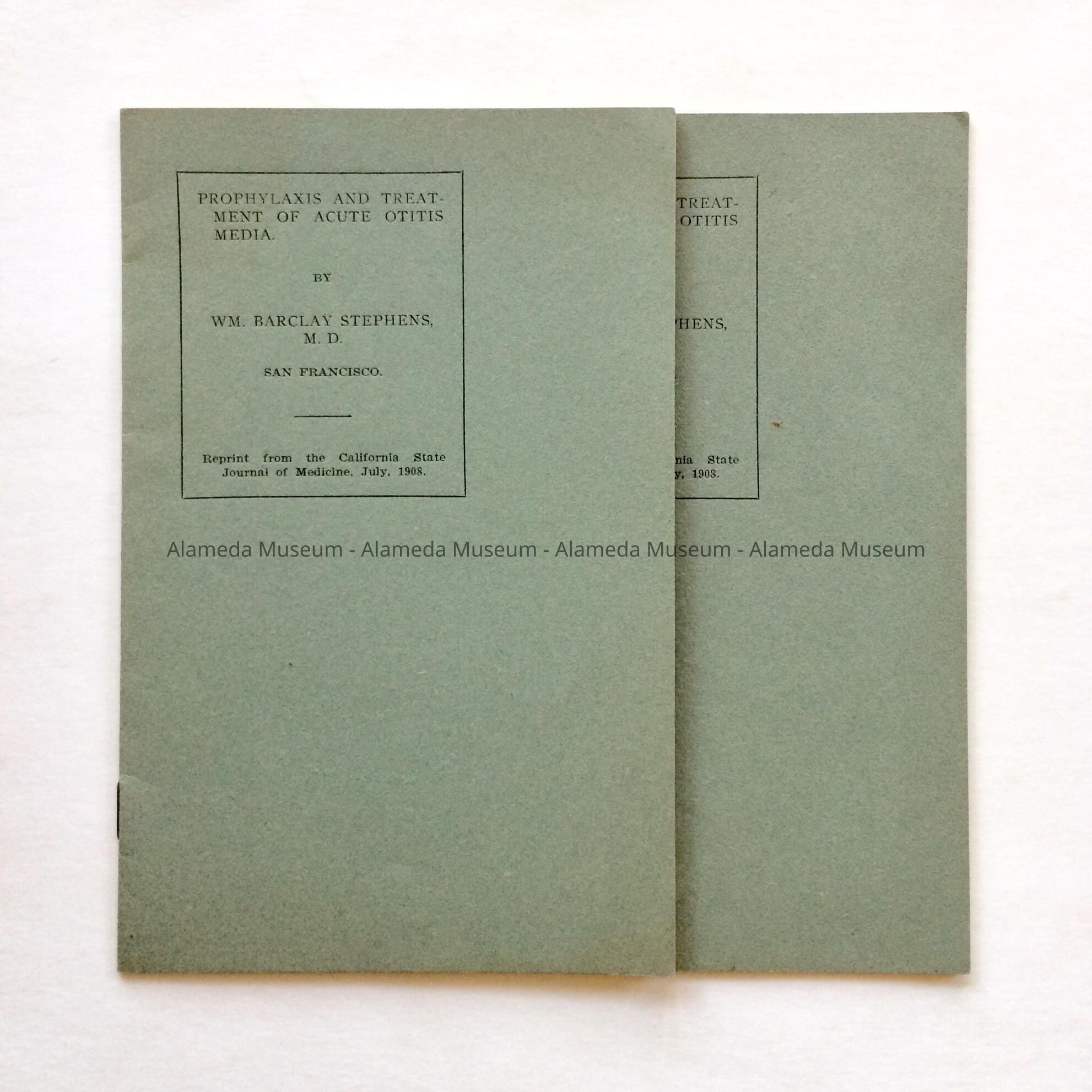 A MEDICAL PAPER ISSUED BY DR WILLIAM BARCLAY STEPHENS. PAPER WAS PUBLISHED IN THE "CALIFORNIA STATE JOURNAL OF MEDICINE" IN JULY OF 1908. DR. STEPHENS WAS A PROMINENT AND LONGTIME RESIDENT OF THE CITY OF ALAMEDA, CALIFORNIA. DR. STEPHENS WAS BORN IN PARIS, KENTUCKY ON JANUARY 4, 1869.