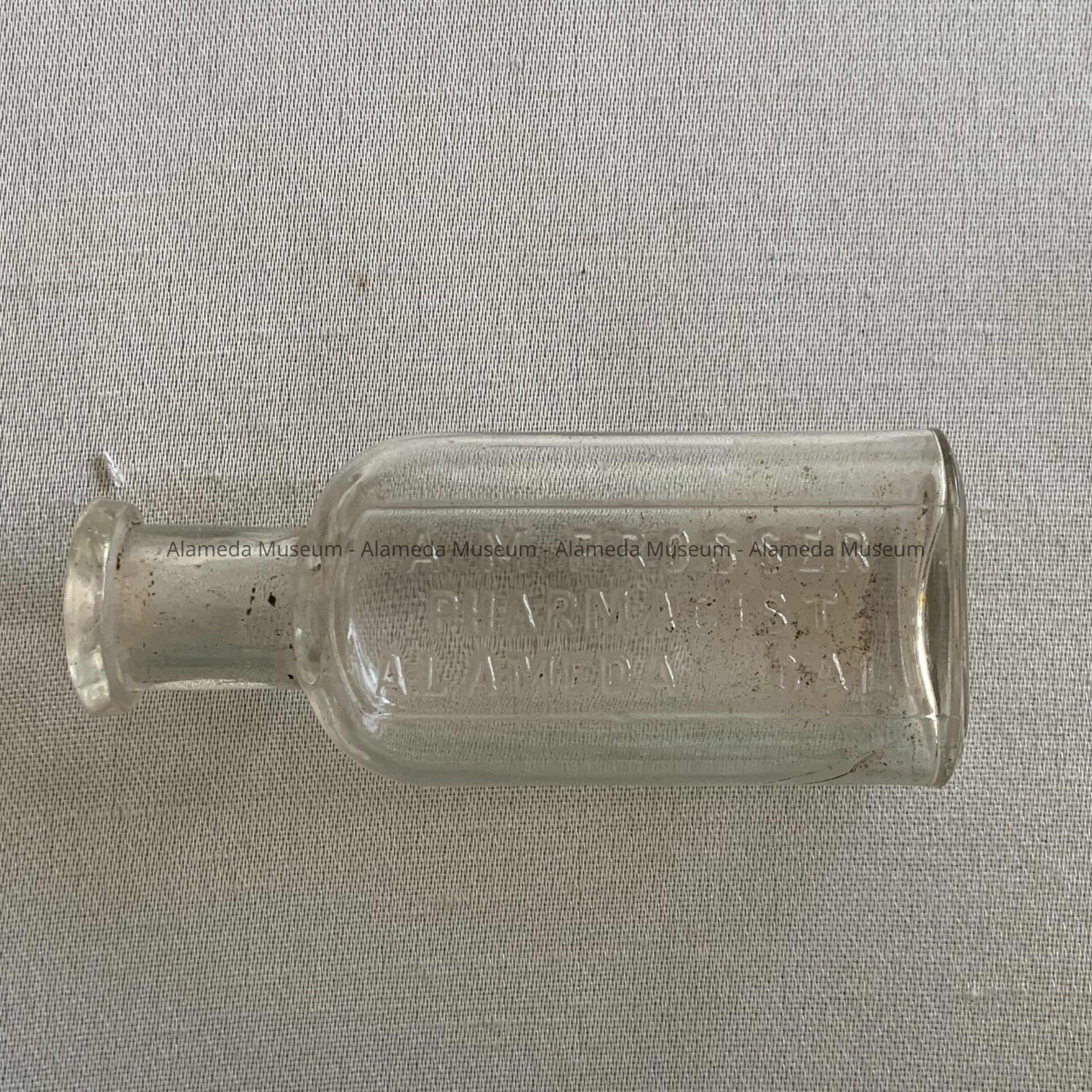 Description: Double seam clear glass medicine bottle with embossed lettering stating “A.M. Prosser Pharmacist, Alameda, Cal.” Originally had a cork stopper.