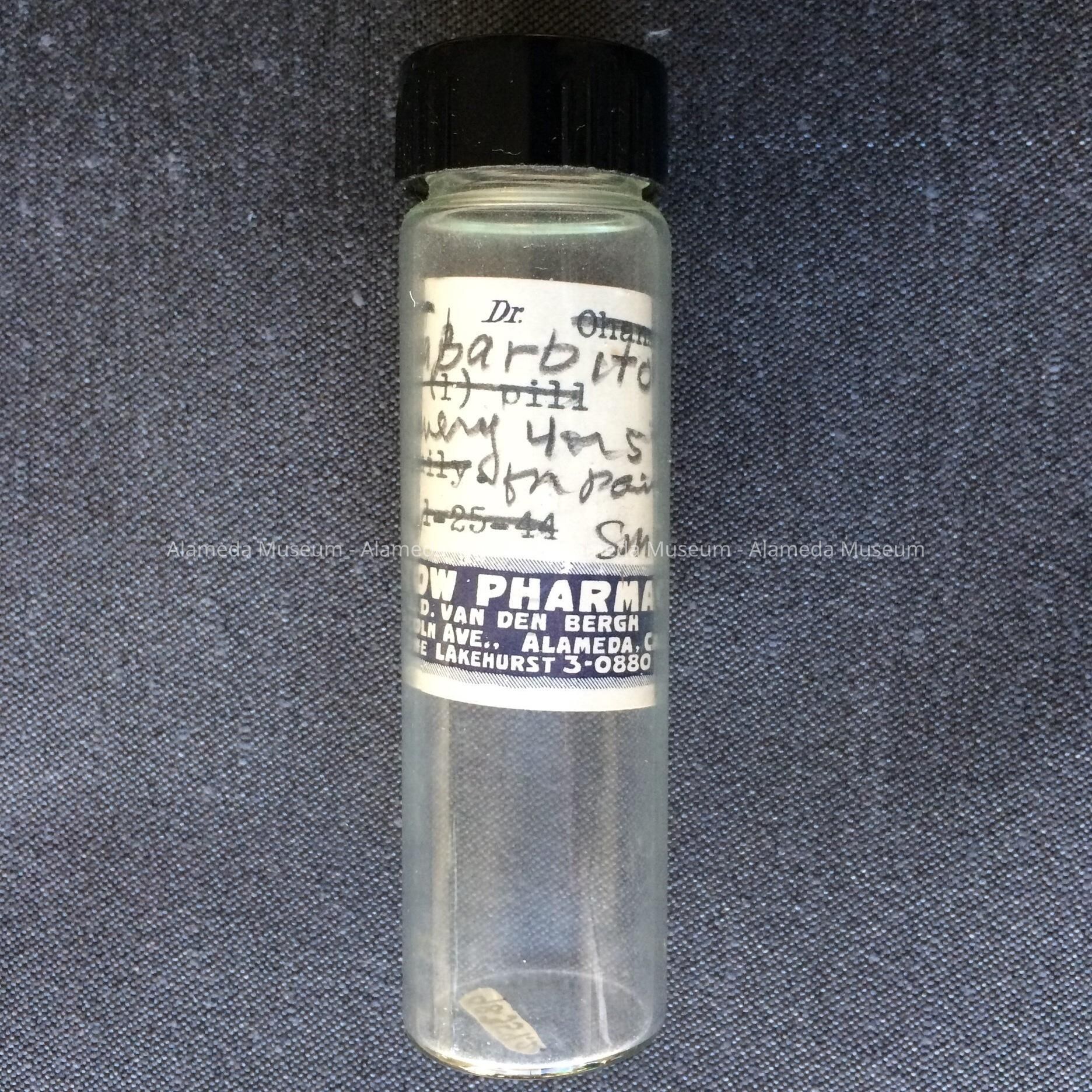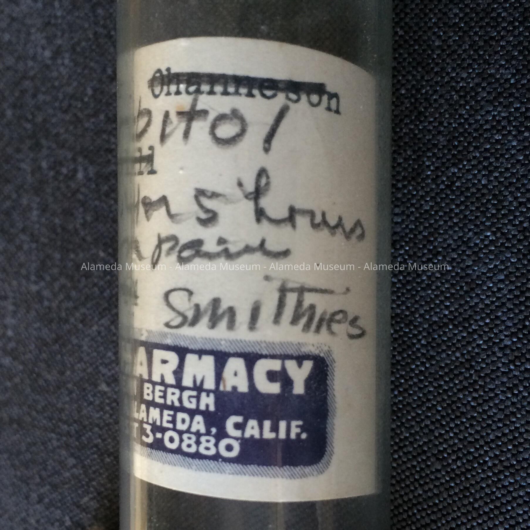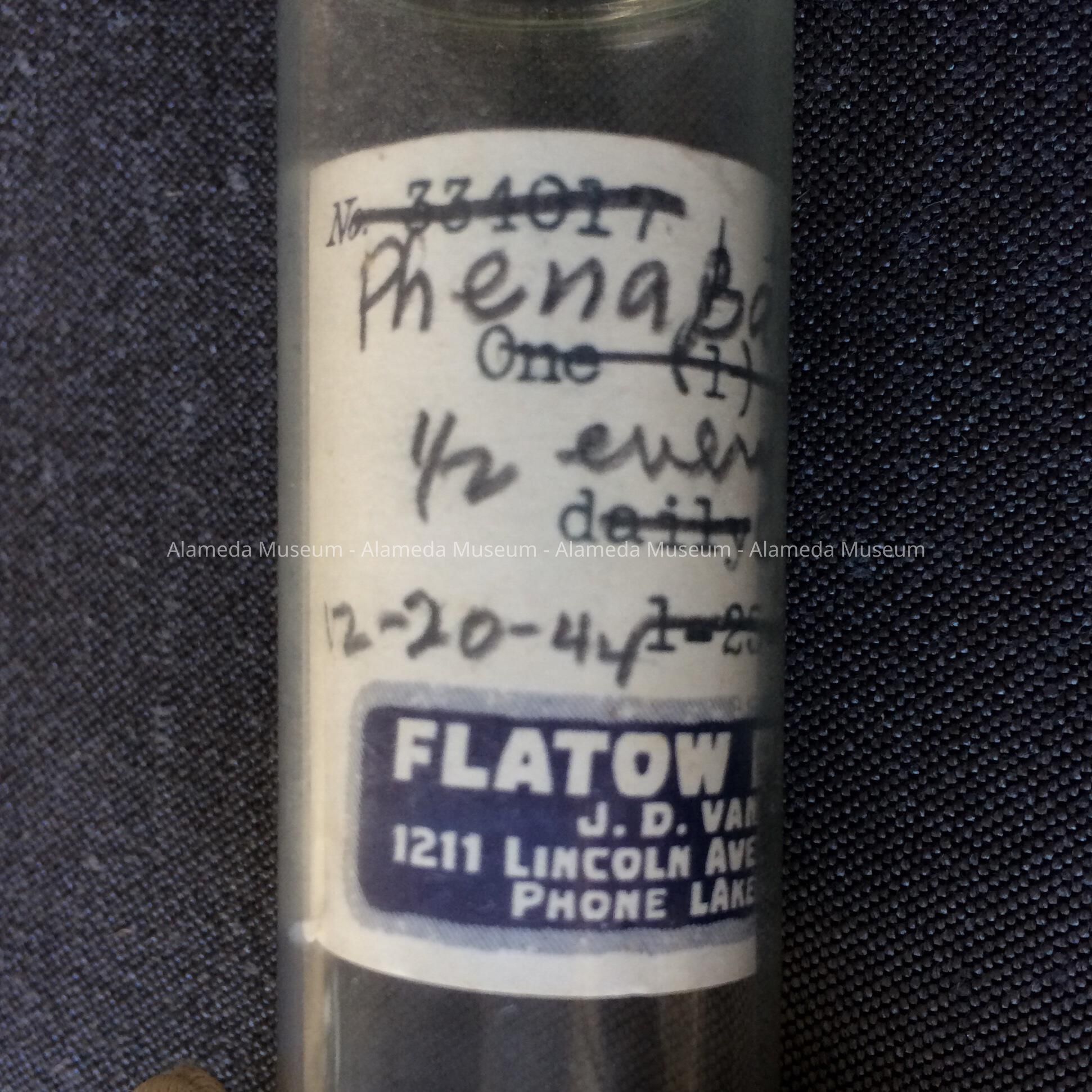 MEDICINE BOTTLE ISSUED BY FLATOW PHARMACY, 1211 LINCOLN, ALAMEDA, CALIFORNIA. TELEPHONE: LA 3-0880.