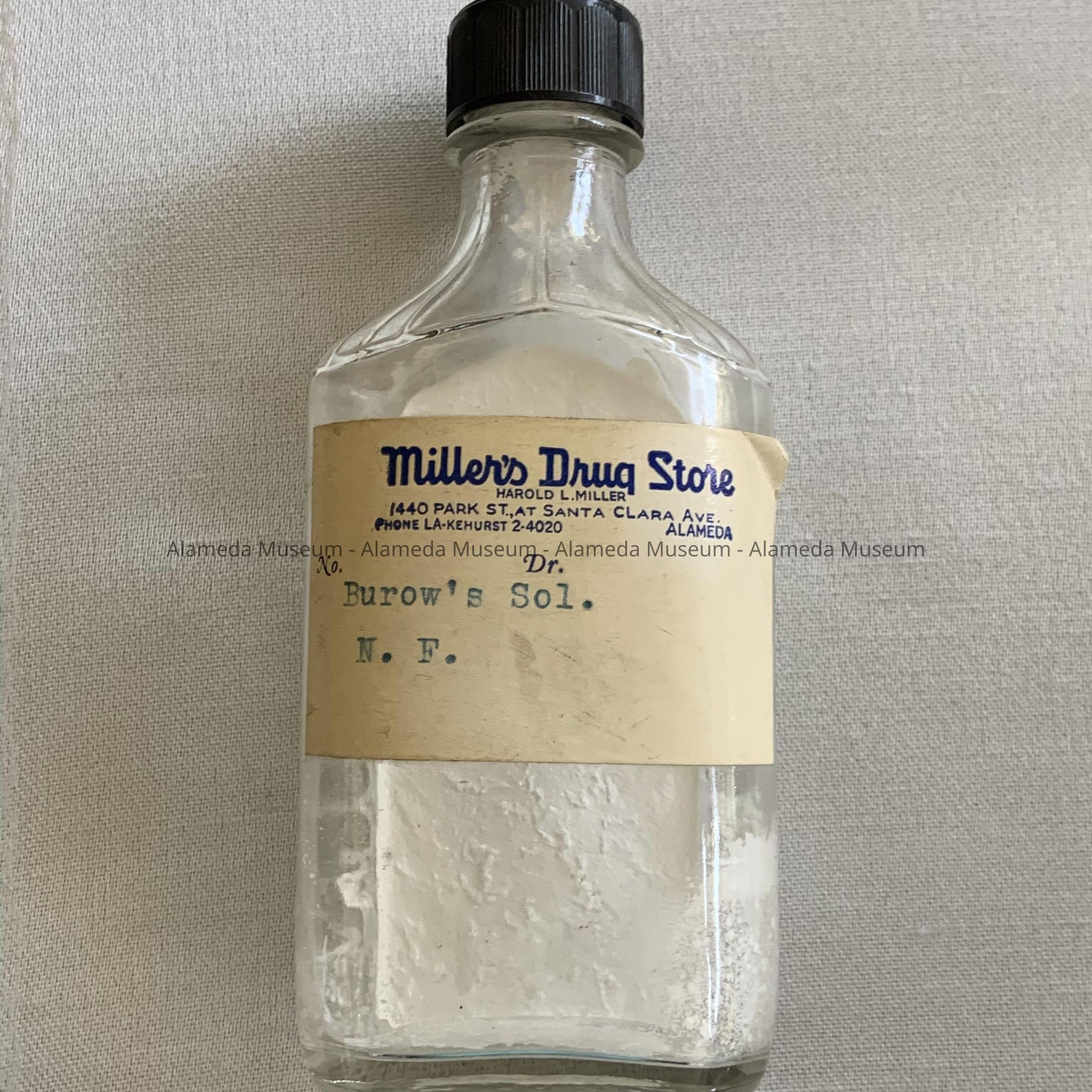 HISTORY OF OBJECT: A MEDICINE BOTTLE ISSUED BY MILLER'S DRUG STORE, 1440 PARK STREET, ALAMEDA. TELEPHONE LA 2-4020.