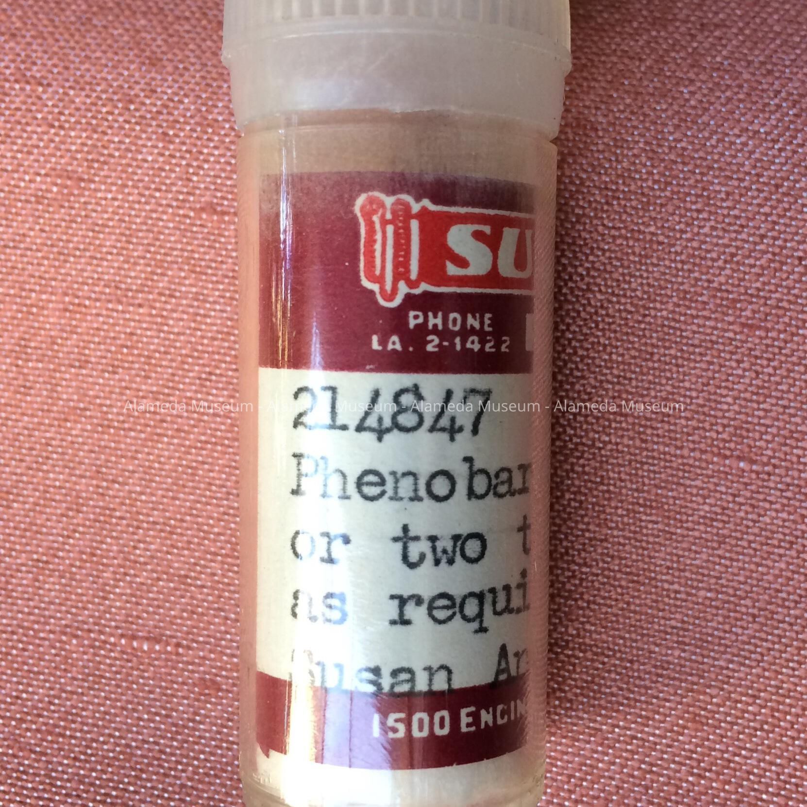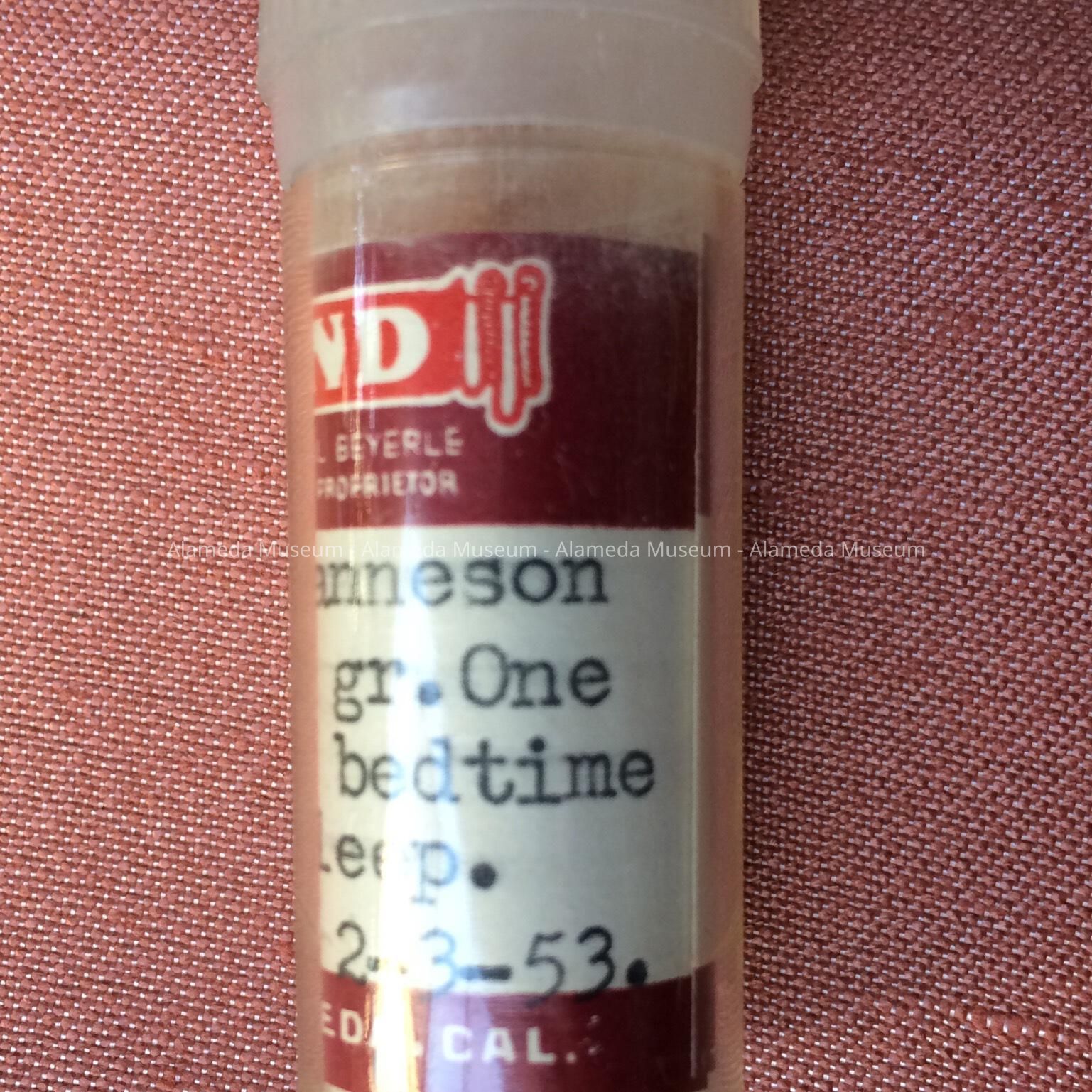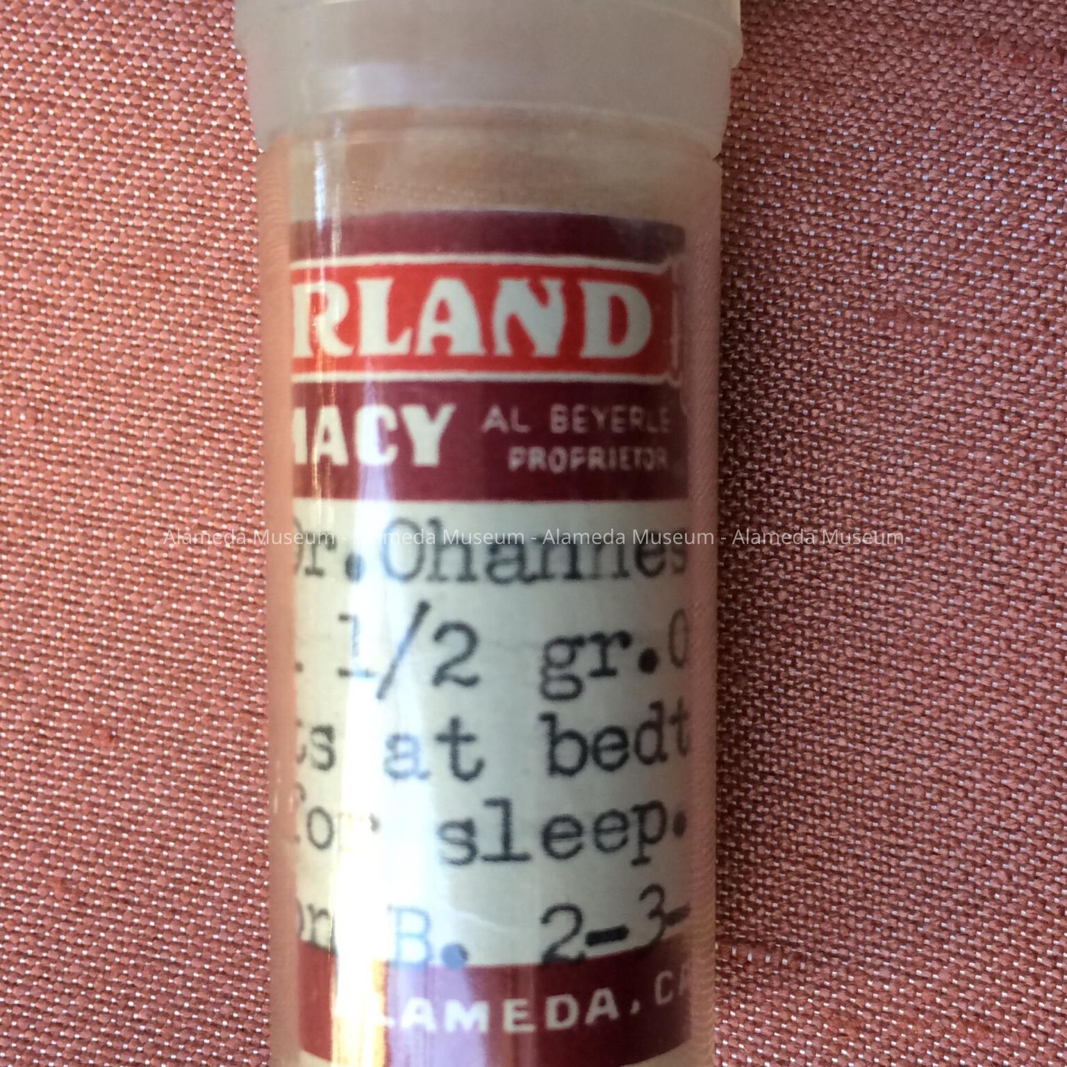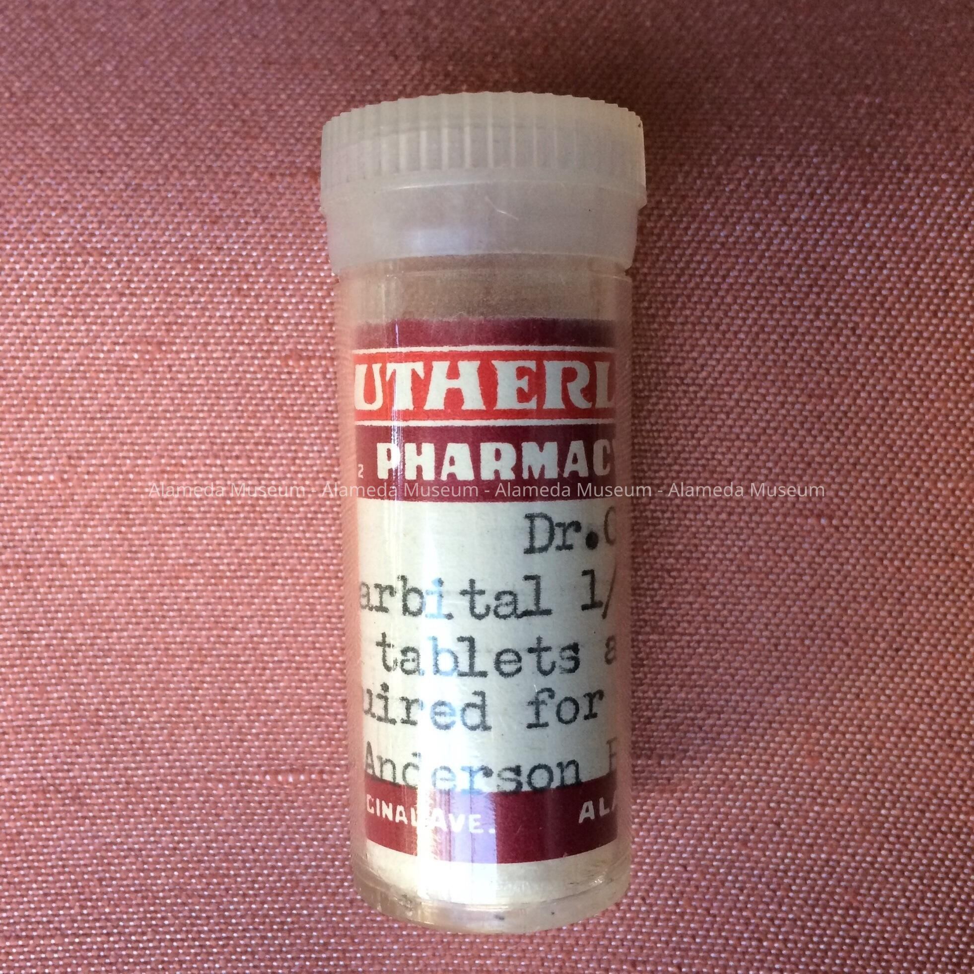 MEDICINE BOTTLE ISSUED BY SUTHERLAND PHARMACY, 1500 ENCINAL AVENUE, ALAMEDA, CA. TELEPHONE: LA 21422. DATE ON BOTTLE - FEBRUARY 3, 1953.